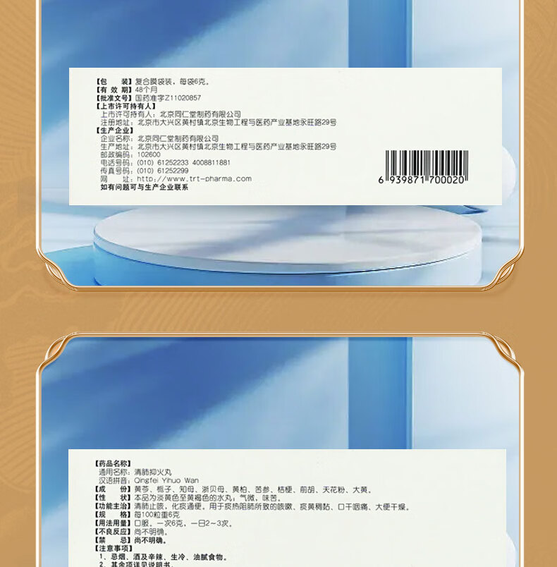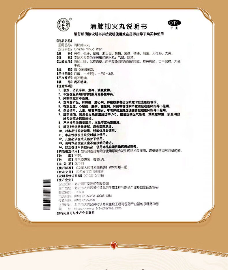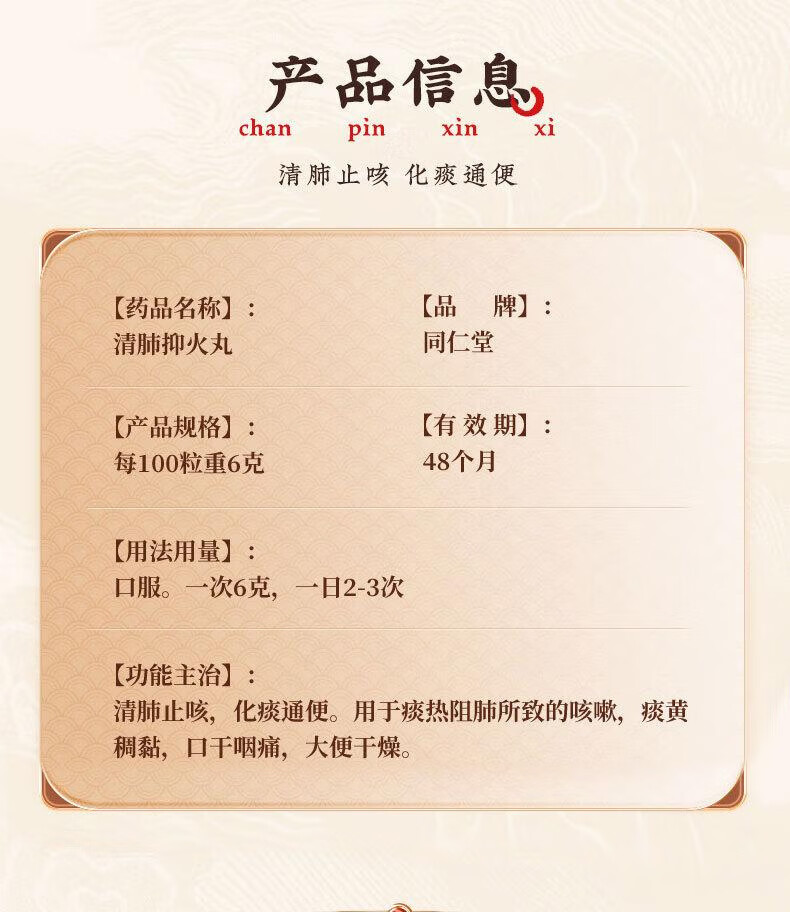 同仁堂 清肺抑火丸 6g*12袋 清肺止咳 化痰通便 北京同仁堂