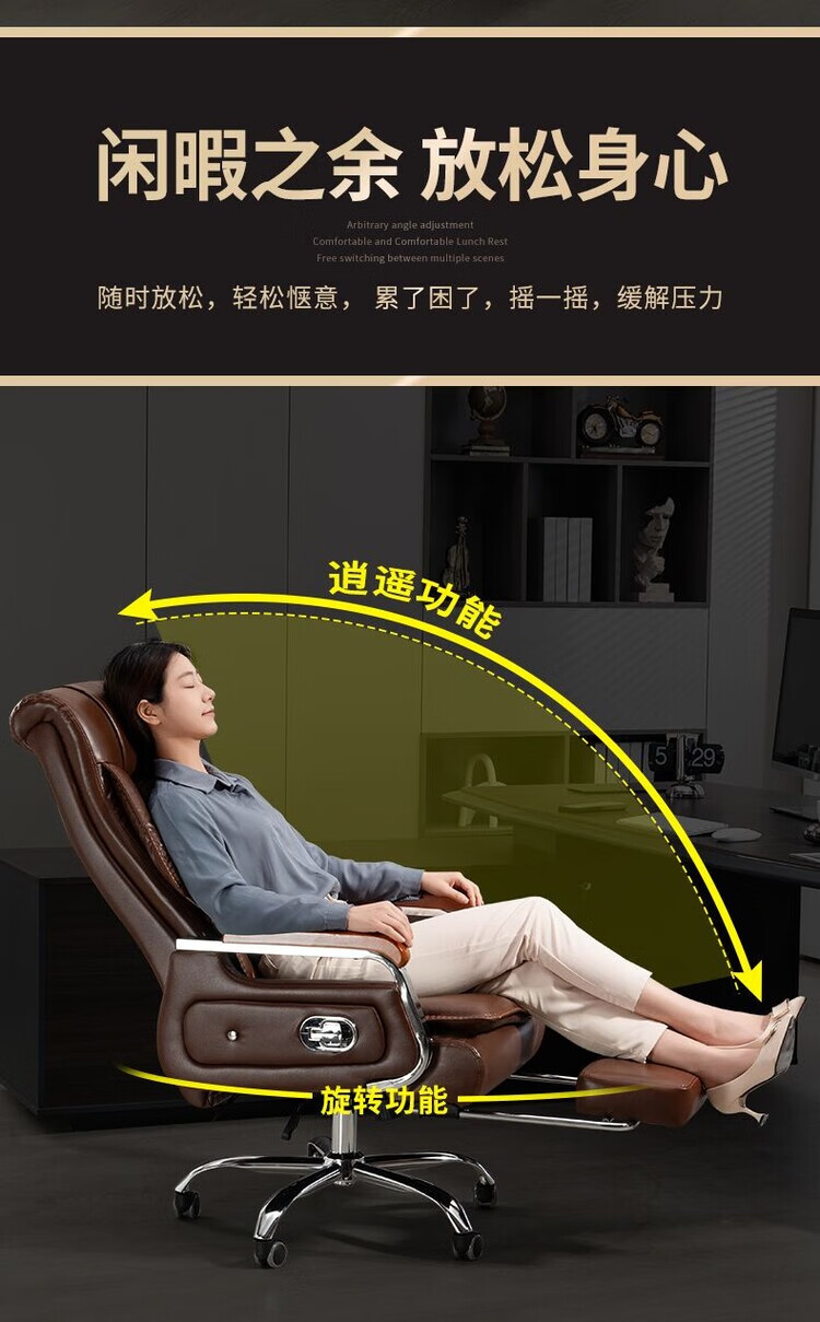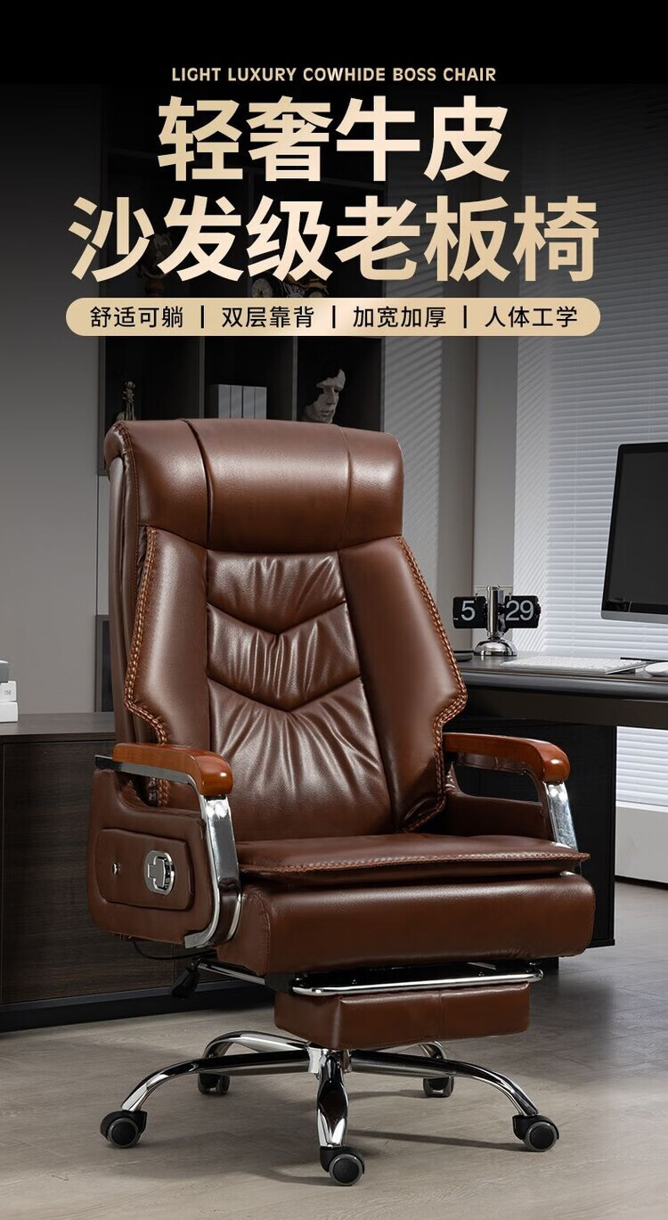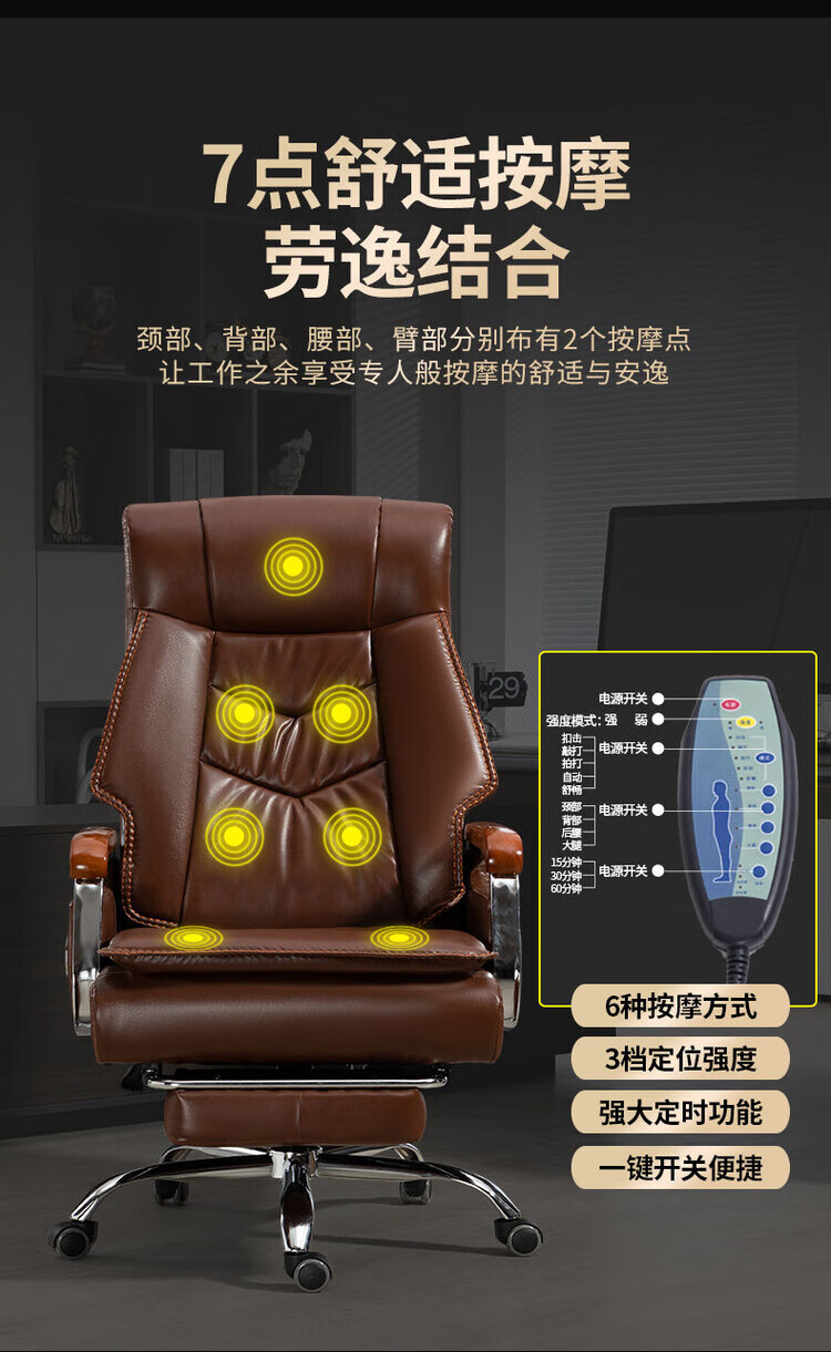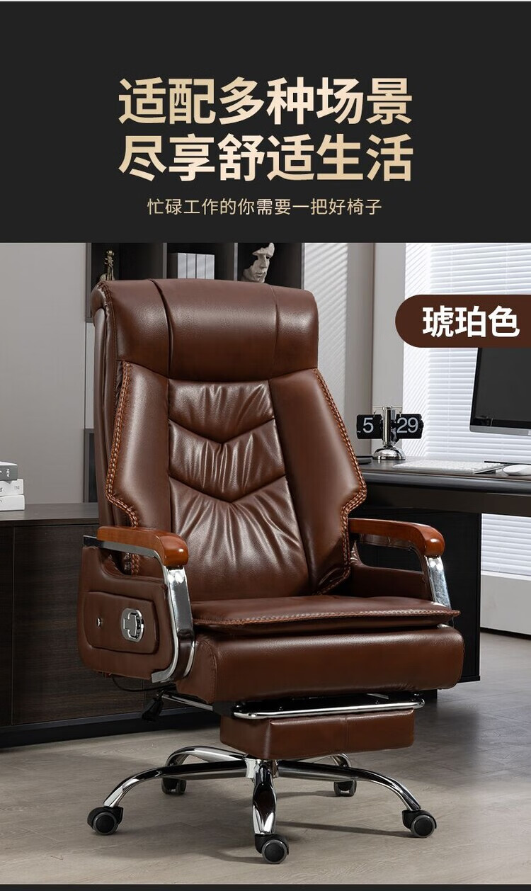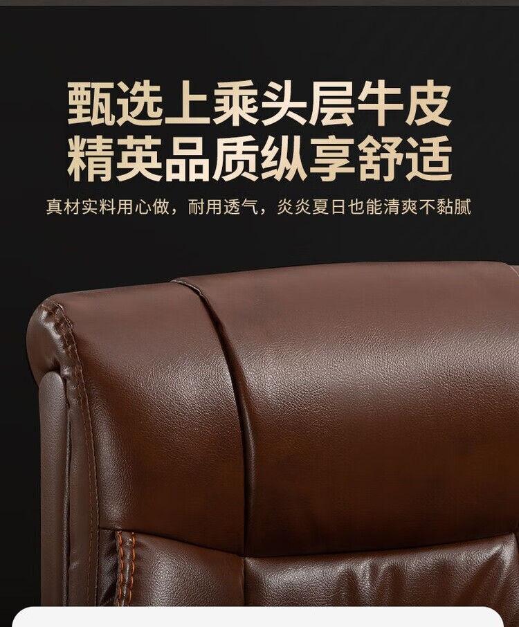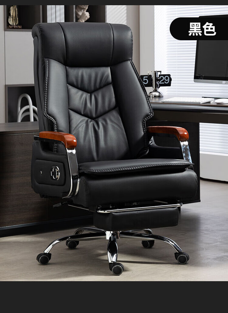 弘星隆真皮老板椅商务总裁豪华办公椅子牛皮按摩座椅可躺电脑椅家用 经典黑PU皮-无搁脚 钢制脚