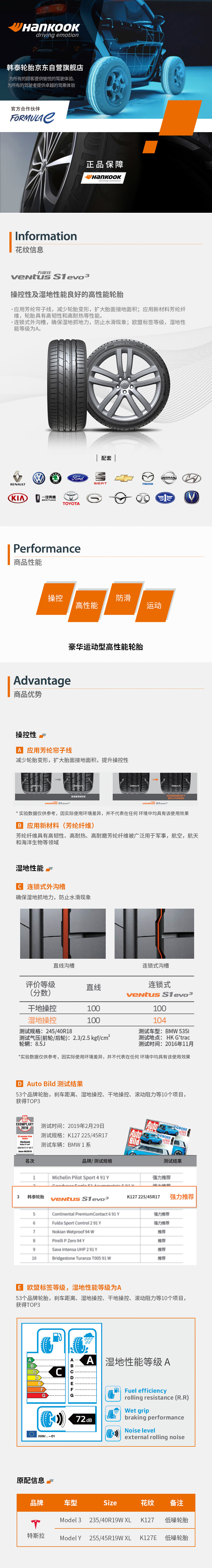 韩泰(Hankook)汽车轮胎 255/45R19 104W K127E T1 静音棉轮胎 原配特斯拉ModelY
