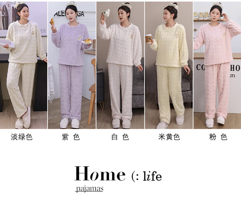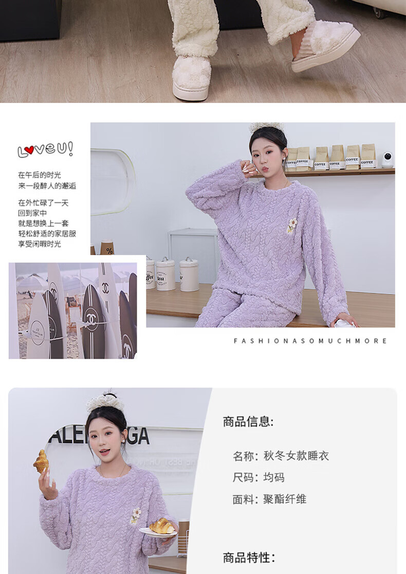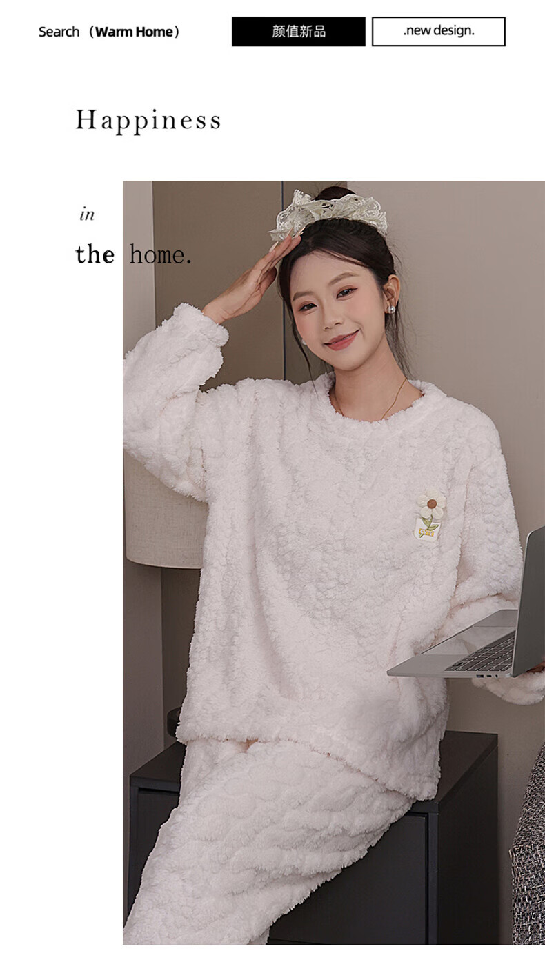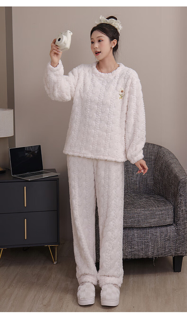 宝娜斯(BONAS)新款小花朵珊瑚绒睡衣女冬季长袖家居服套装加绒加厚保暖睡衣秋冬 白色 均码 80-140斤