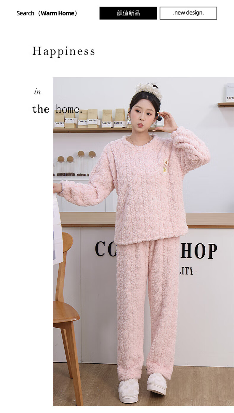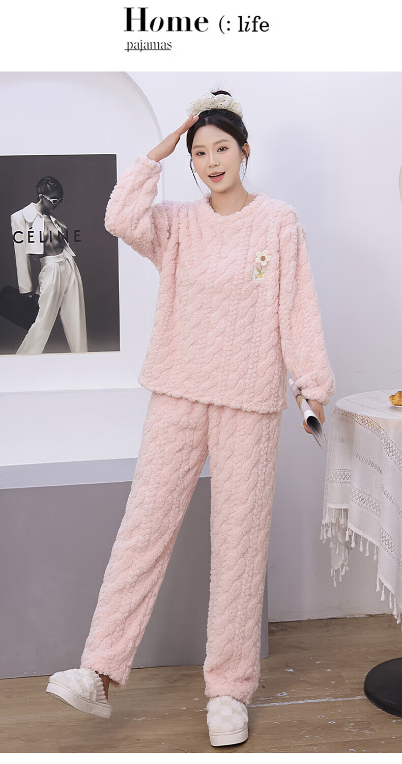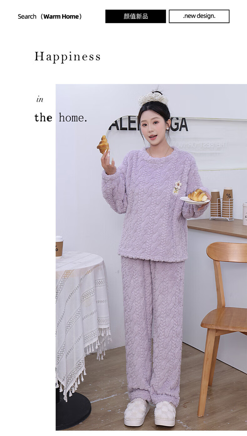 宝娜斯(BONAS)新款小花朵珊瑚绒睡衣女冬季长袖家居服套装加绒加厚保暖睡衣秋冬 白色 均码 80-140斤