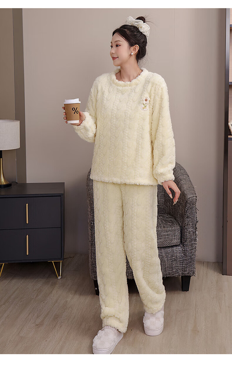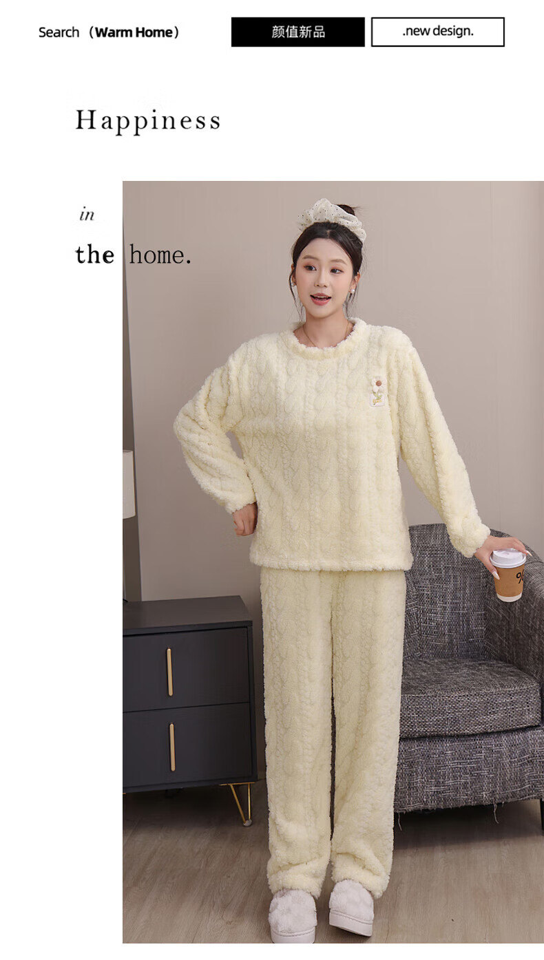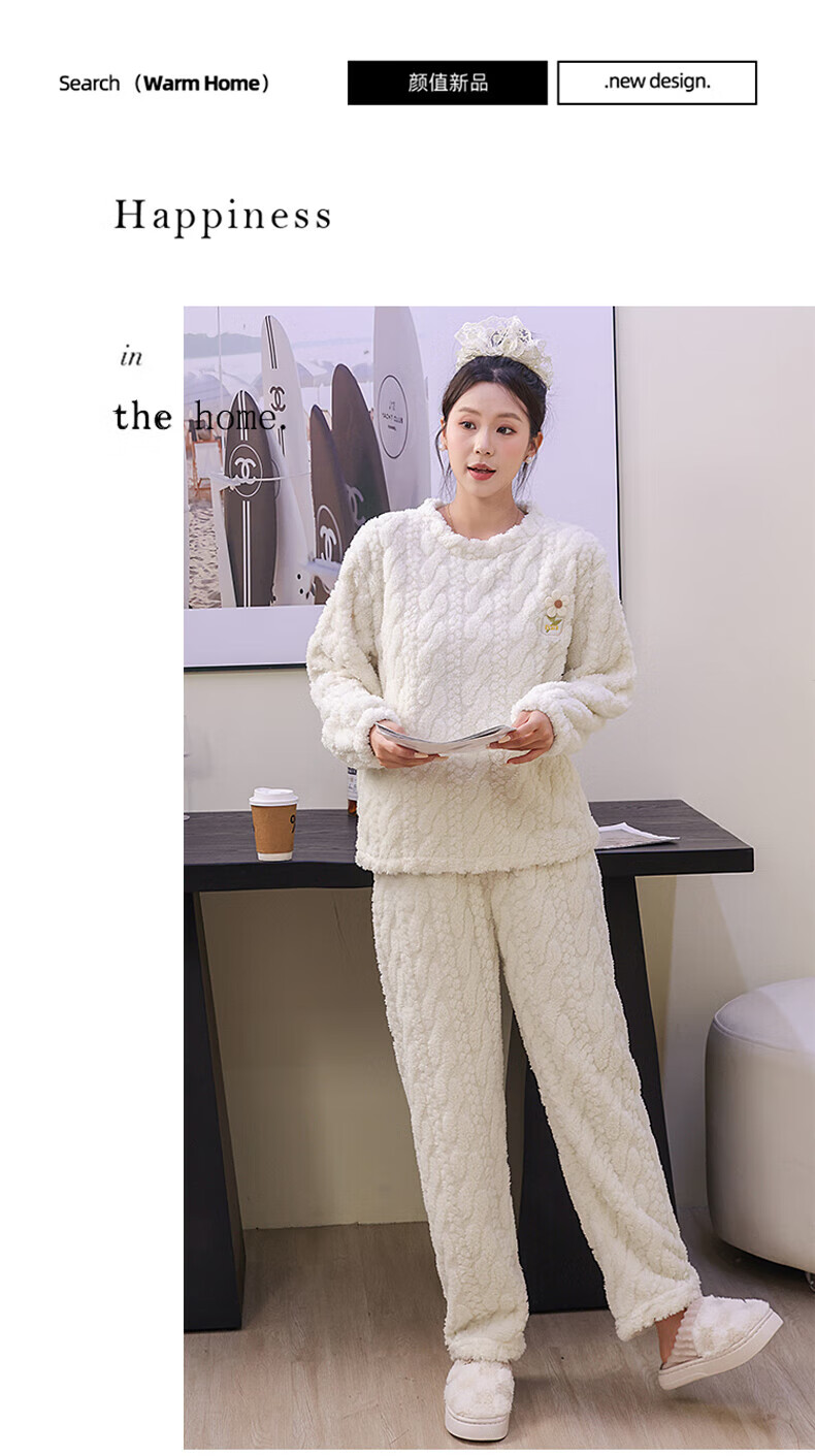 幸棉(LUCKMEEY)女秋冬家居服菱格麻花长毛绒情侣套装可外穿保暖柔软长袖圆领睡衣 奶油白(女款) L (女100-130斤/男100-130斤)