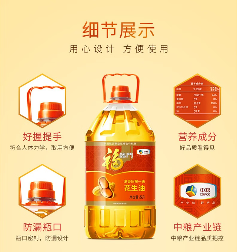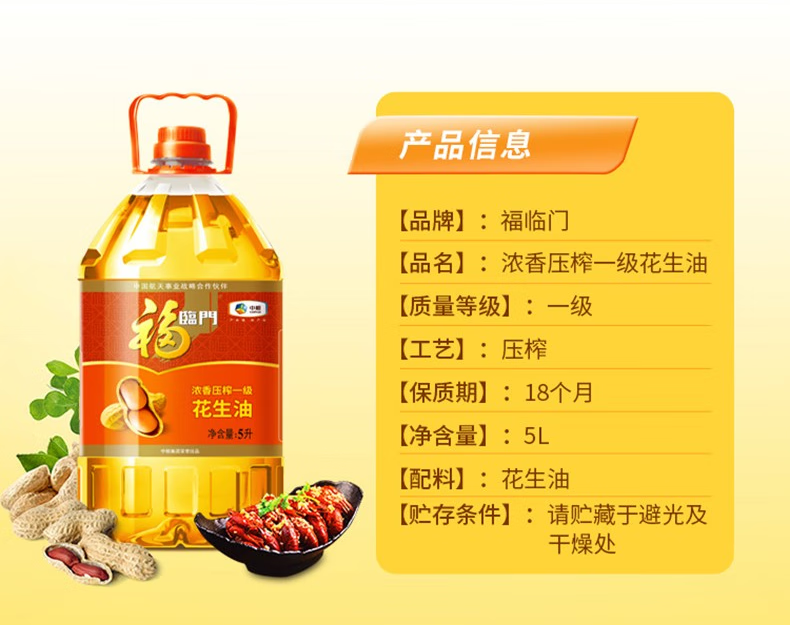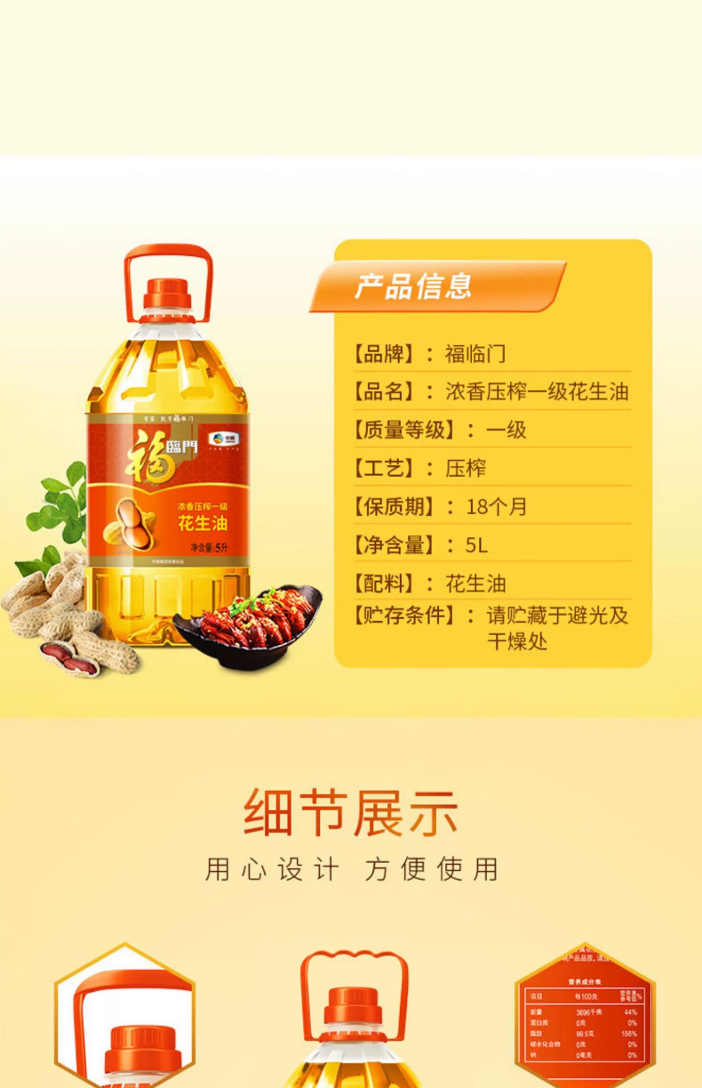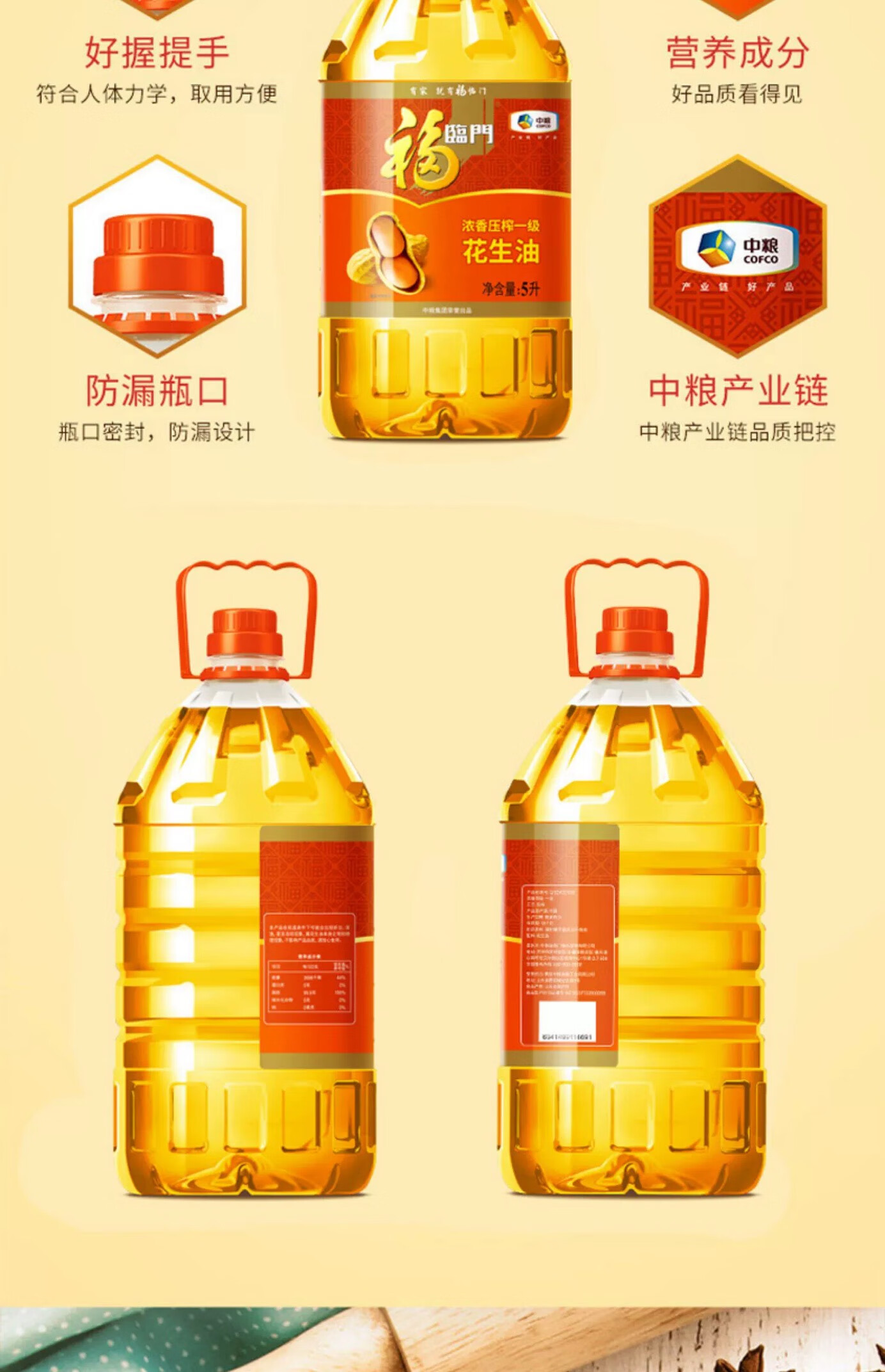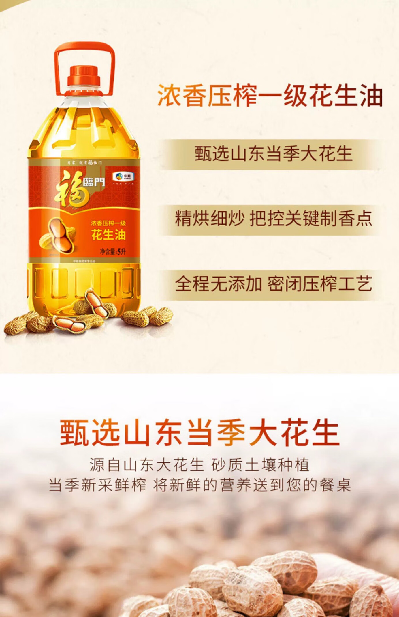 福临门浓香压榨一级花生油食用油 中粮出品家庭烹饪植物油 团购灵活开票 优选压榨一级花生油5L