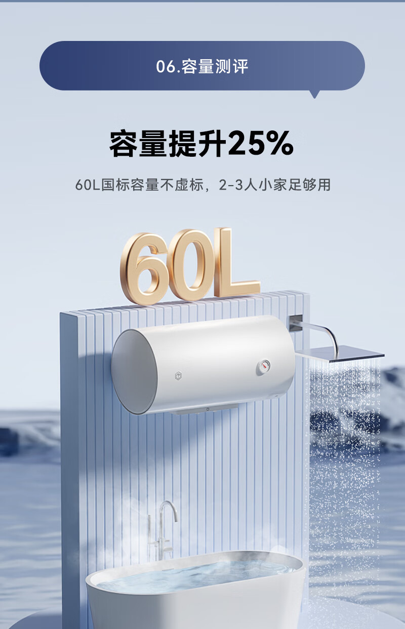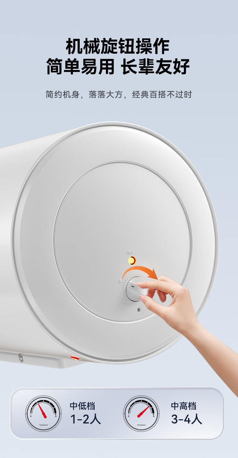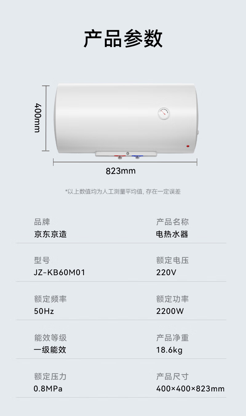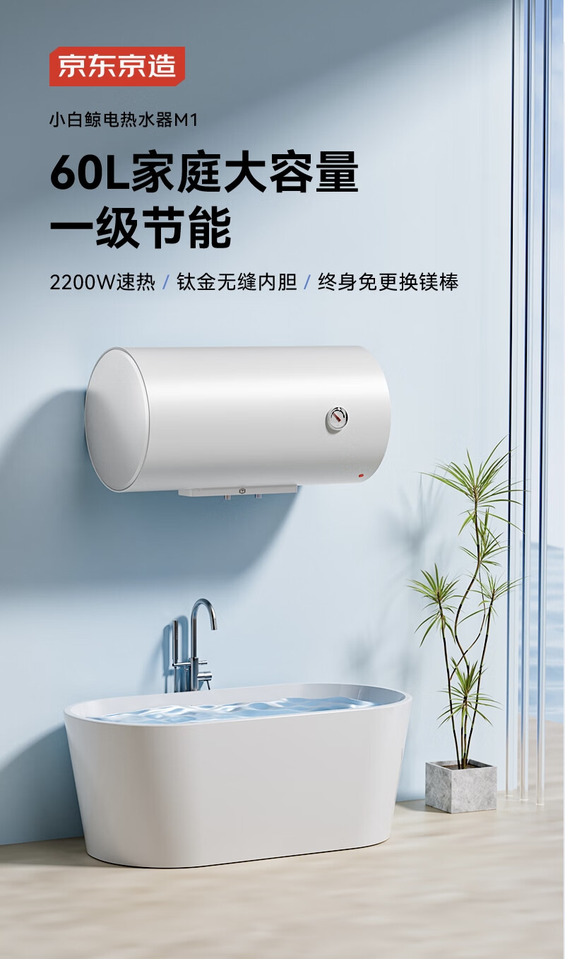 京东京造60升电热水器 钛金加厚无缝胆 一级能效 免换镁棒 2200W大水量专利防电墙JZ-KB60M01