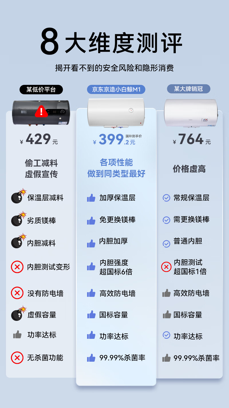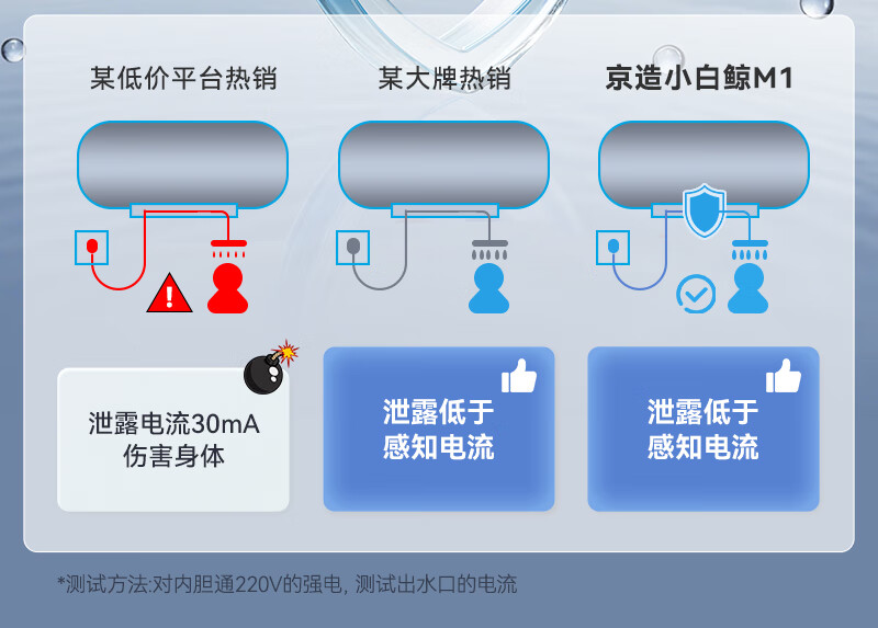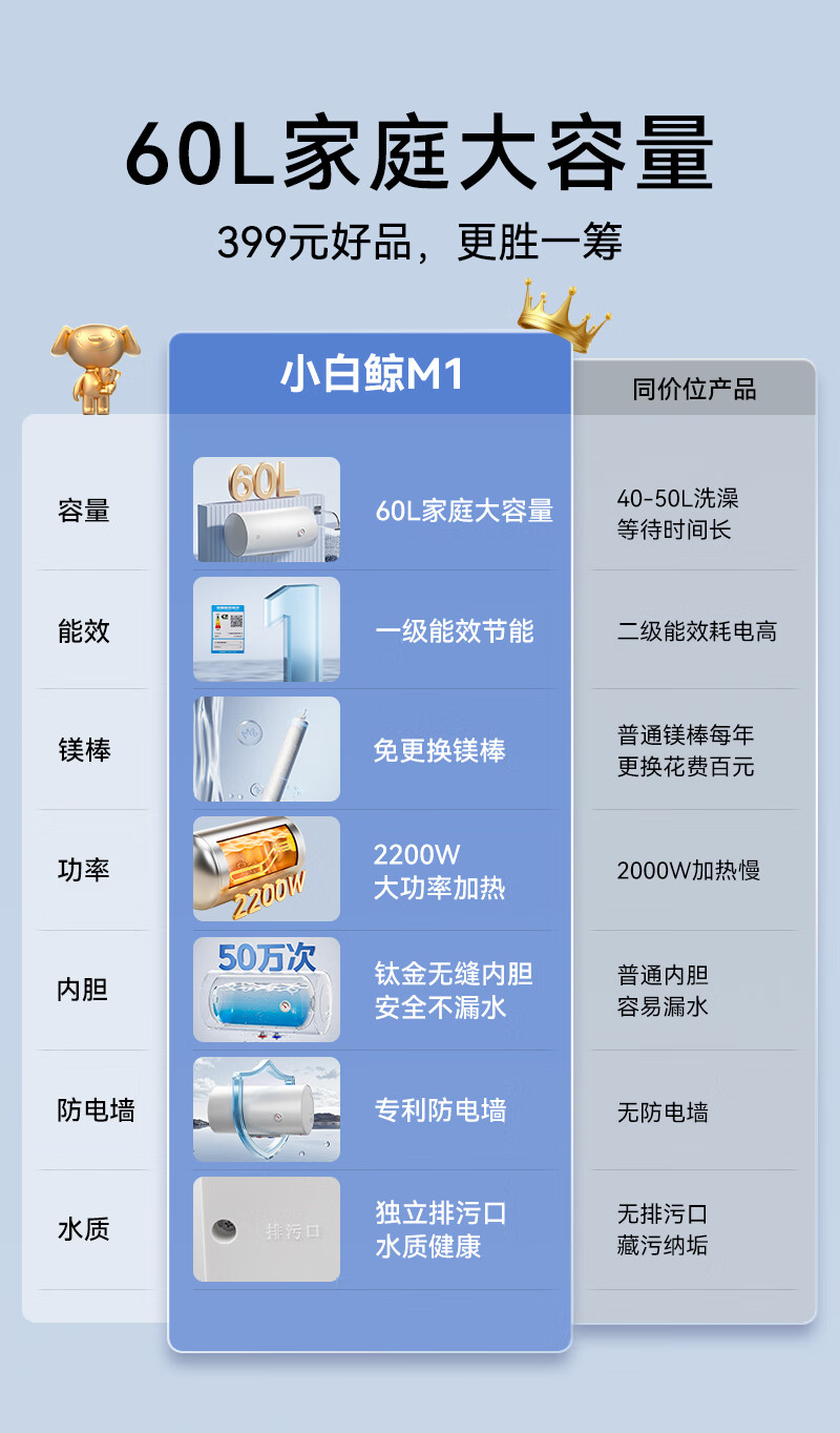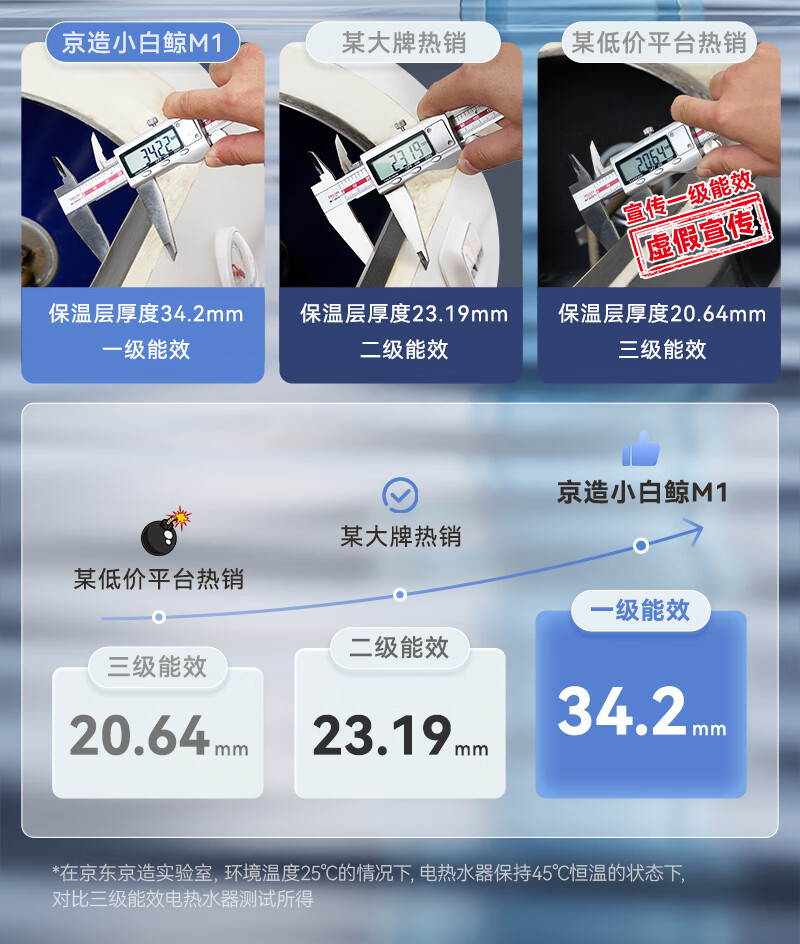京东京造60升电热水器 钛金加厚无缝胆 一级能效 免换镁棒 2200W大水量专利防电墙JZ-KB60M01