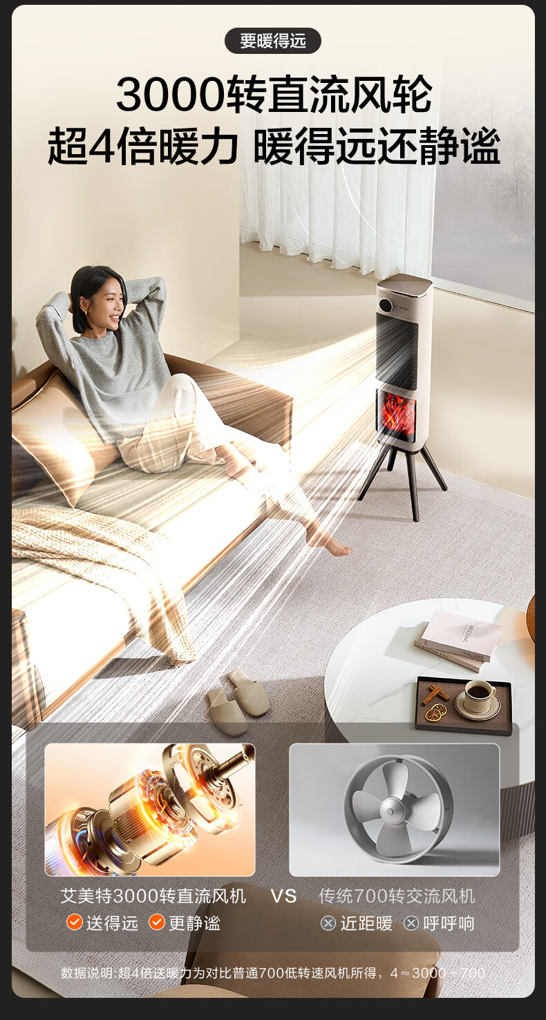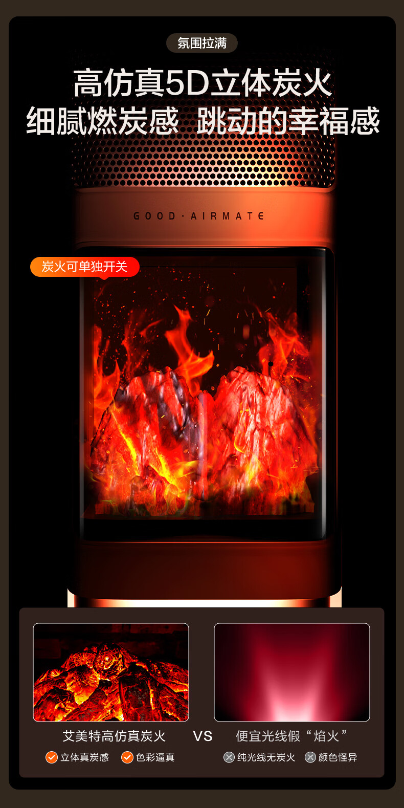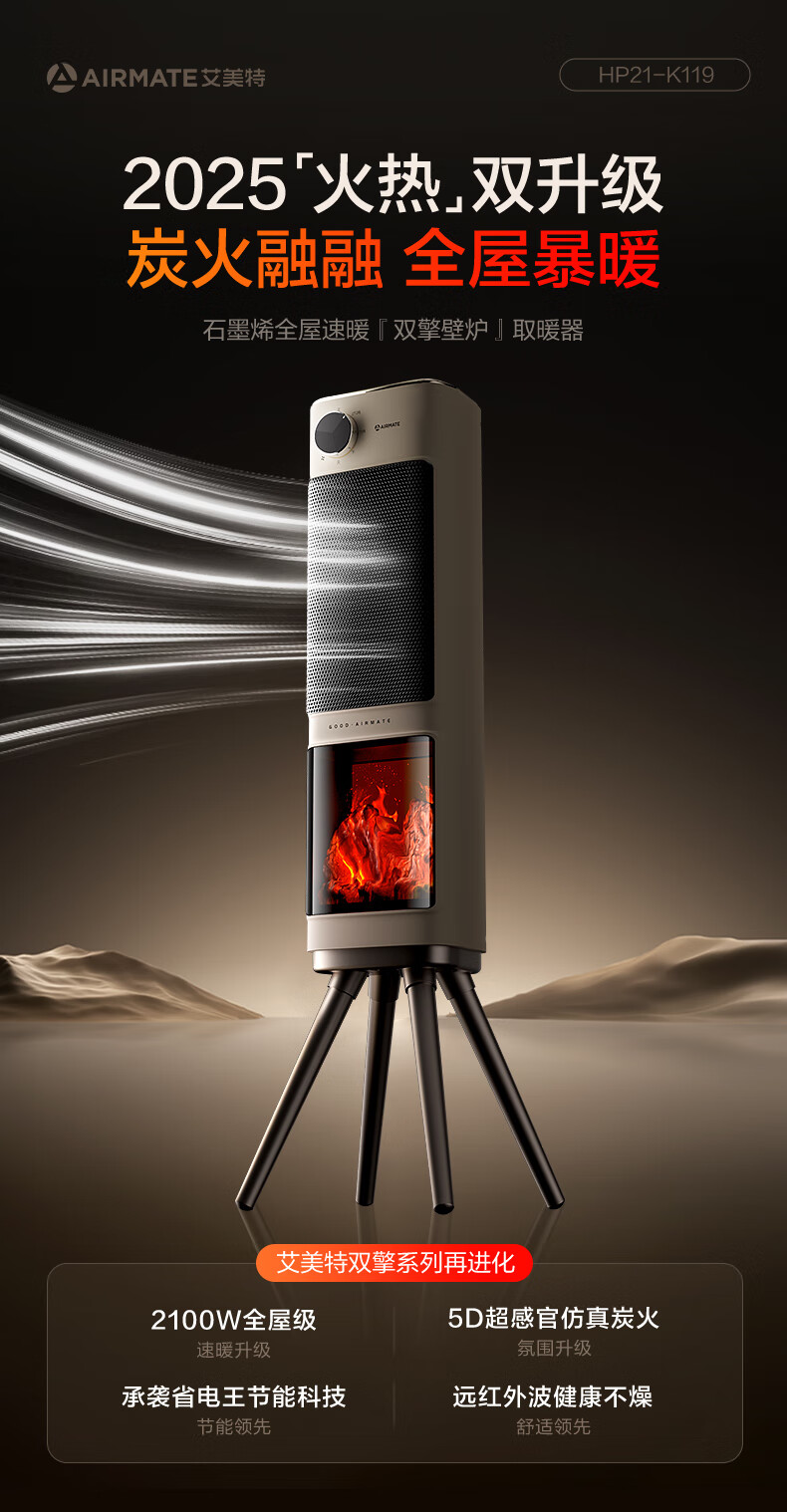 艾美特石墨烯暖风机家用双擎制热取暖器仿真5D篝火壁炉电暖器家用节能省电 2100W 旋钮款 【仿真篝火 石墨烯速暖】HP21-K119