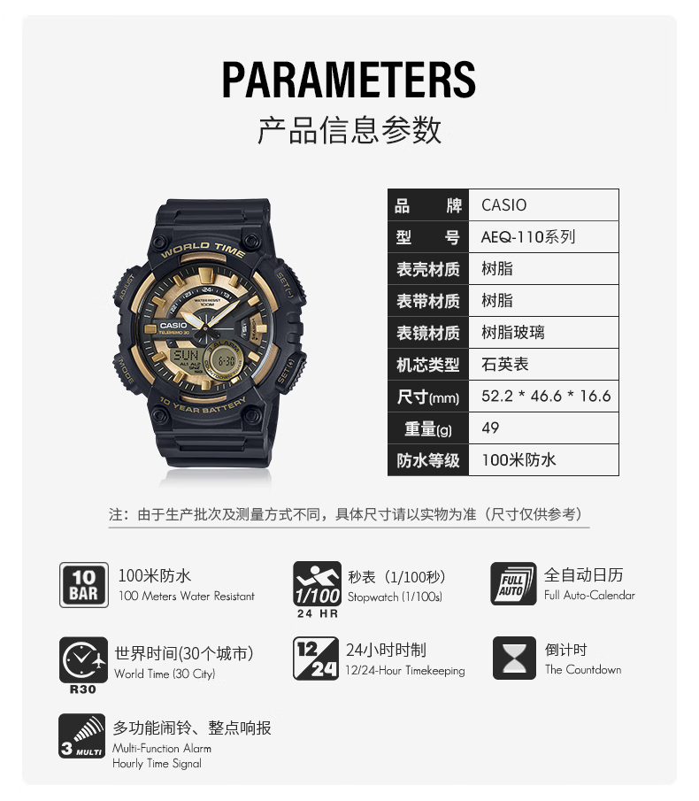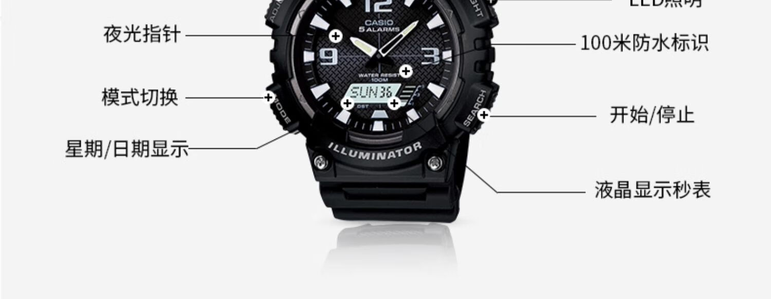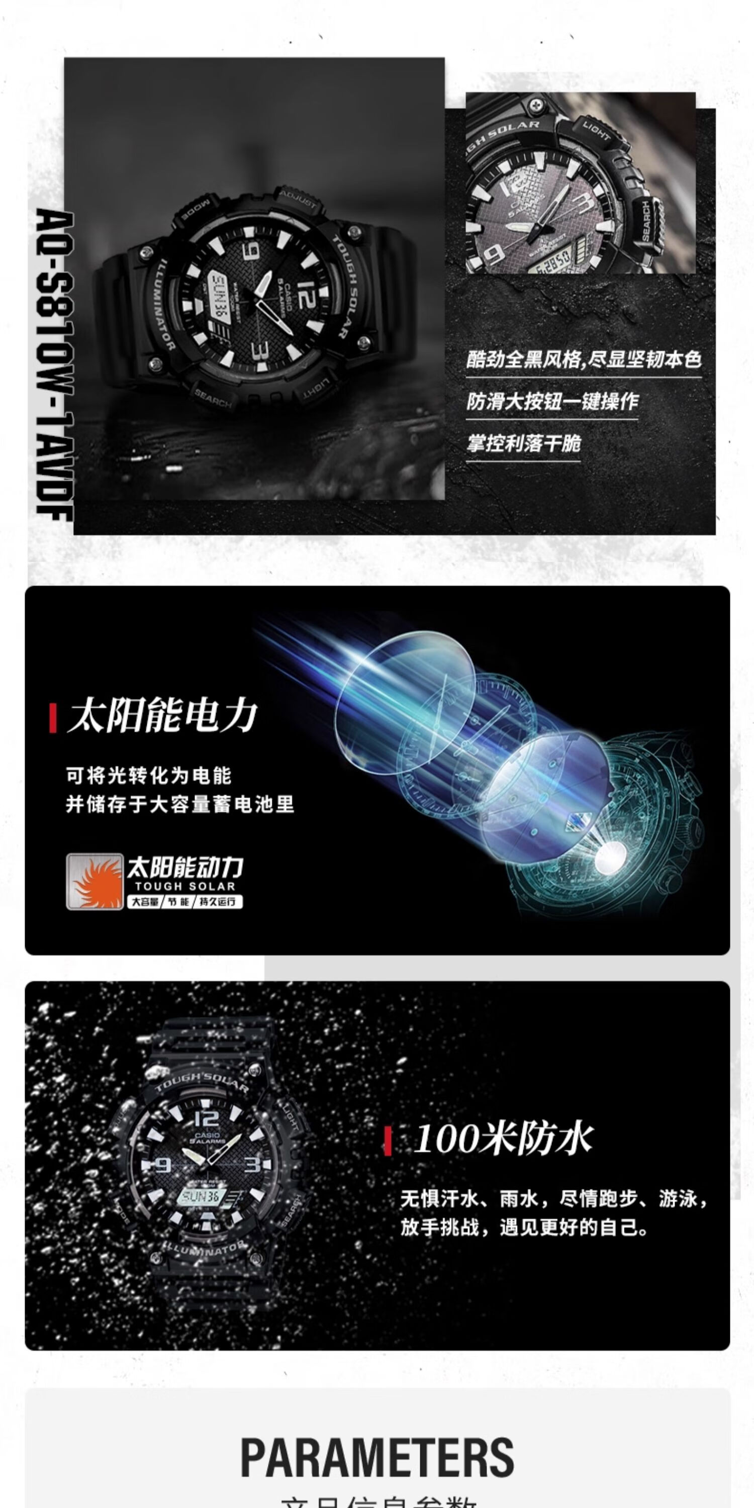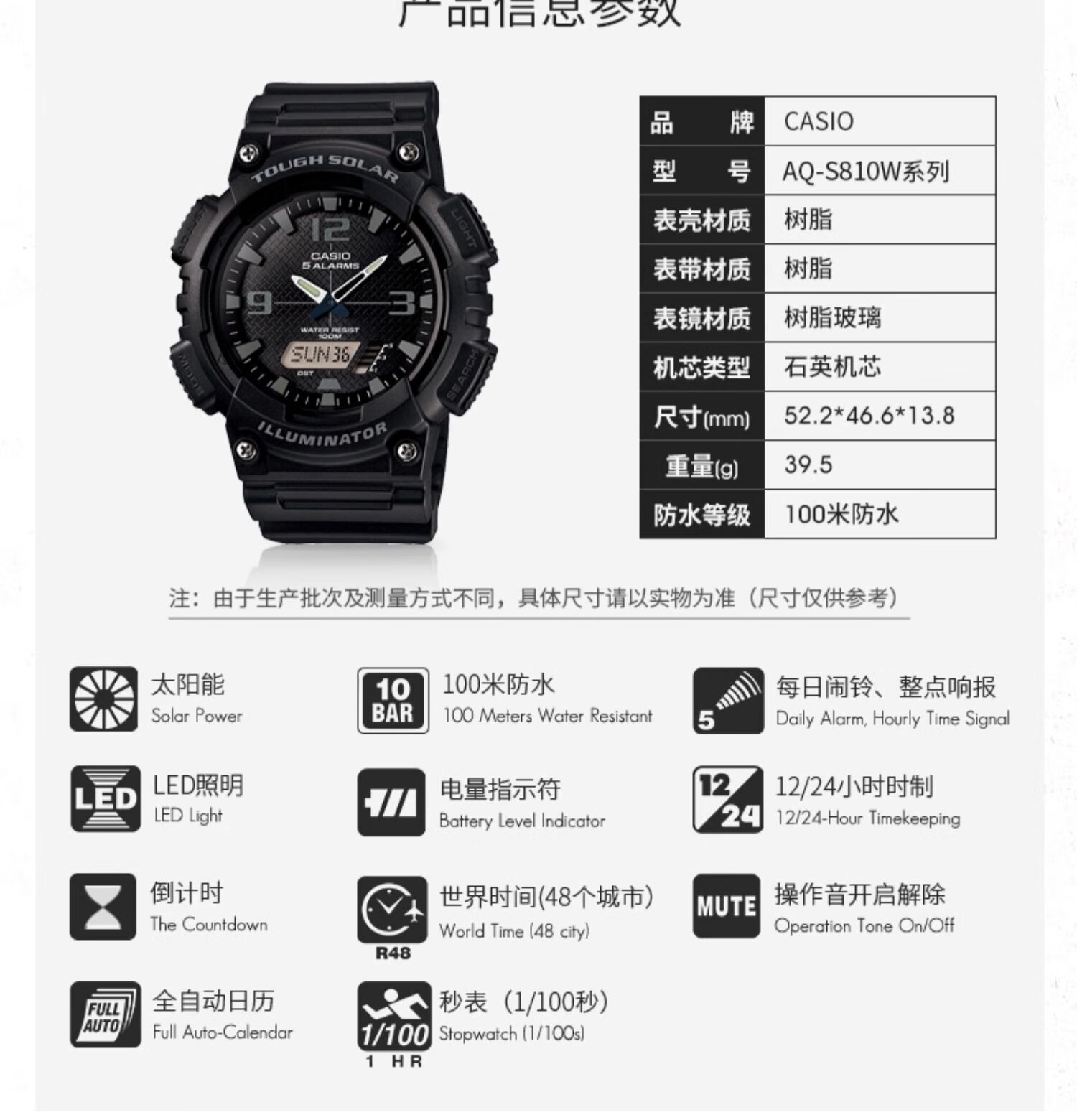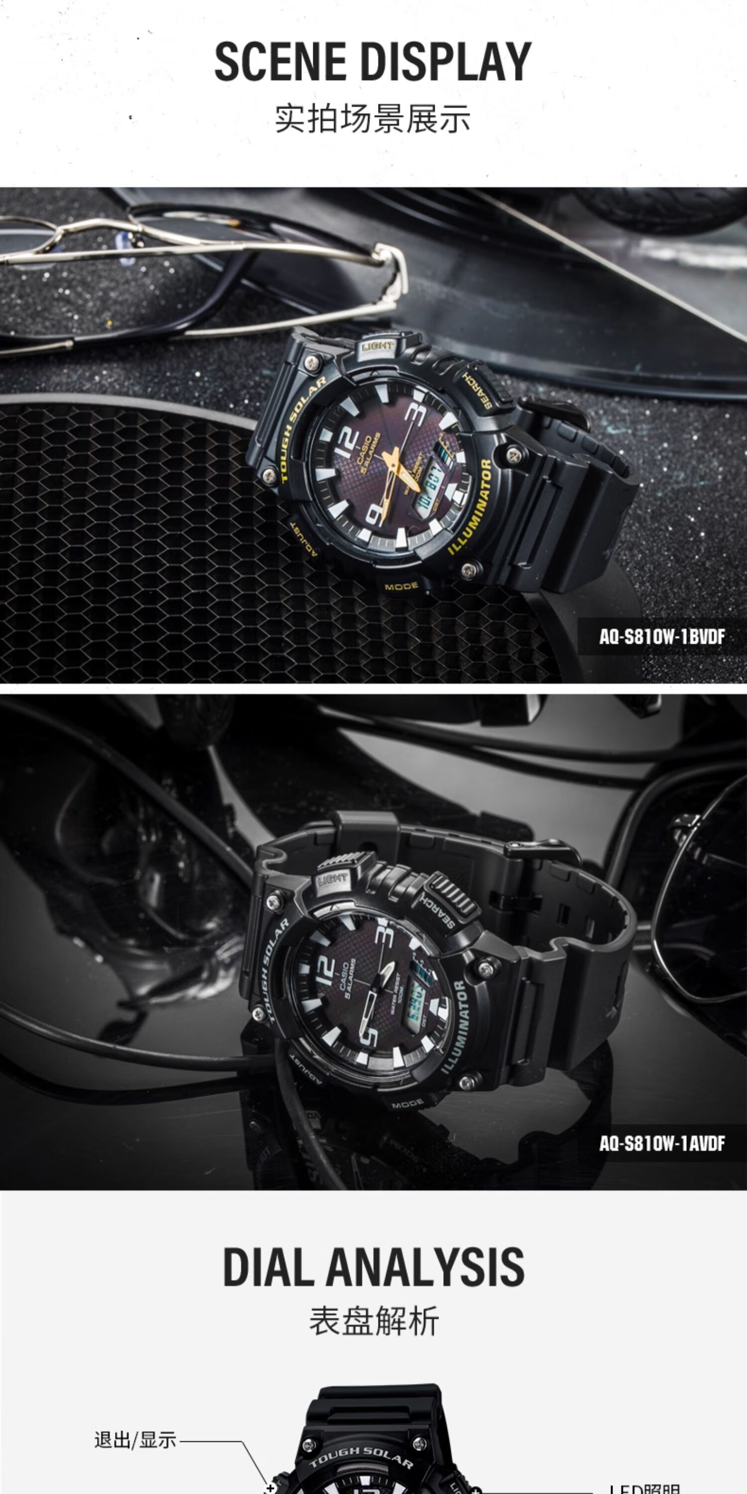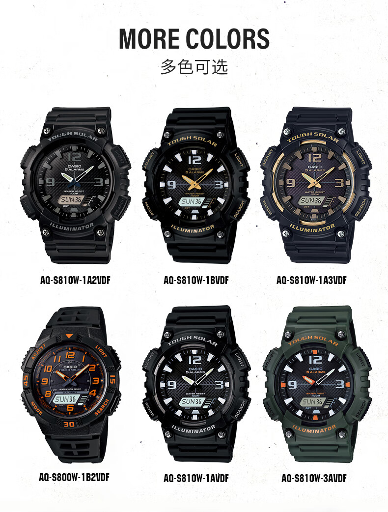 卡西欧(CASIO)手表AQ-S810W 光动能双显运动防水夜光中性初高学生考试表 送礼物 AQ-S810W-1AVDF