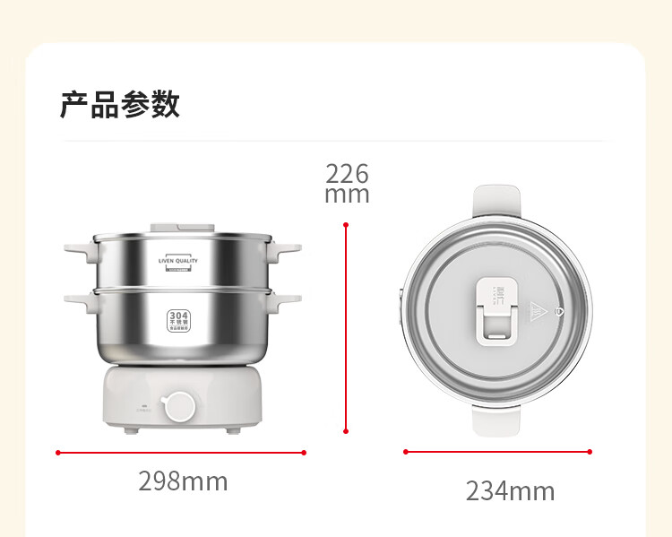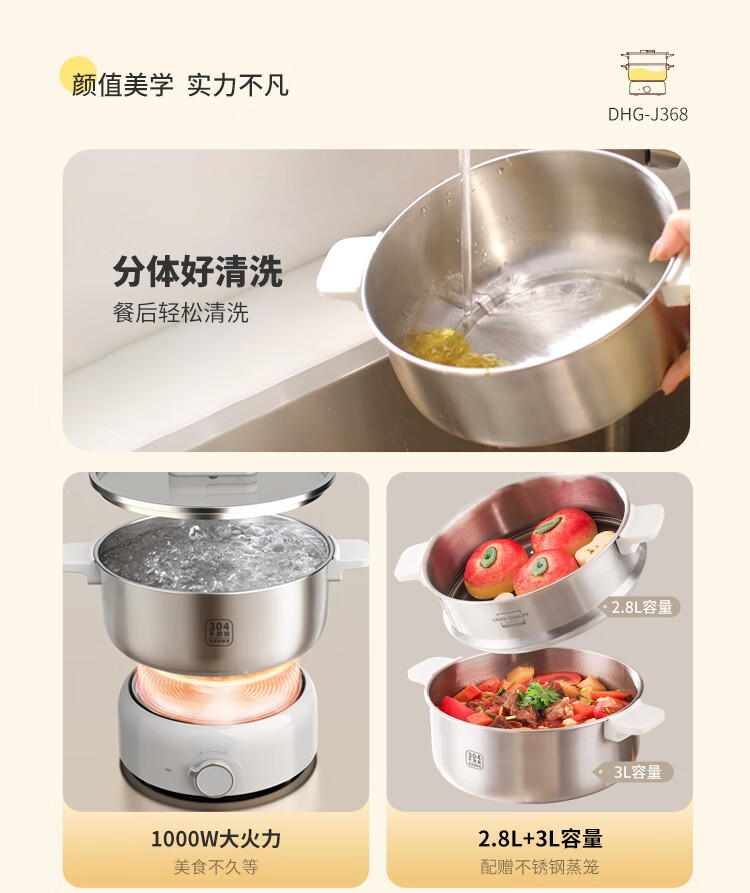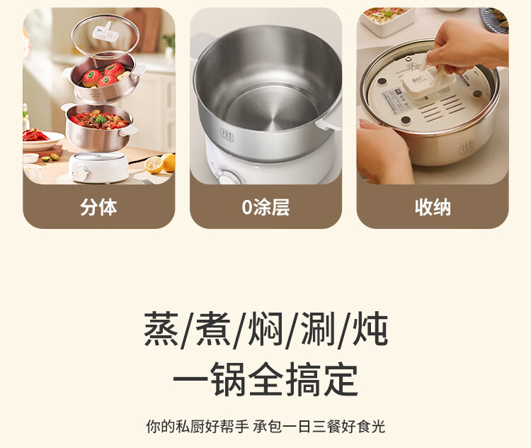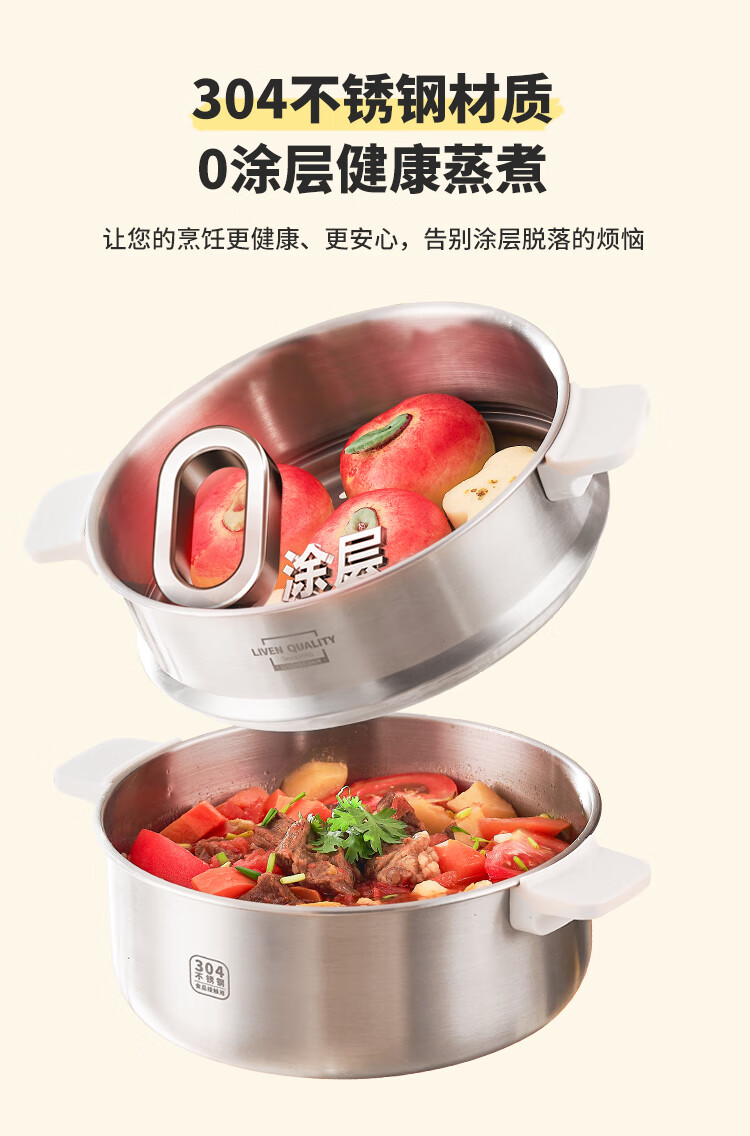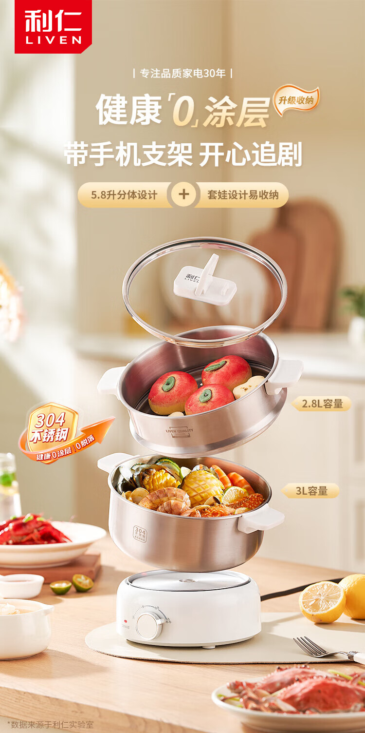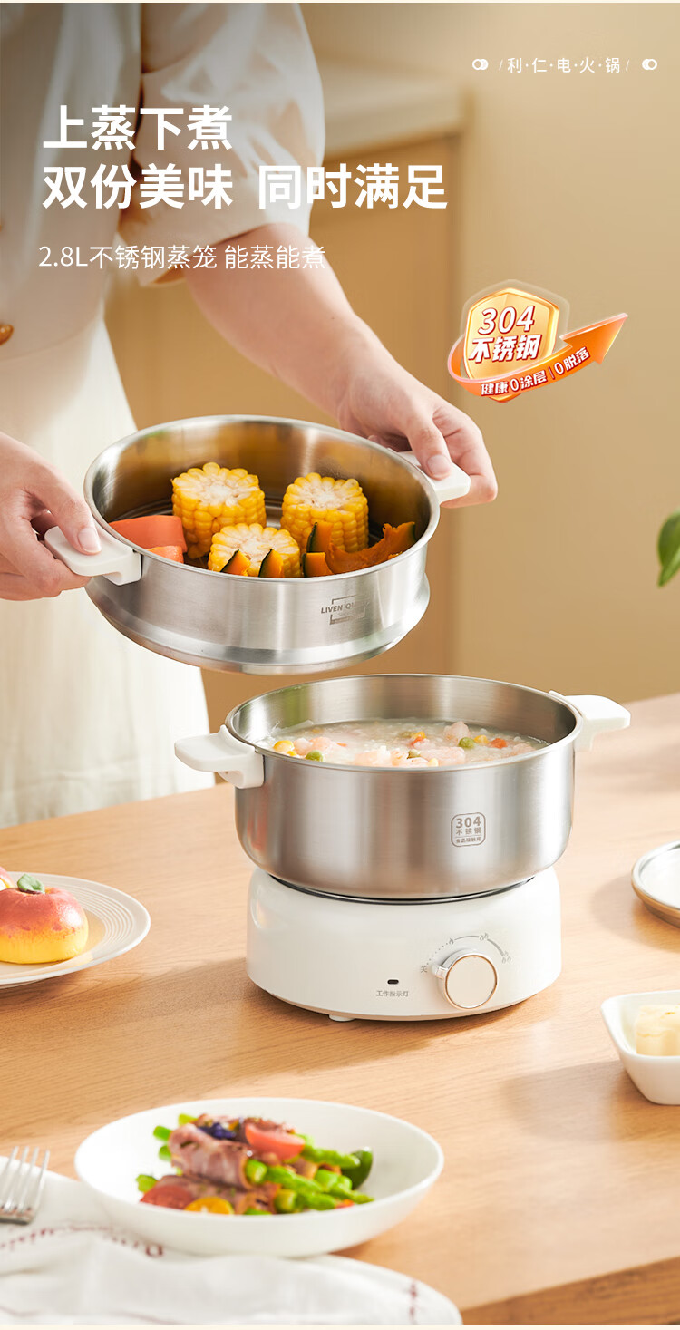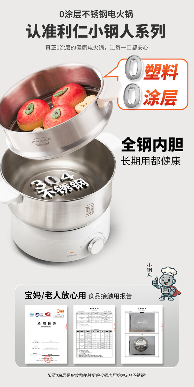 利仁(Liven)小钢人电火锅304不锈钢电煮锅分体式小电锅小型2-3人用3升小锅0涂层电蒸锅电热锅带蒸笼DHG-J368