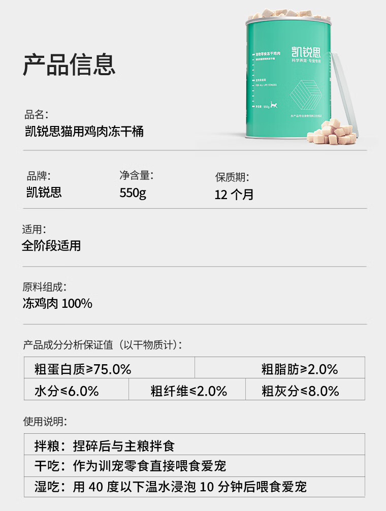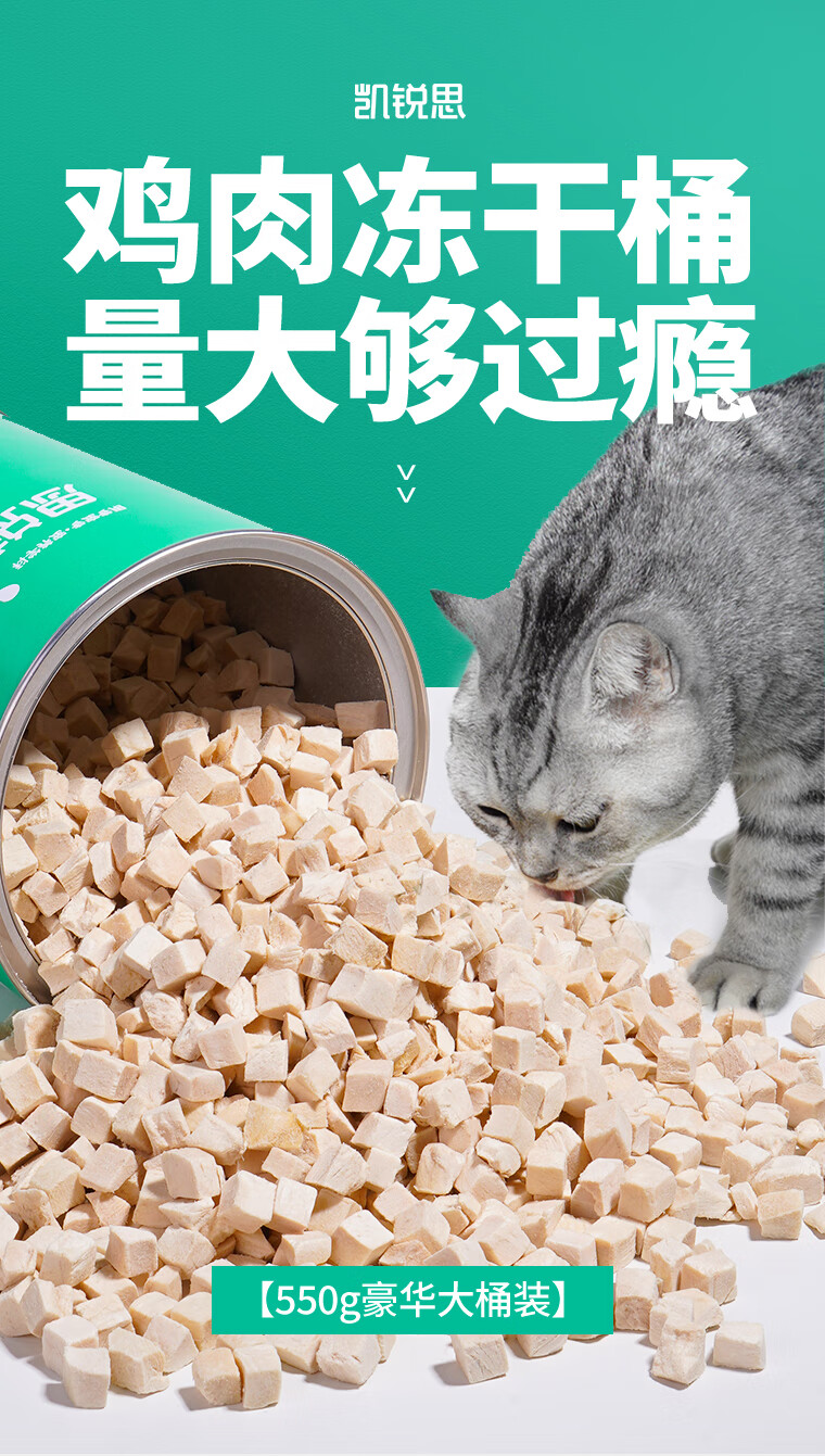凯锐思 猫零食 冻干猫咪鸡胸肉冻干桶100%纯鸡肉宠物零食 冻干鸡肉桶 550g