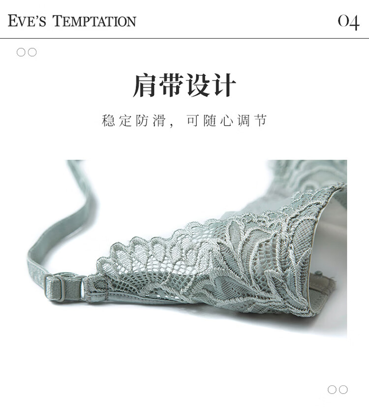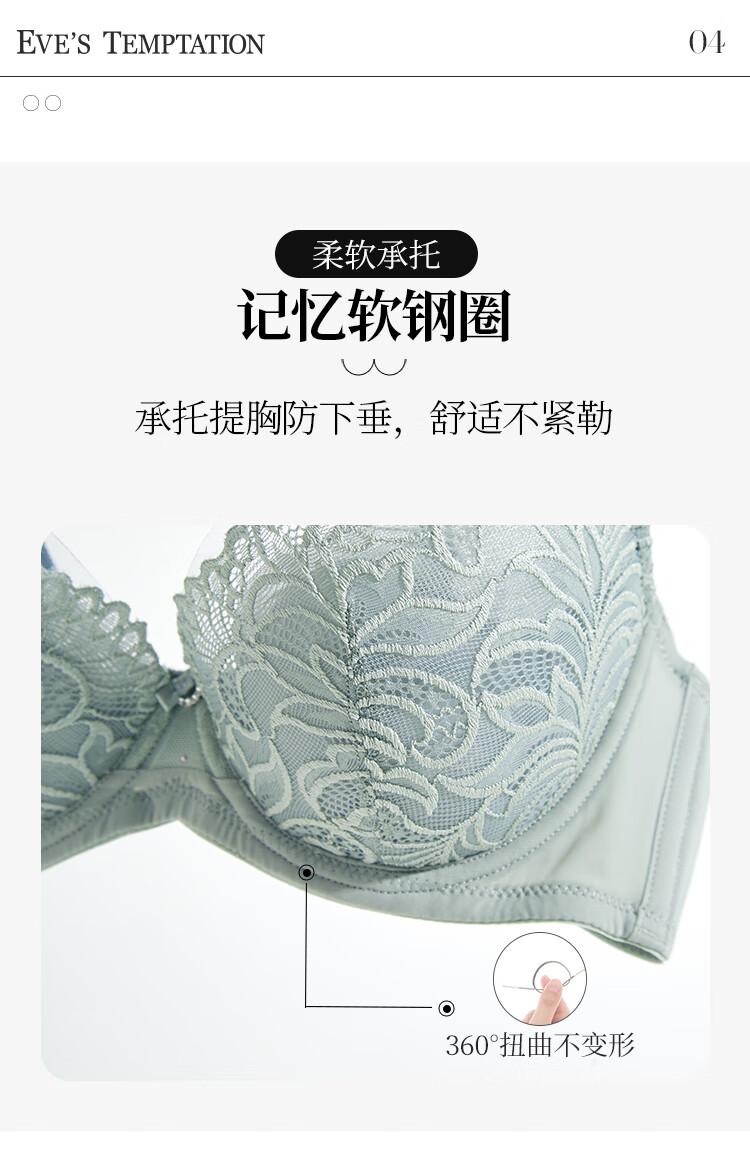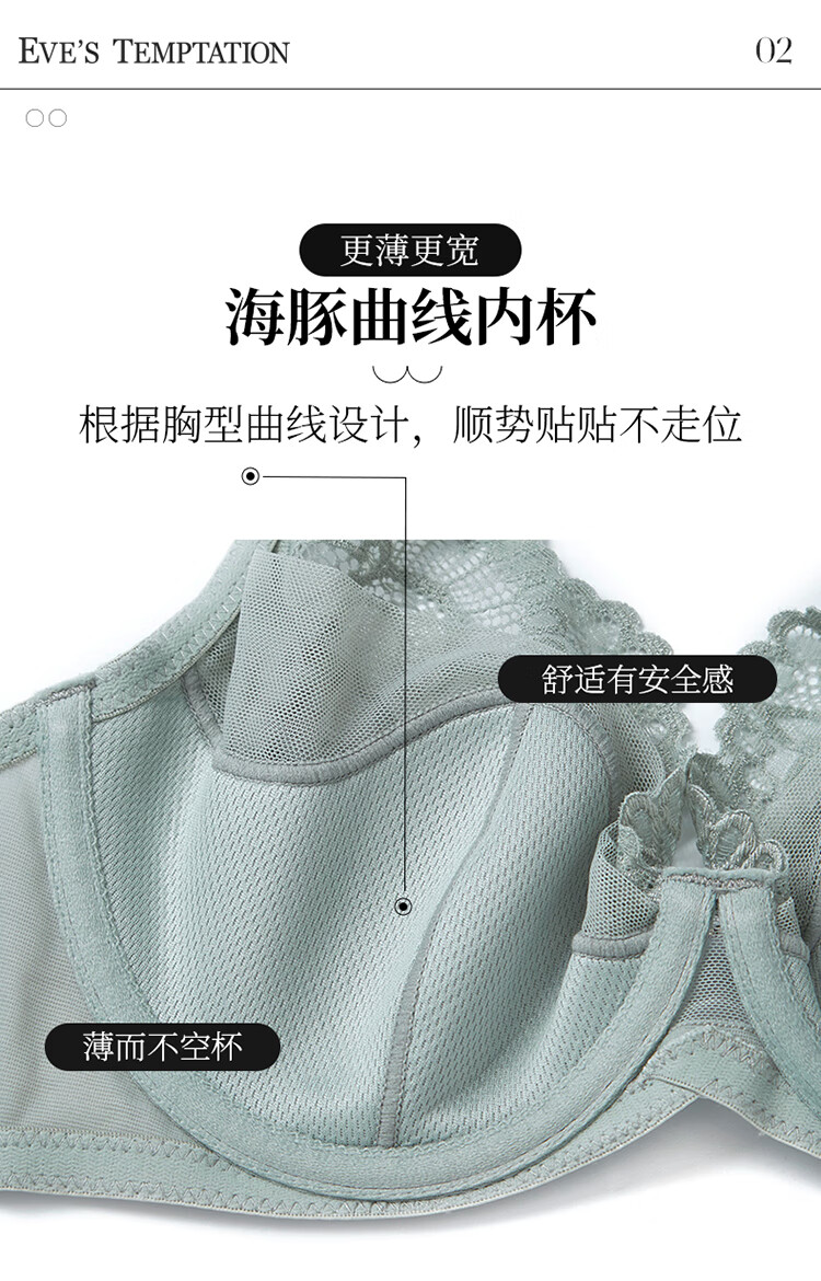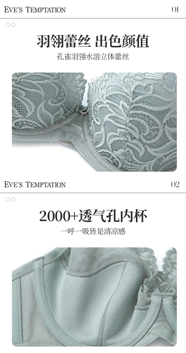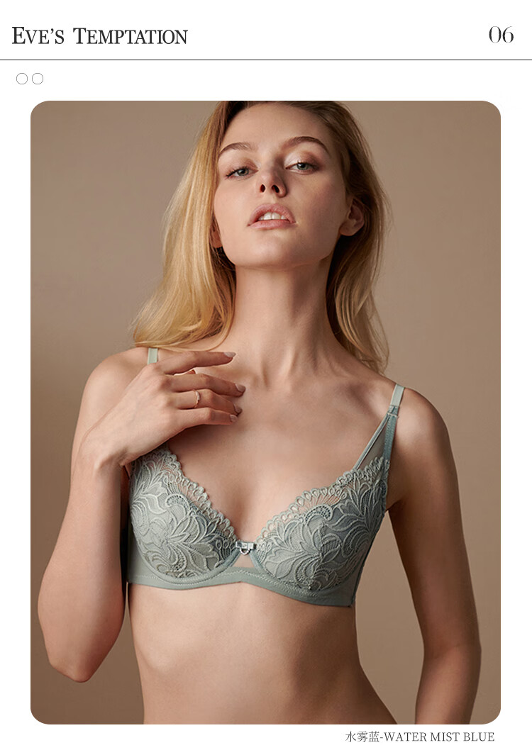夏娃的诱惑浥轻尘组内衣女夏季薄款软钢圈大胸显小蕾丝性感文胸上托防下垂 水雾蓝 85E