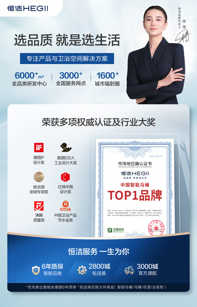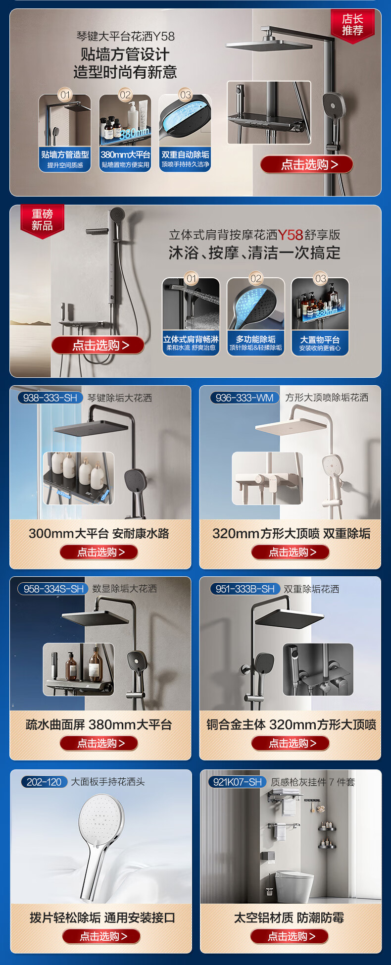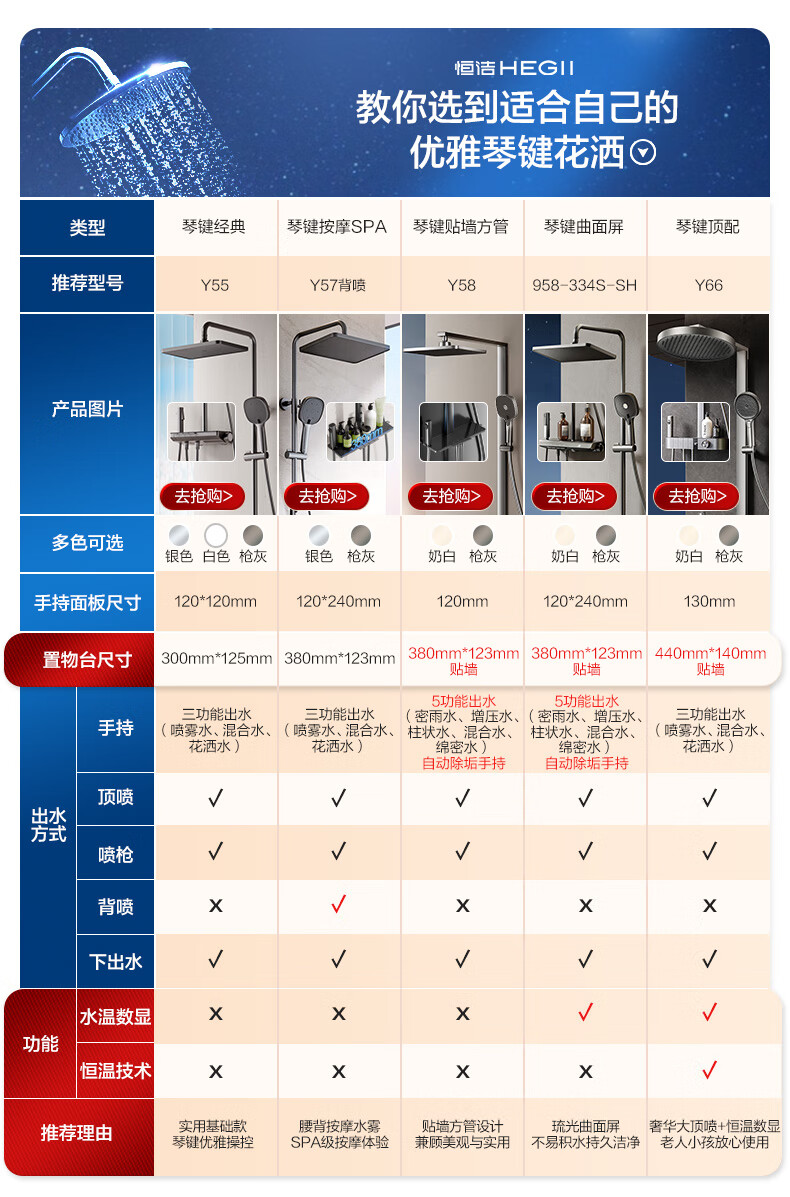 恒洁(HEGII)淋浴花洒套装Y55 按键大平台智能自动除垢花洒全套HMF938-333-SH