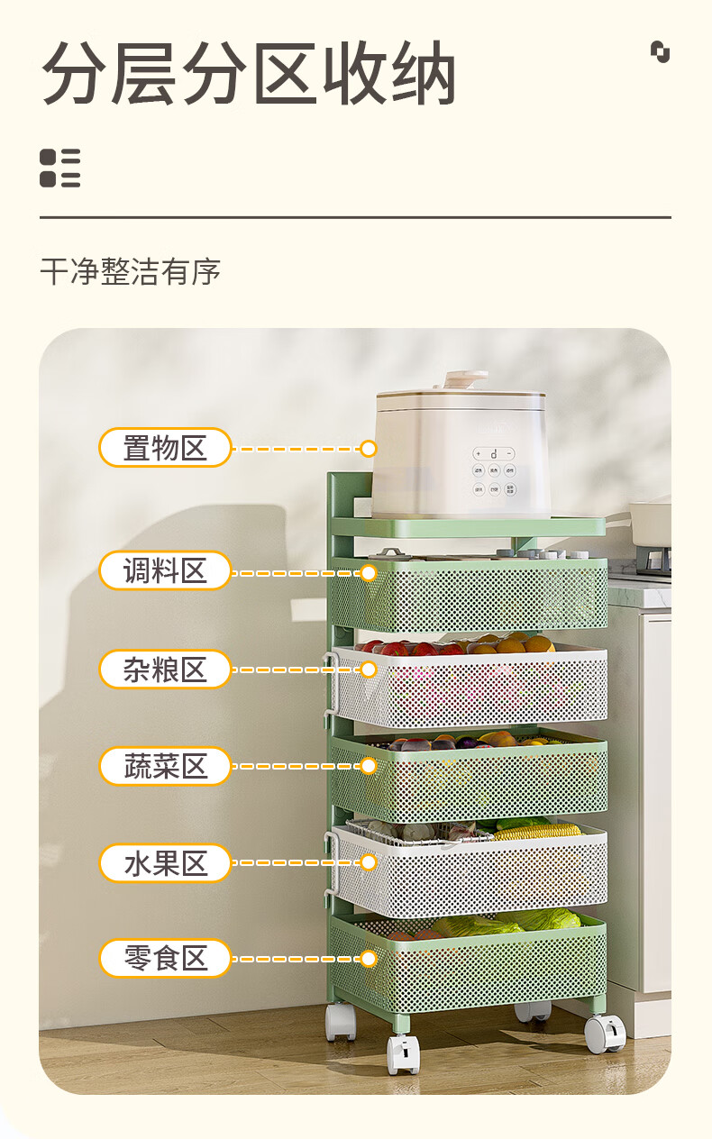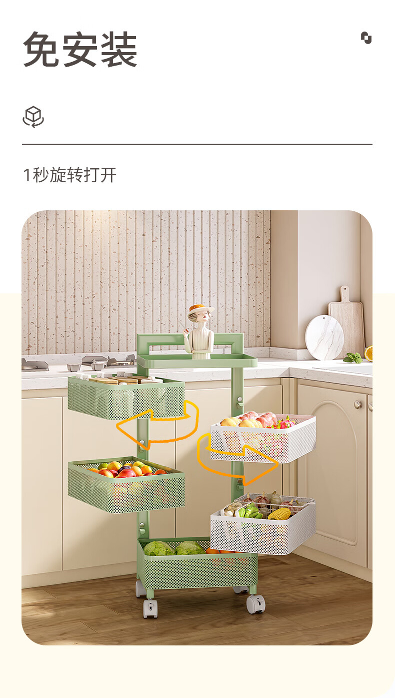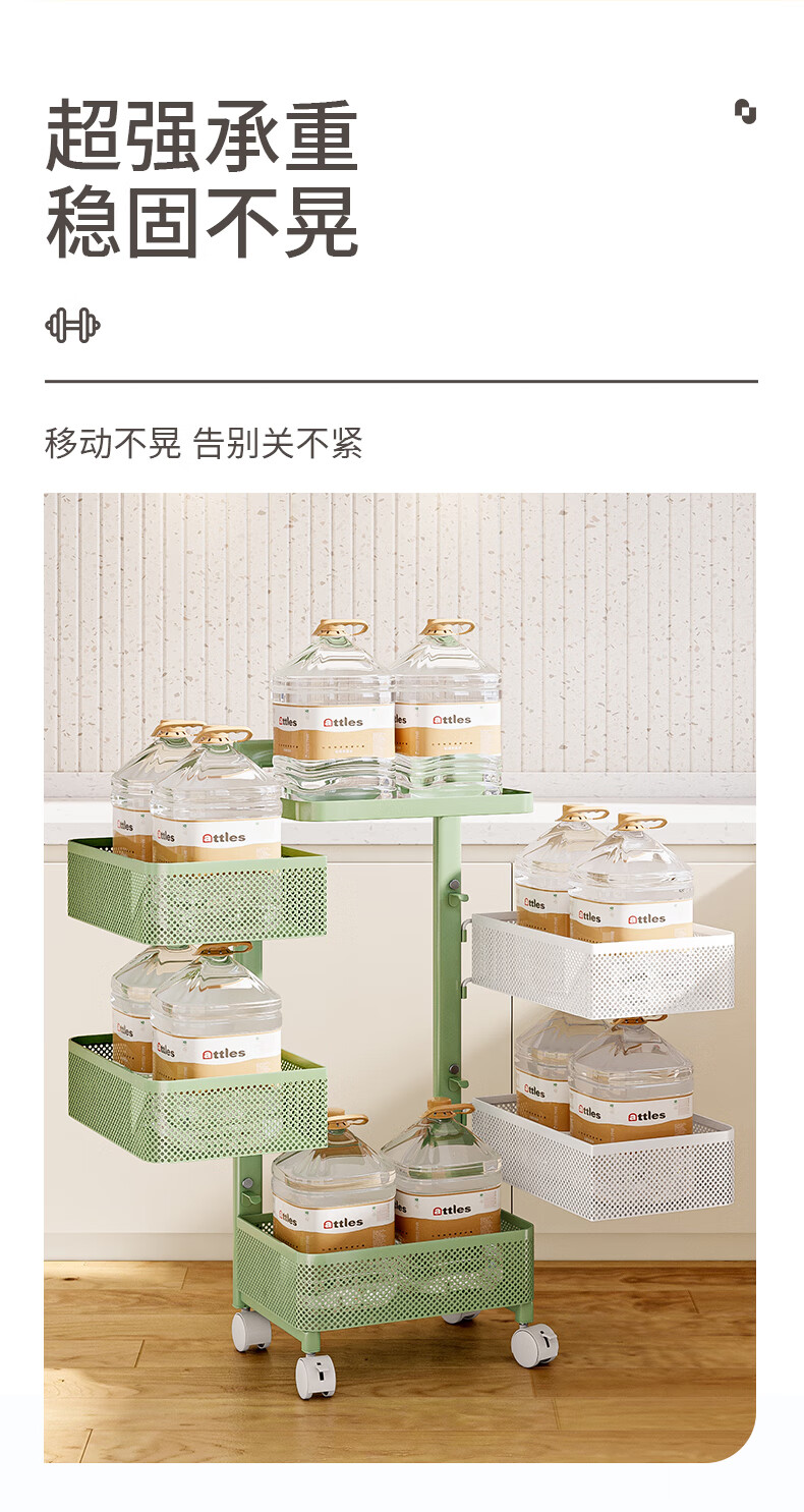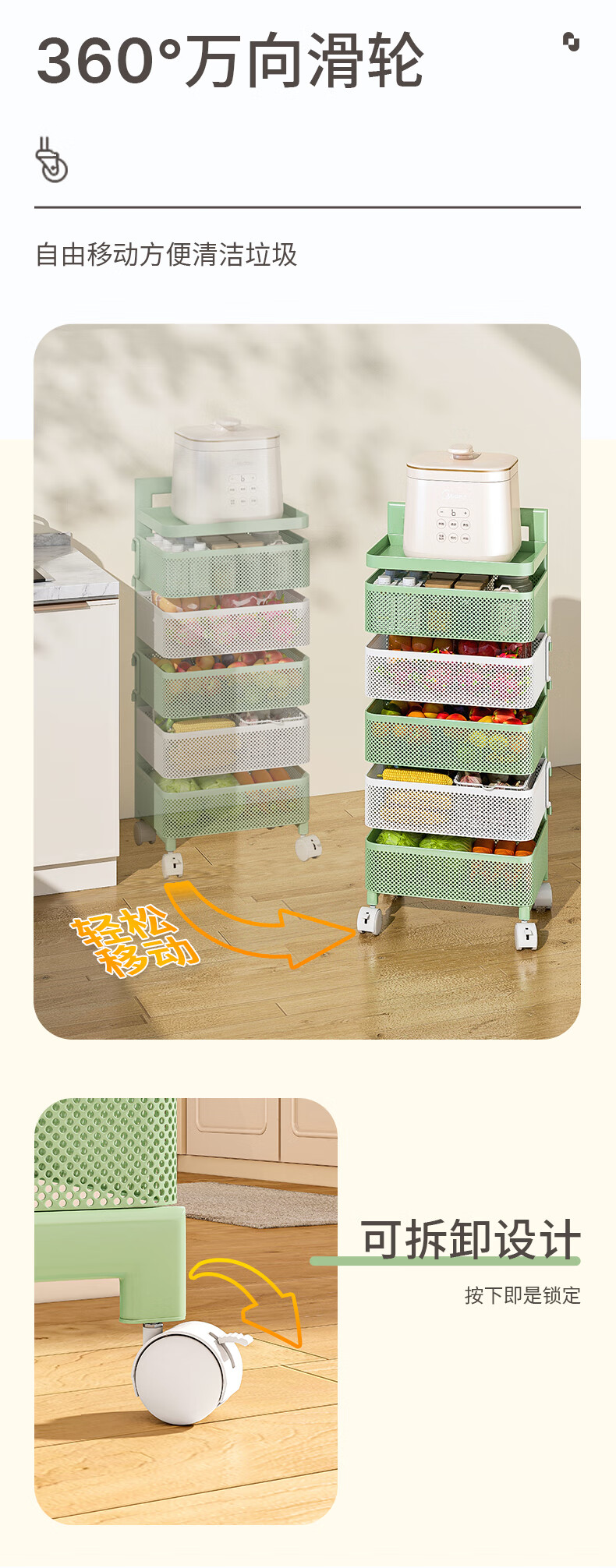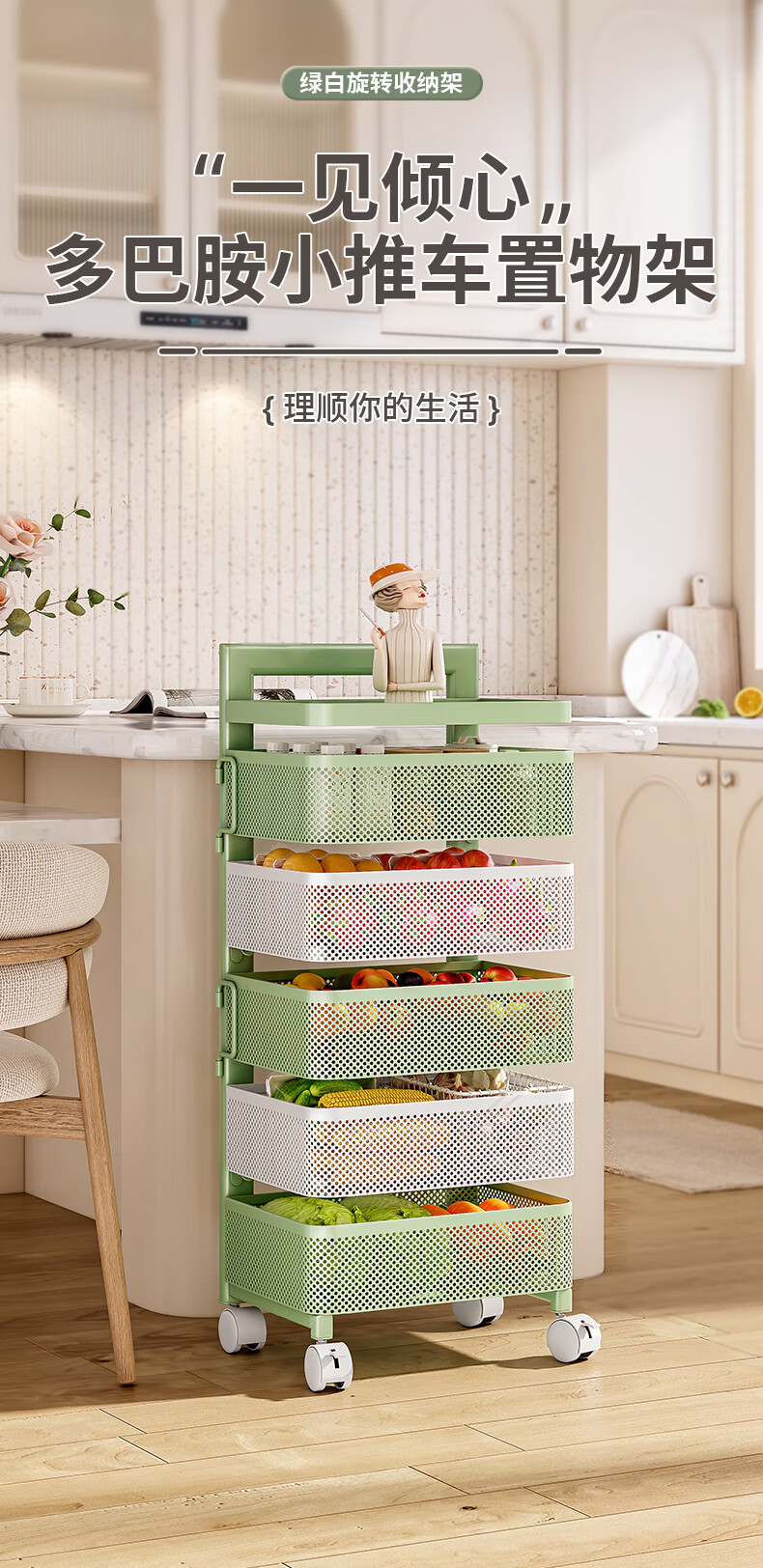 雅图诗厨房蔬菜置物架落地多层小推车放水果零食收纳架多功能旋转菜篮子 绿白 5层35*26cm【免安装】