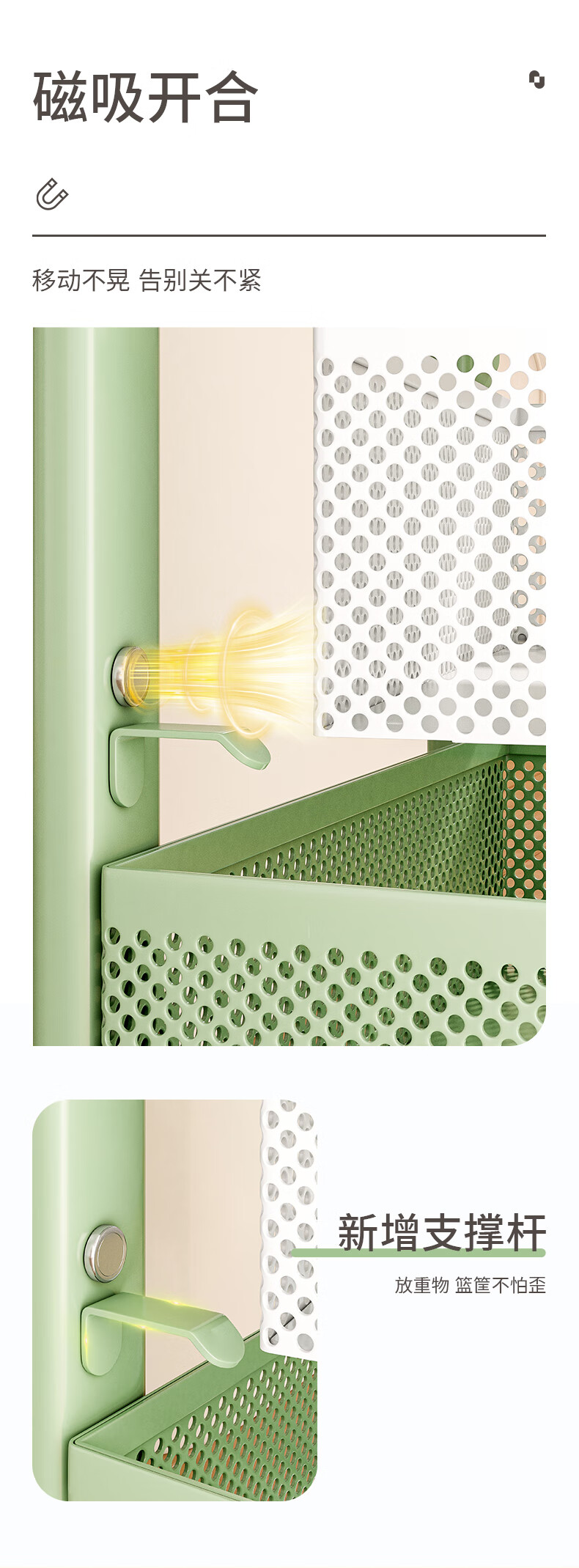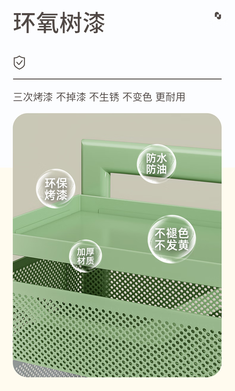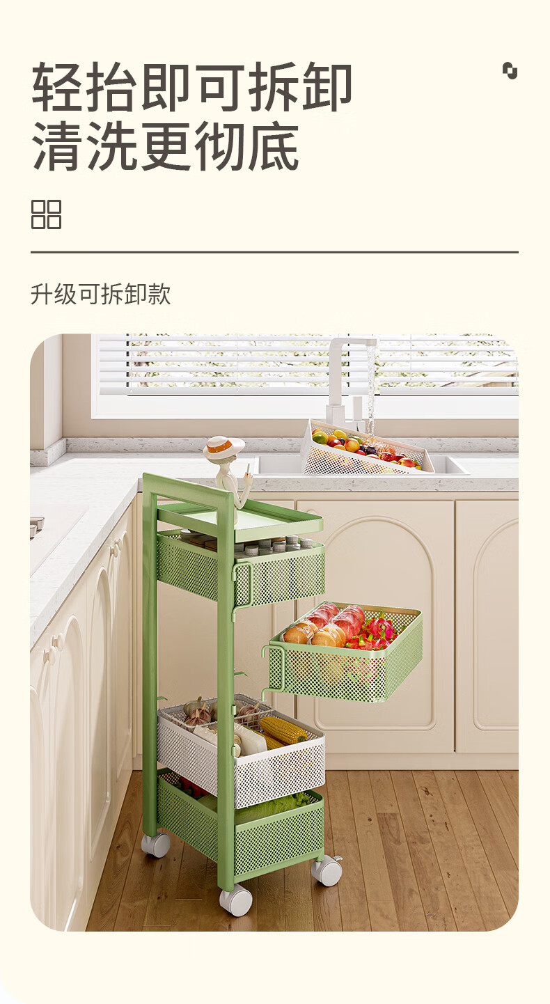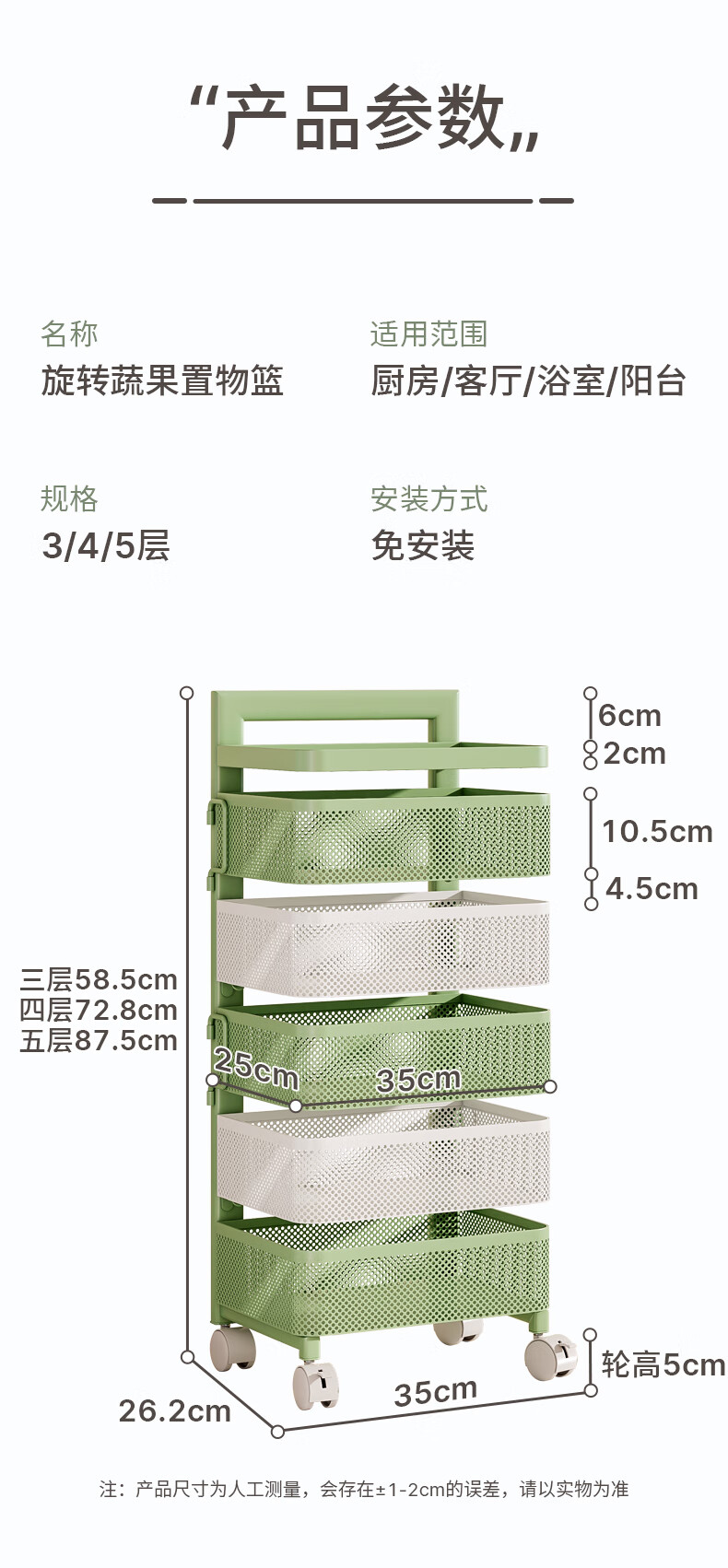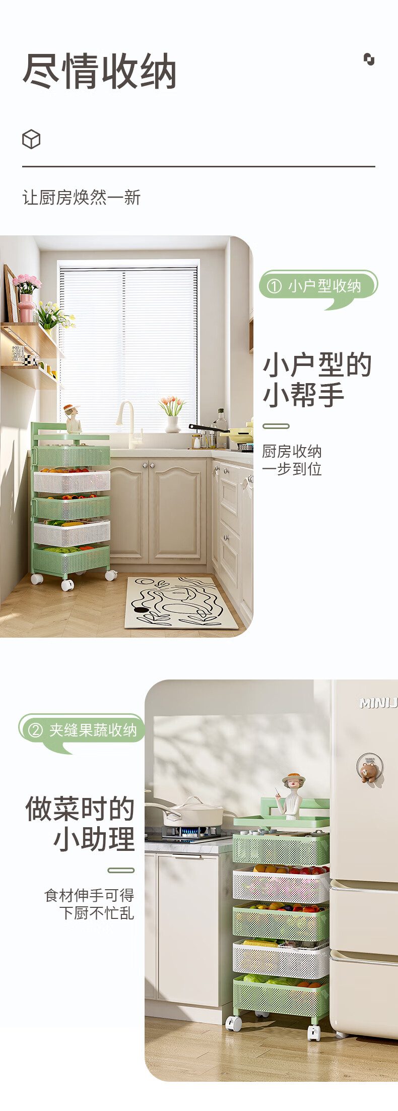 雅图诗厨房蔬菜置物架落地多层小推车放水果零食收纳架多功能旋转菜篮子 绿白 5层35*26cm【免安装】