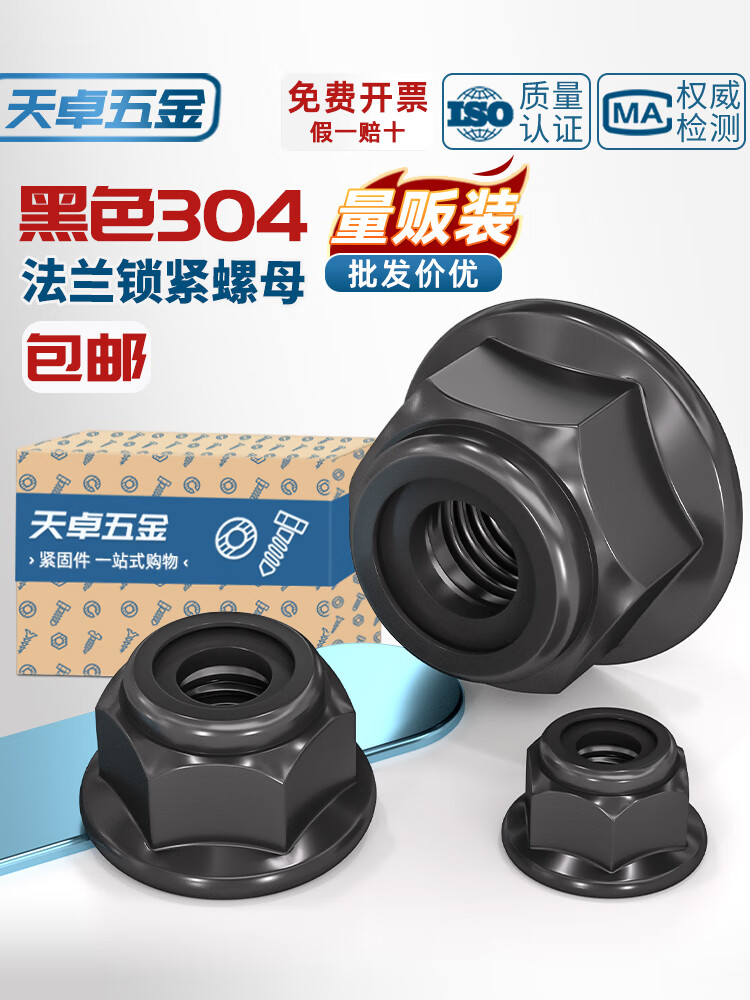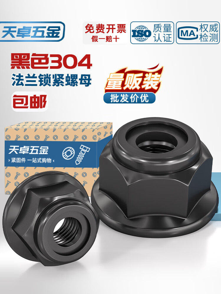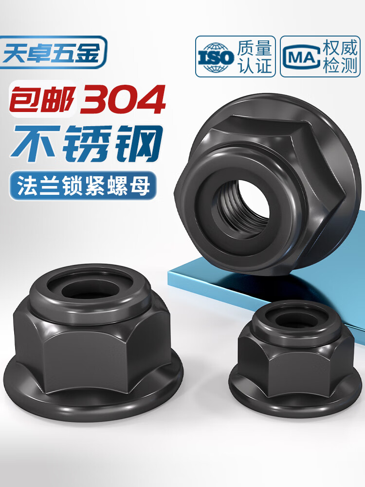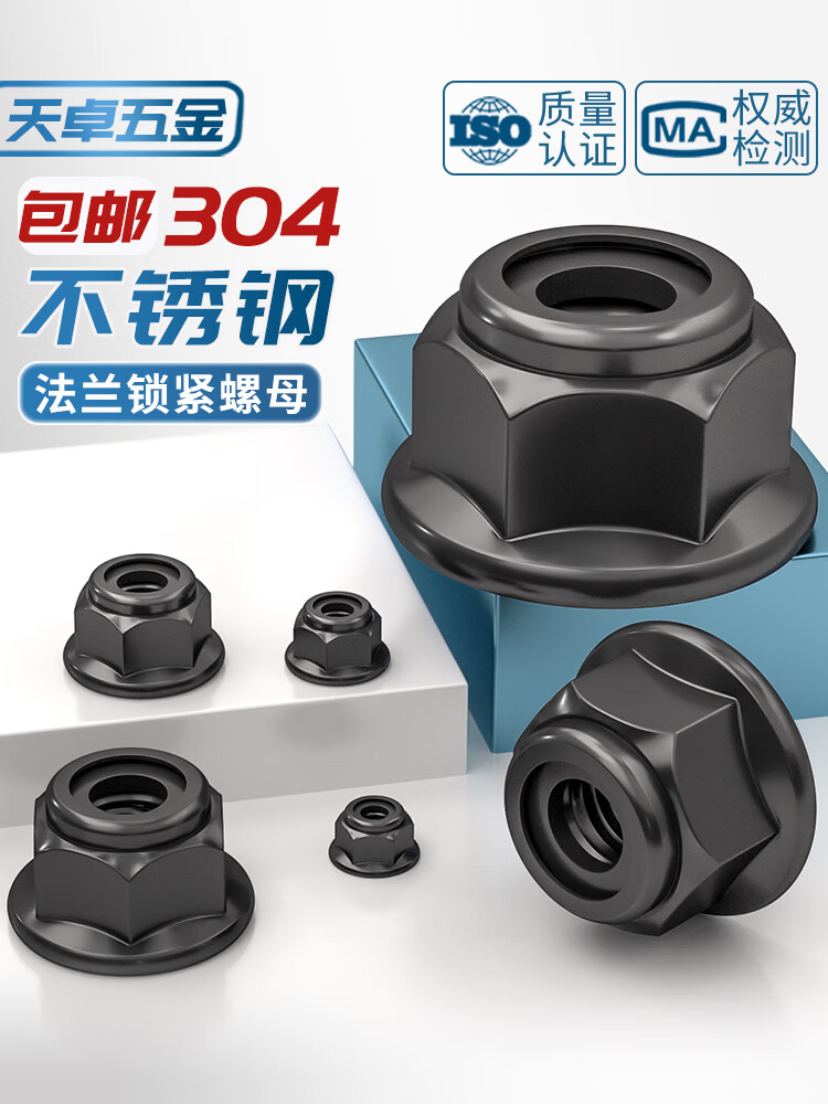 天卓五金黑色304不锈钢尼龙防松锁紧螺母法兰自锁螺丝帽黑锌带垫尼帽螺帽 M3【30个】