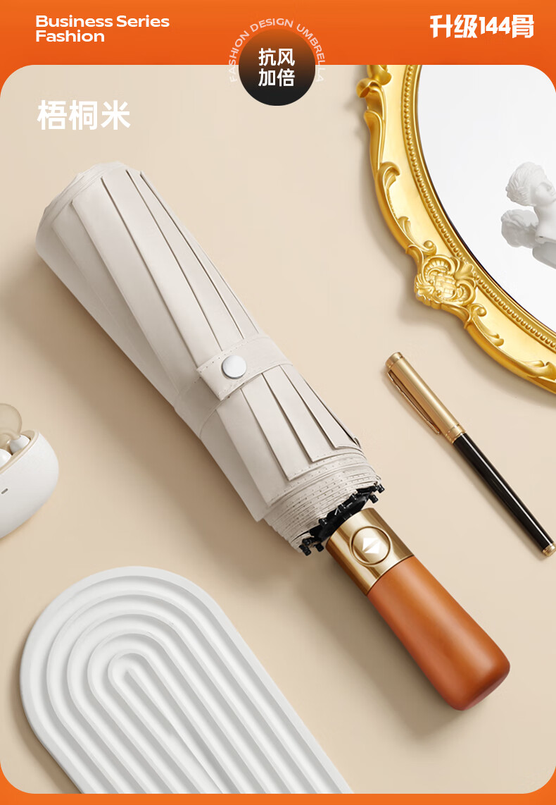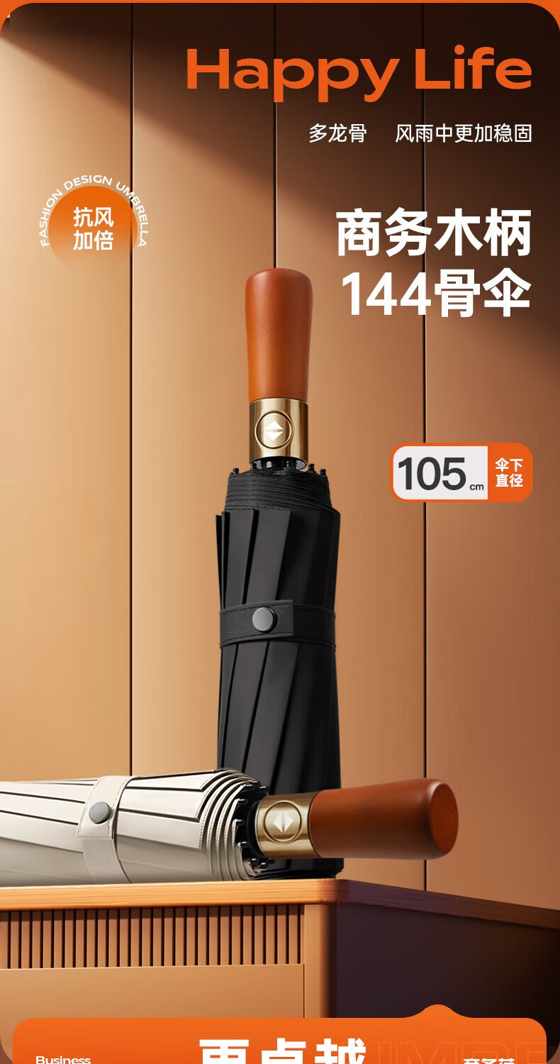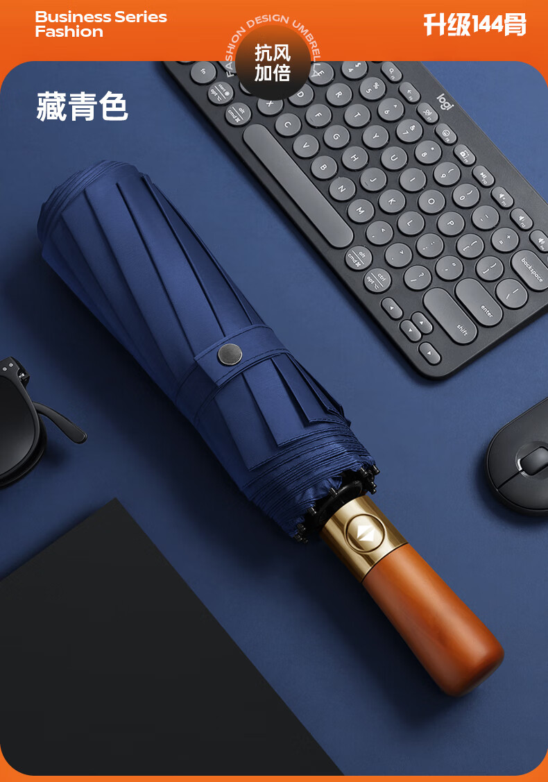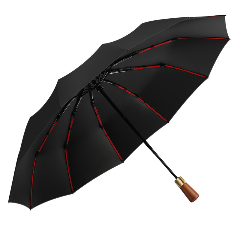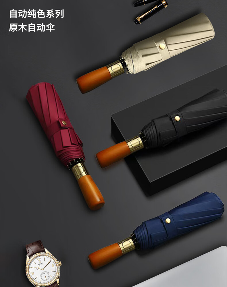 印象城实木柄全自动雨伞晴雨两用大号黑胶防晒伞三折抗风加固自动伞雨具 绅士-藏青