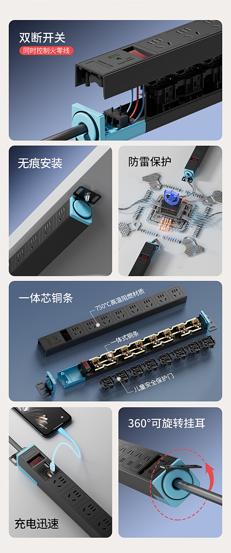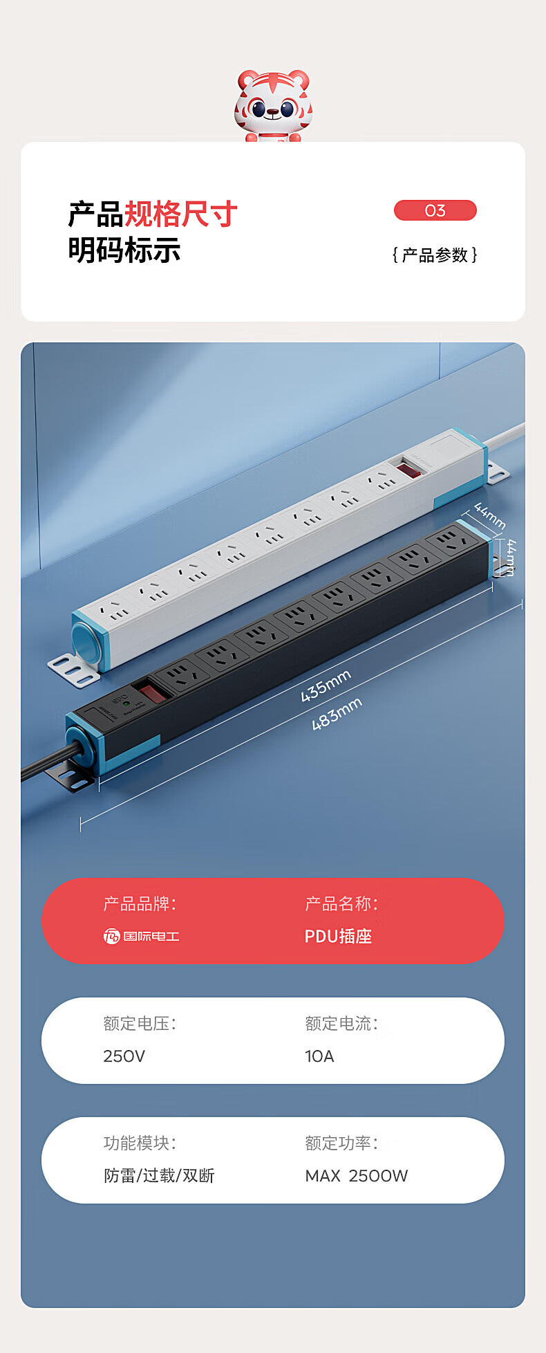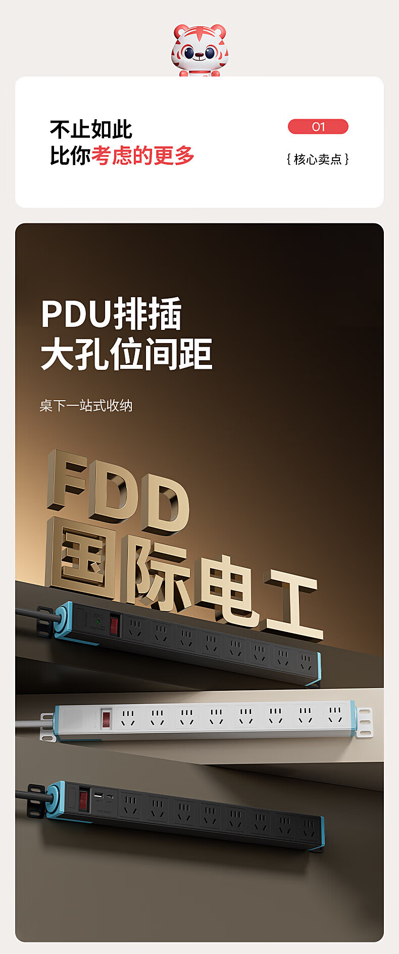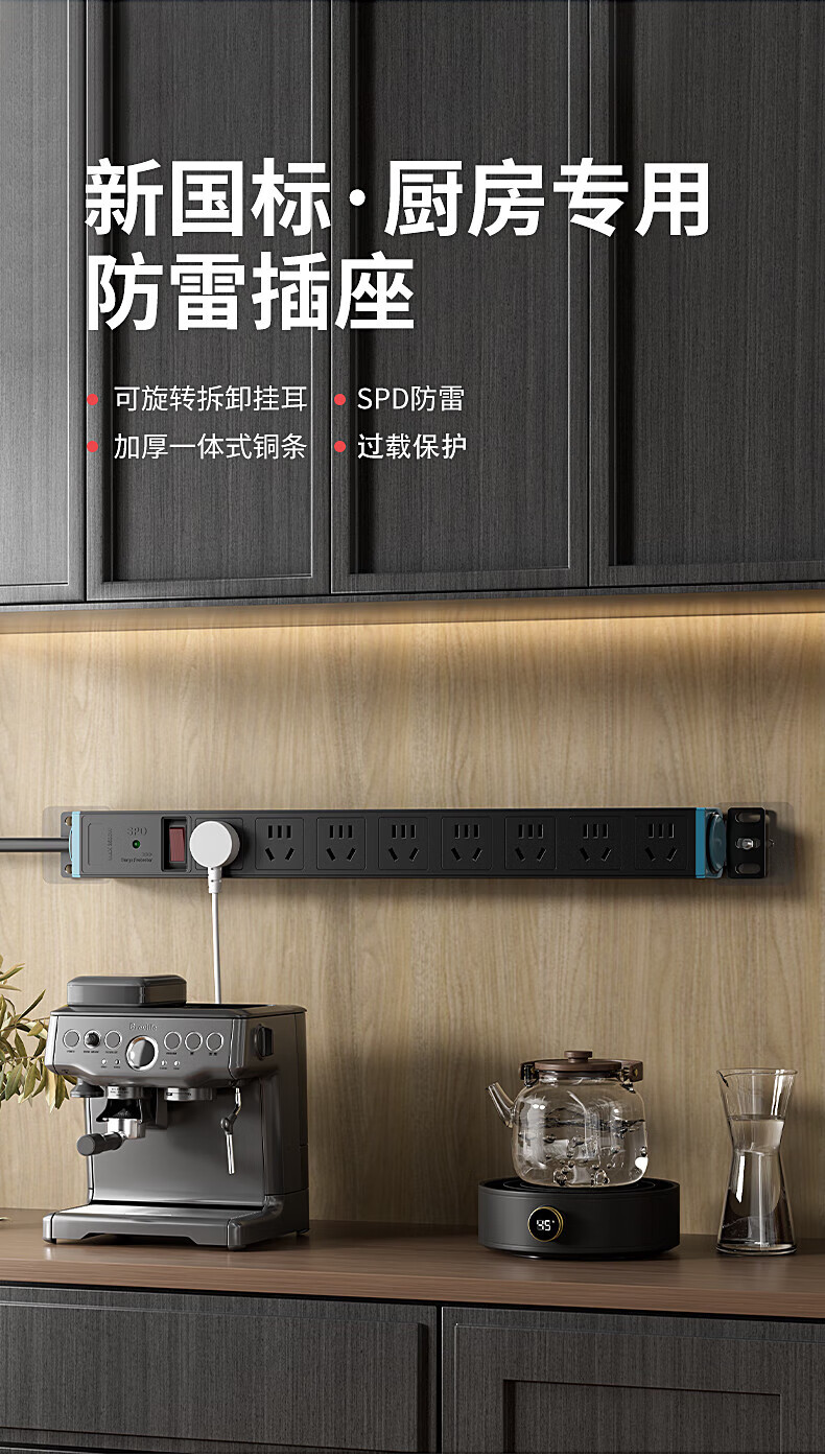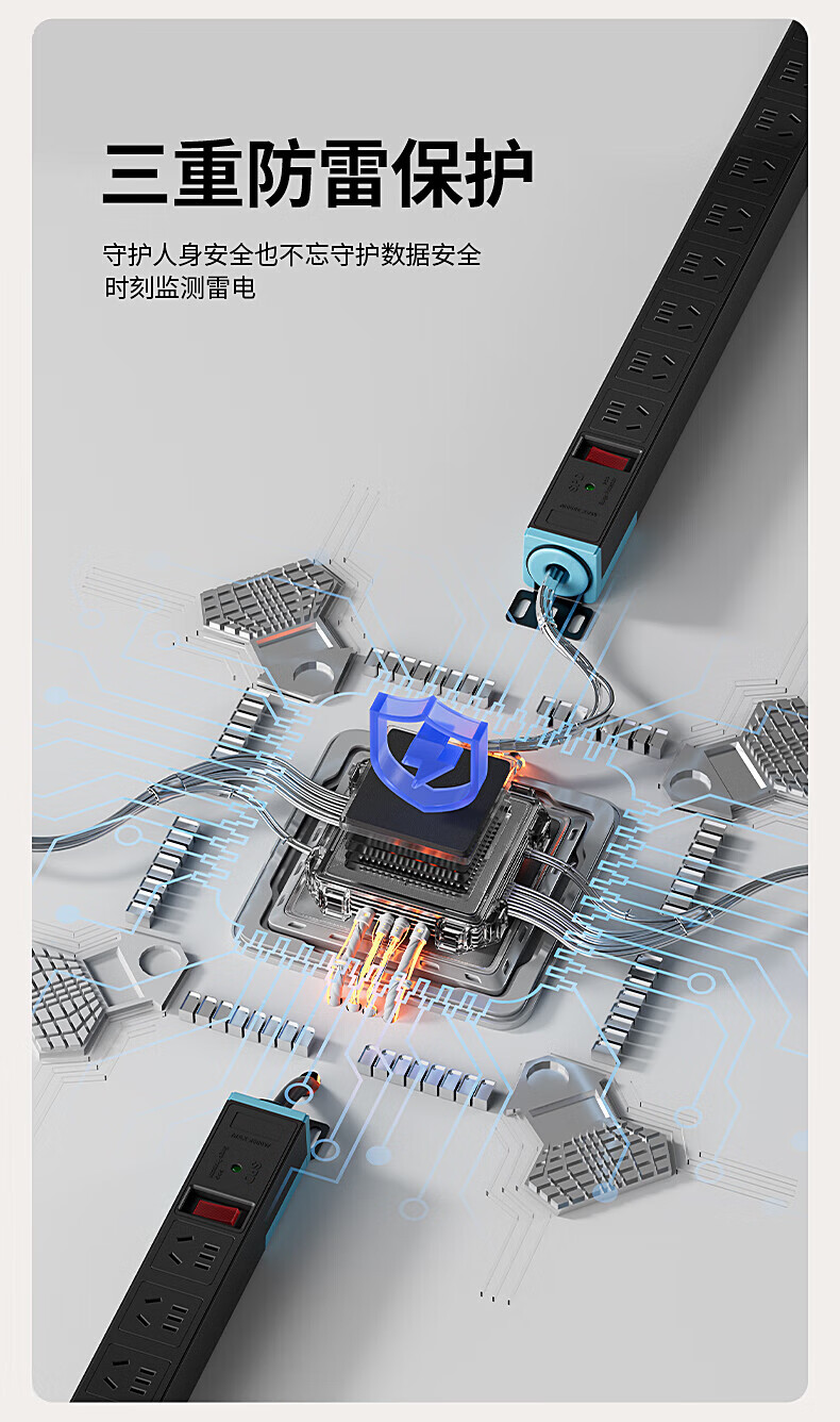 FDD国际电工PDU机柜排插机房插座过载保护新国标防雷接线板桌下家用电竞插座 六位过载保护插座(白色) 不带线
