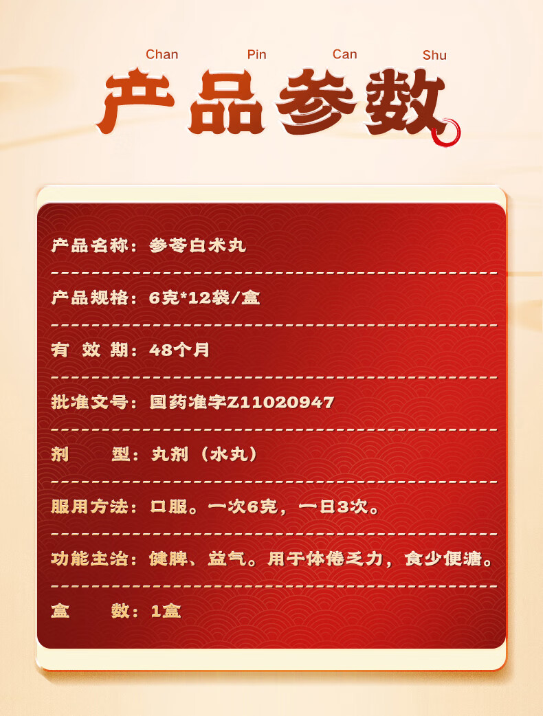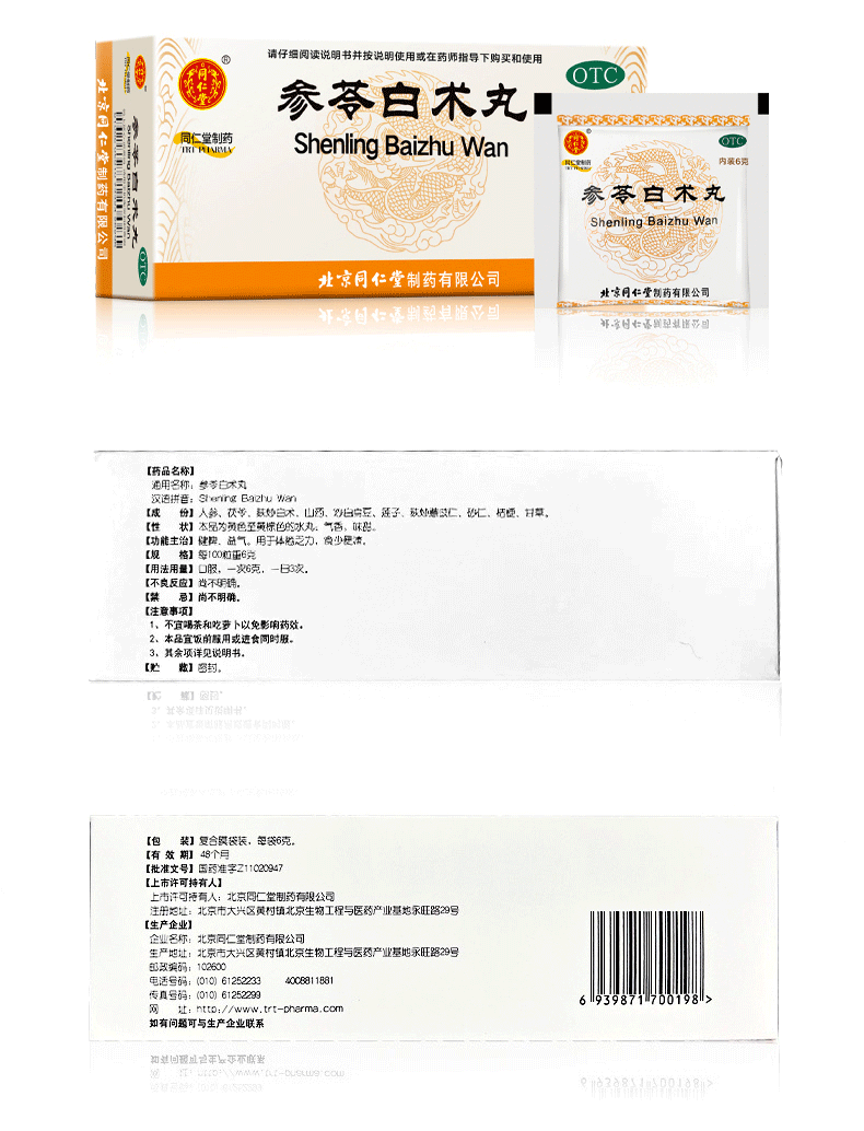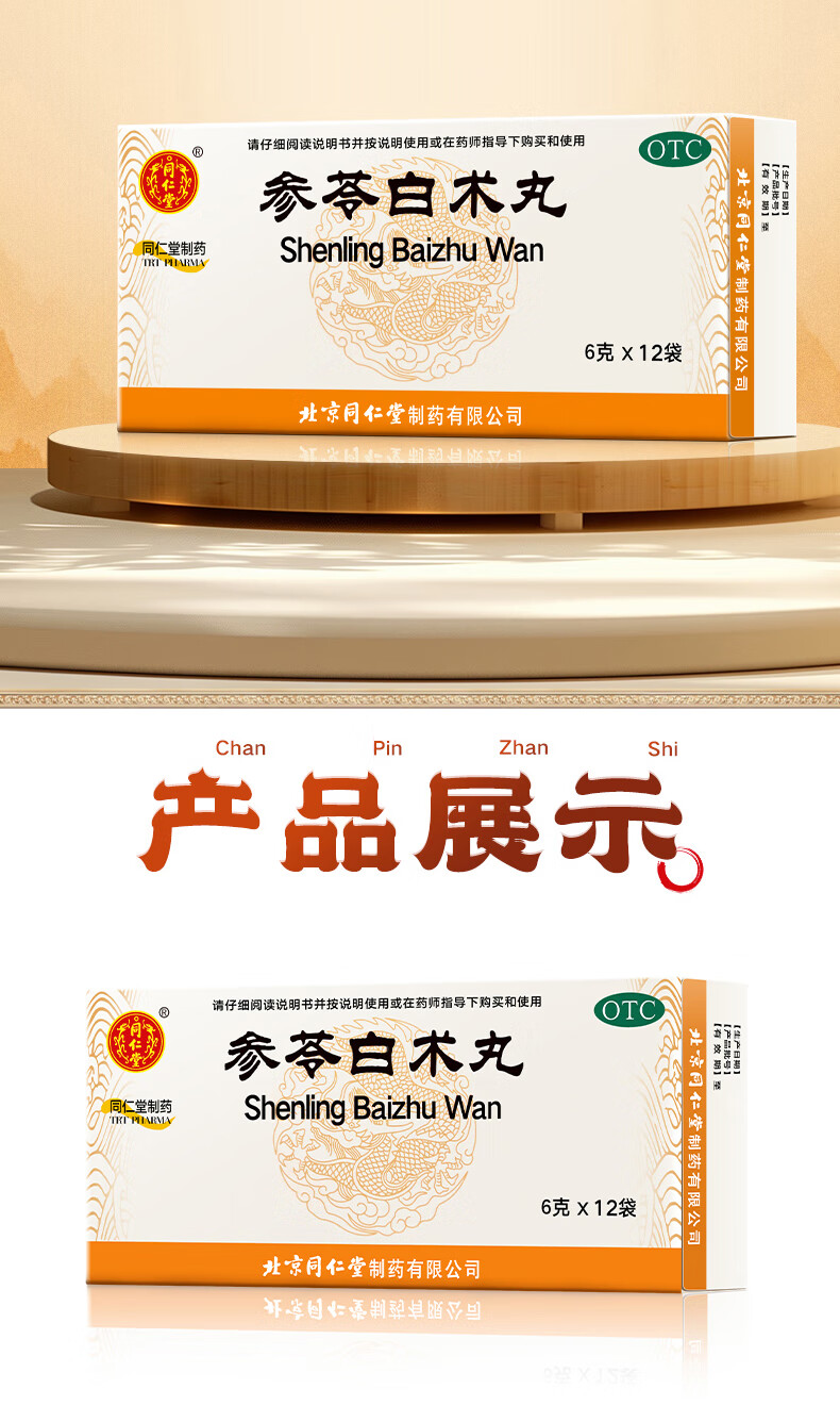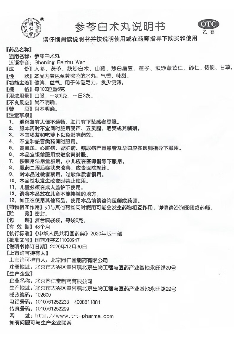 同仁堂 参苓白术丸6g*12袋*1盒 健脾 益气 用于体倦乏力 食少便溏