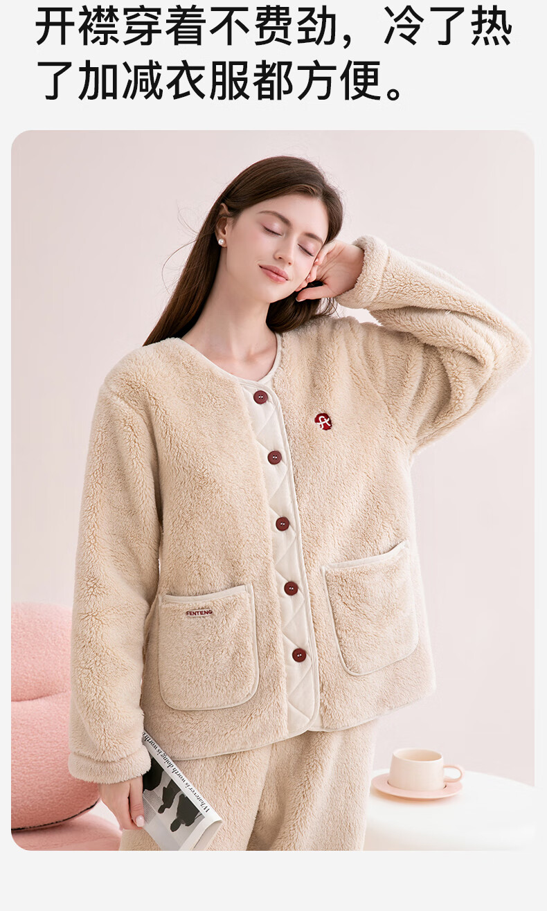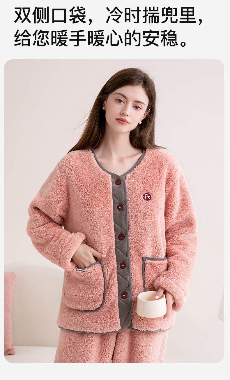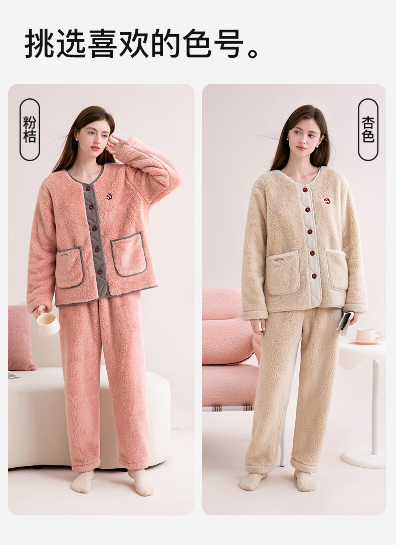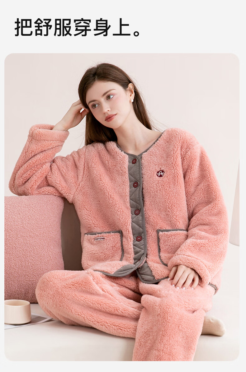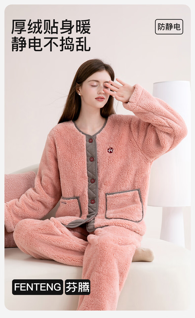 芬腾睡衣女2025秋冬新款防静电双面暖绒加厚绒女长袖家居服套装睡衣 粉桔 S
