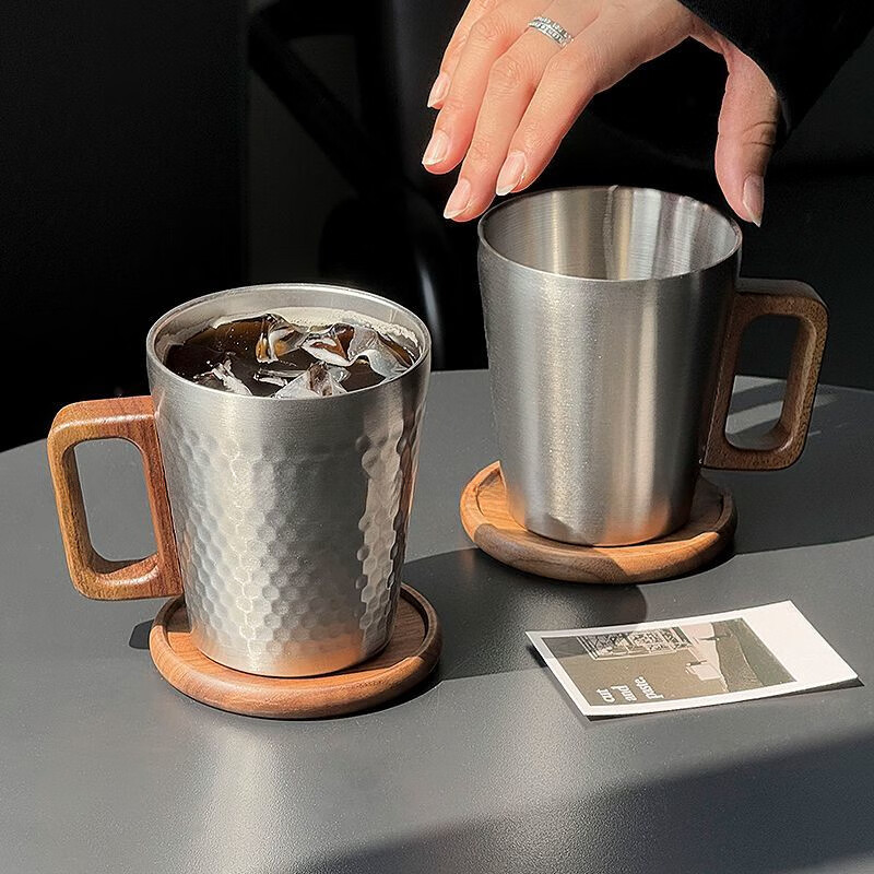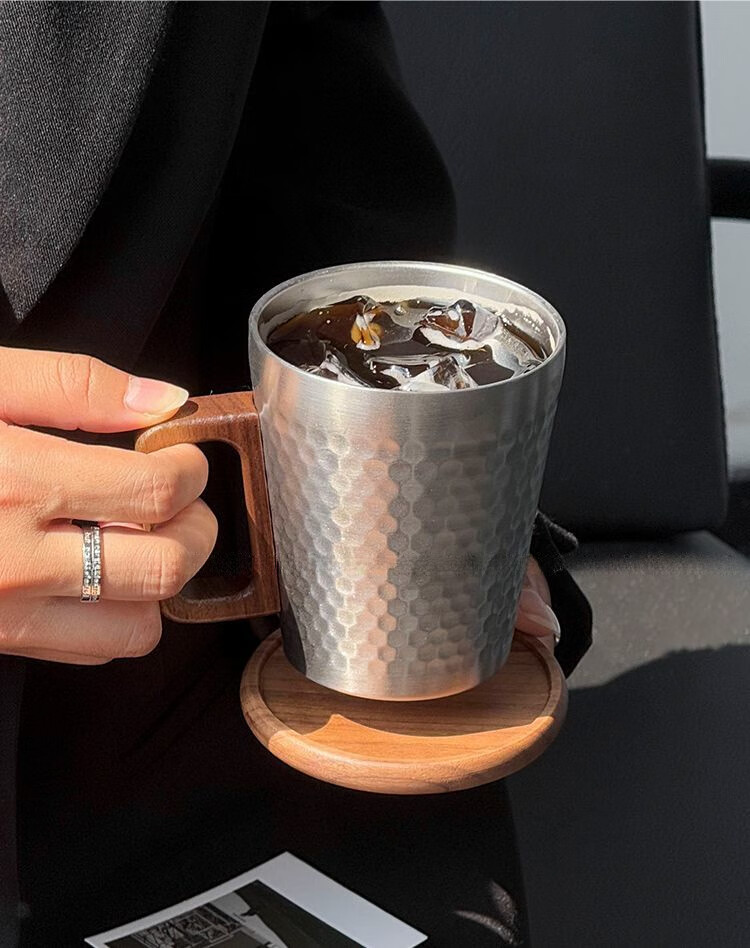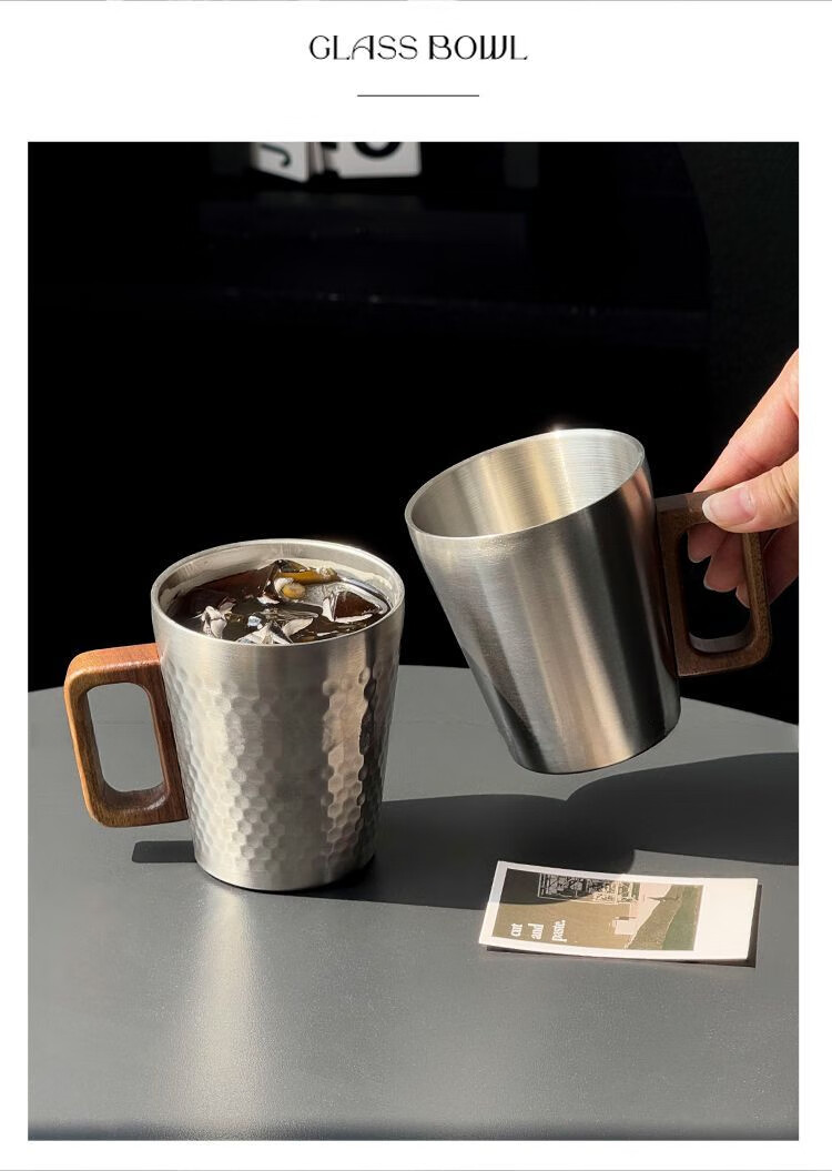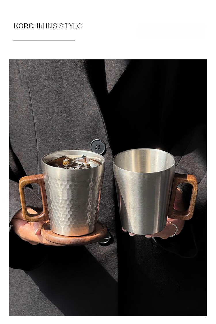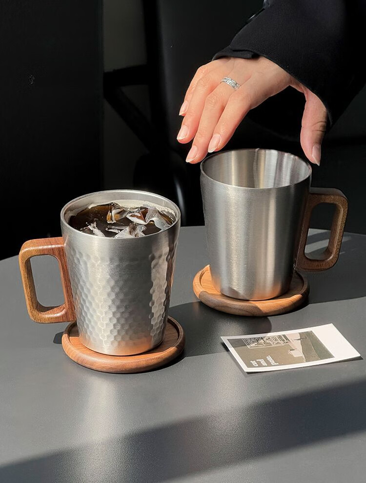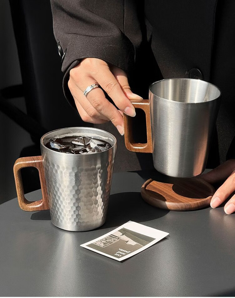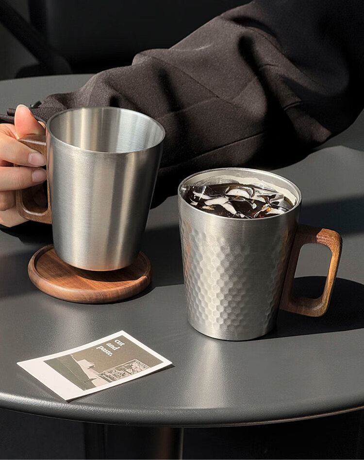 简漾工业风304不锈钢马克杯木柄咖啡杯水杯餐厅复古牛奶果汁杯啤酒杯 锤纹杯