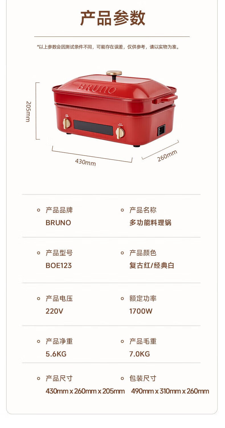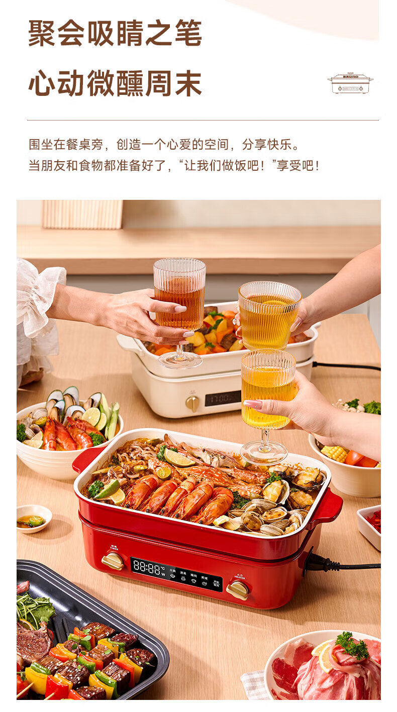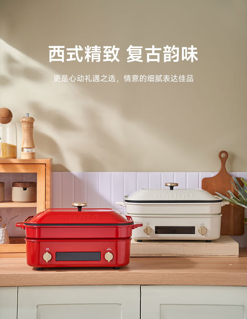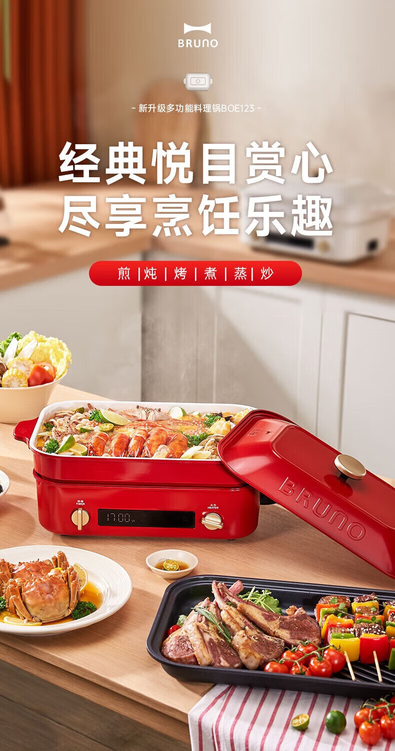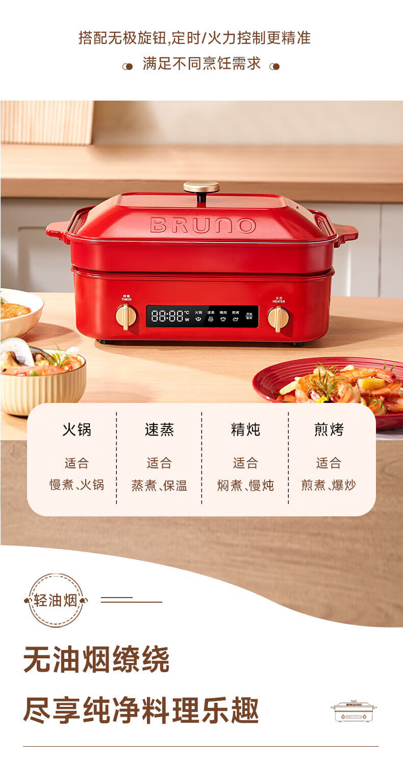 BRUNO第二代多功能料理锅电蒸锅电煮锅炖蒸煮一体电火锅专用炒煎涮家用鸳鸯锅电烤肉锅不粘多用途分体式 5L 复古红【平底烤盘标配】