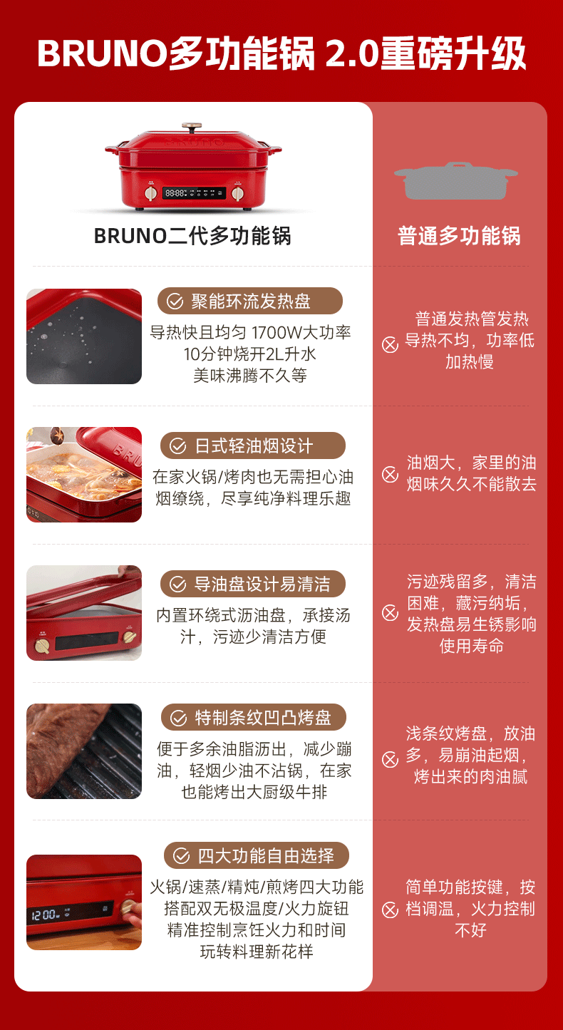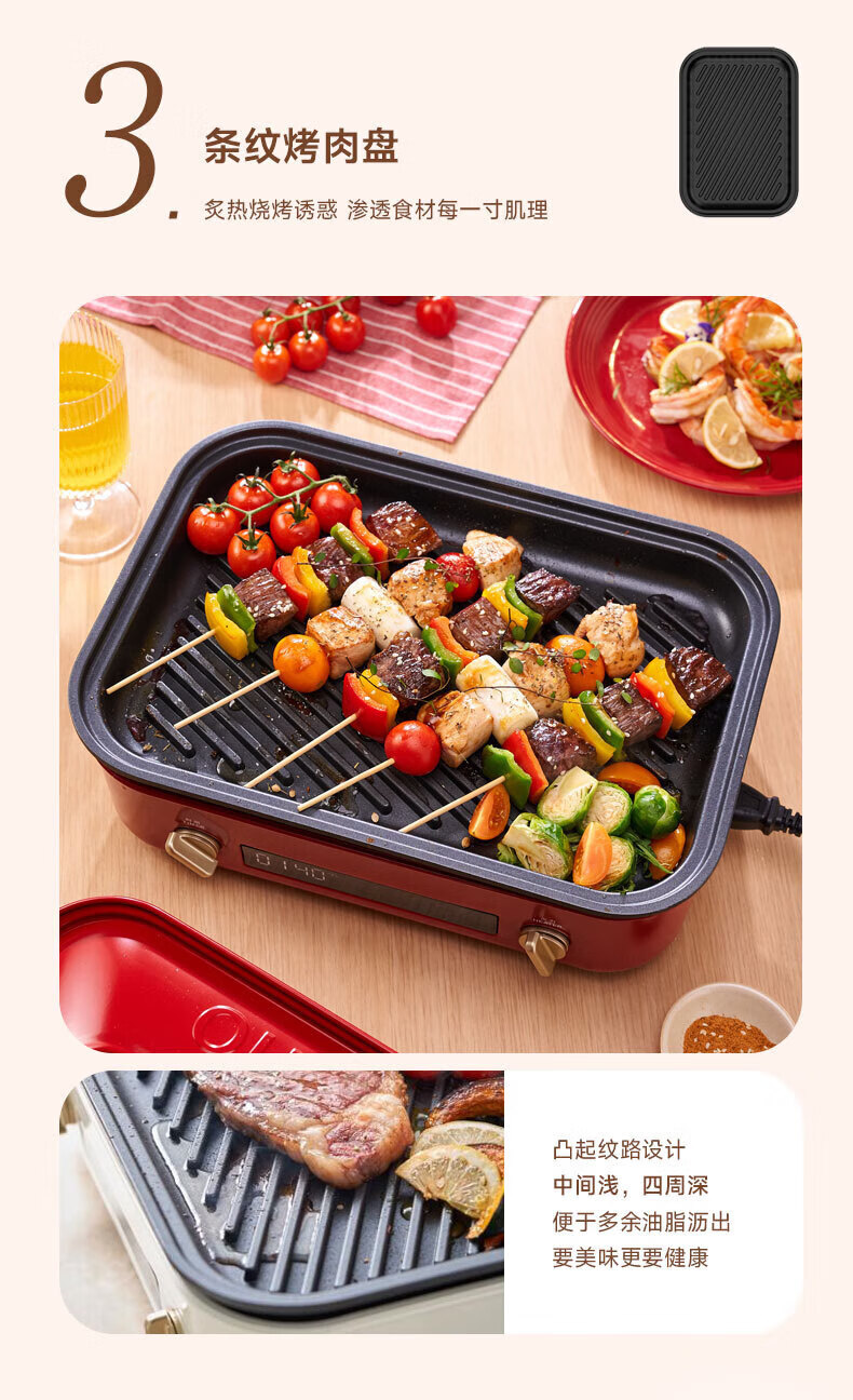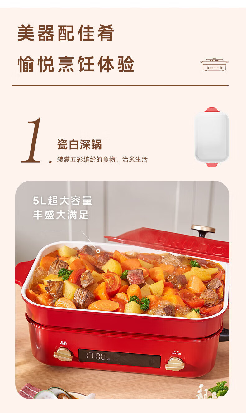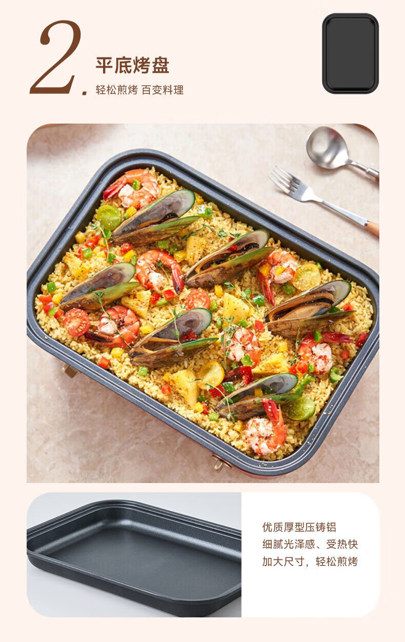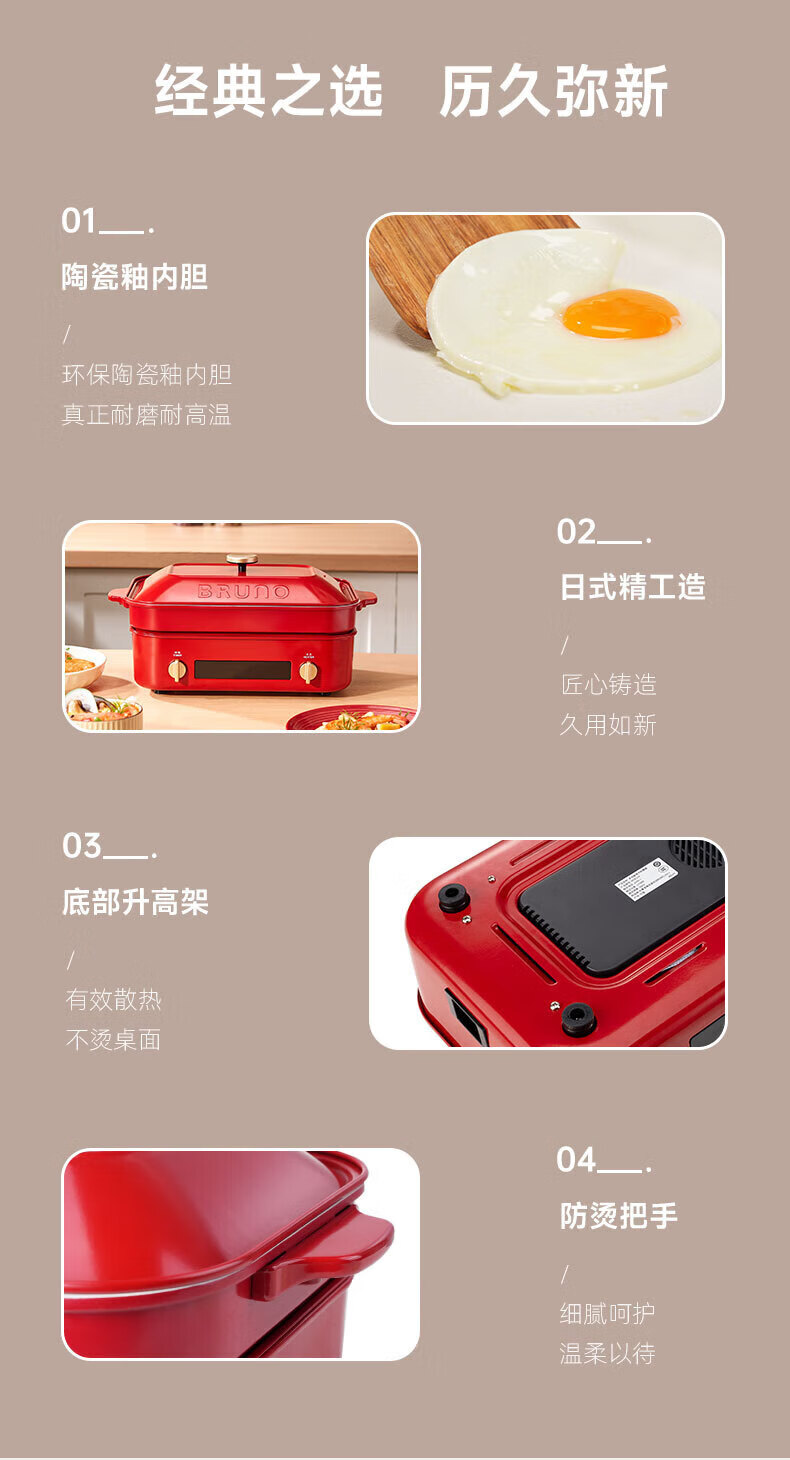 BRUNO第二代多功能料理锅电蒸锅电煮锅炖蒸煮一体电火锅专用炒煎涮家用鸳鸯锅电烤肉锅不粘多用途分体式 5L 复古红【平底烤盘标配】