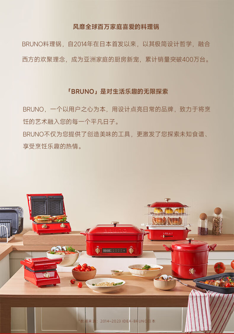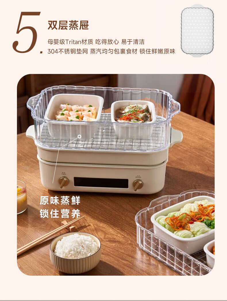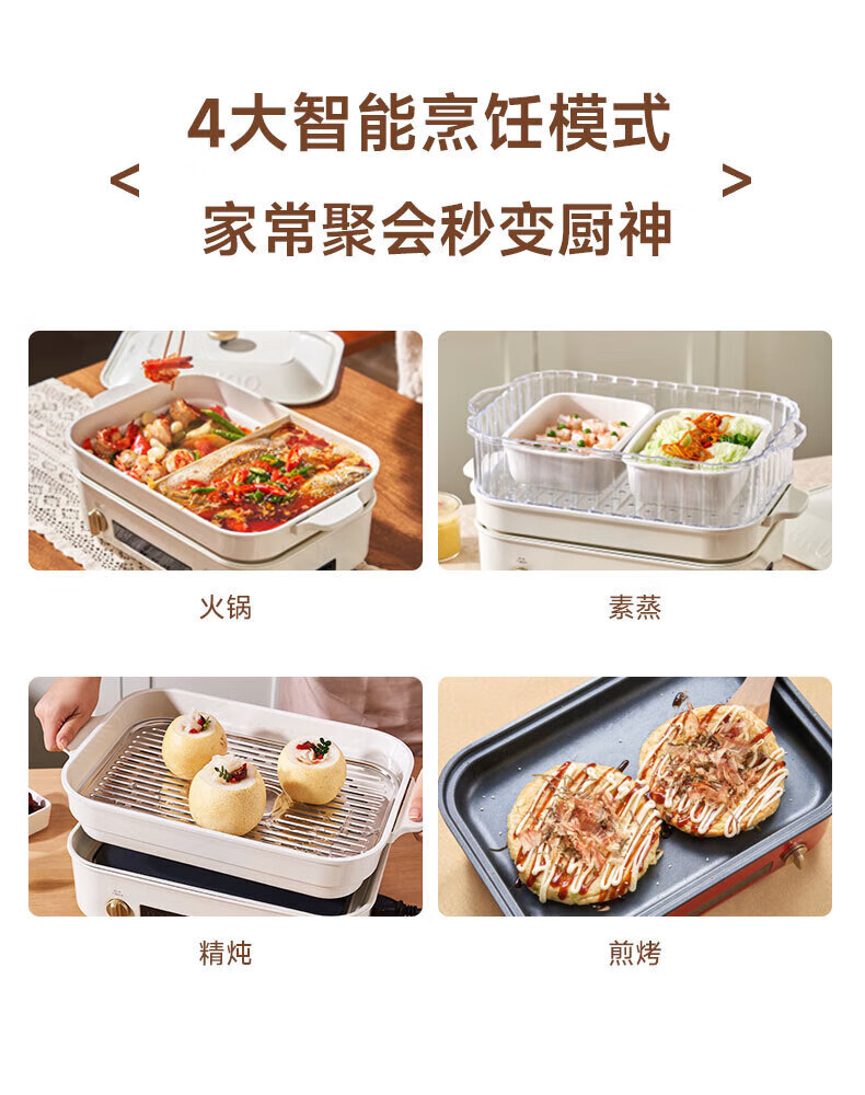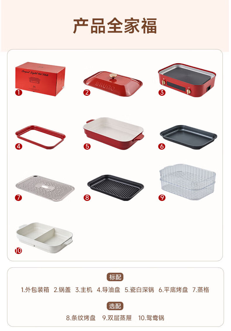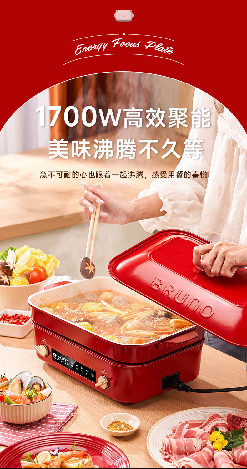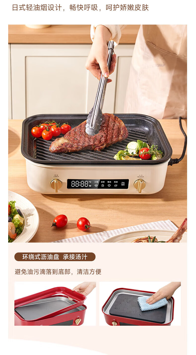 BRUNO第二代多功能料理锅电蒸锅电煮锅炖蒸煮一体电火锅专用炒煎涮家用鸳鸯锅电烤肉锅不粘多用途分体式 5L 复古红【平底烤盘标配】