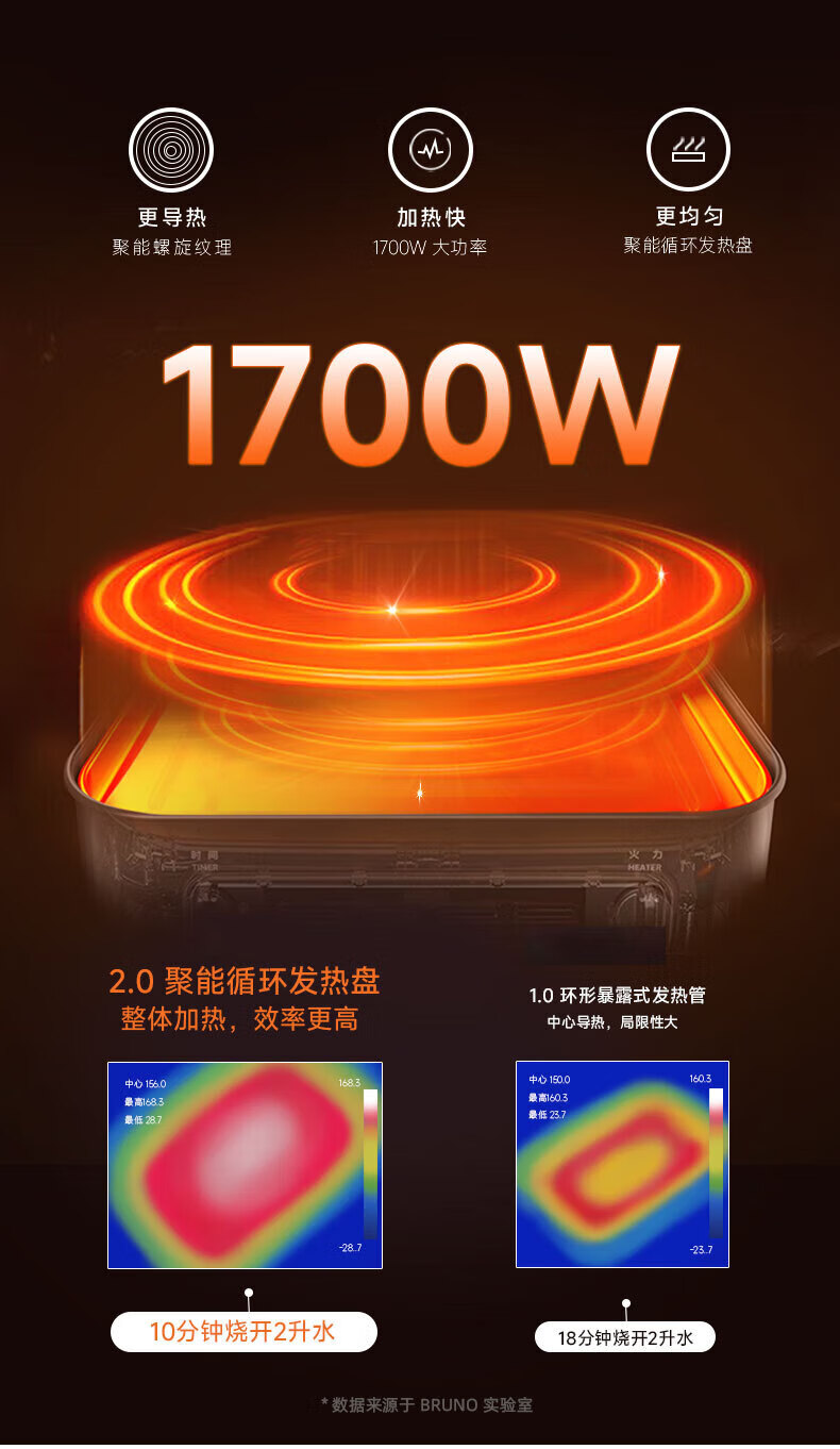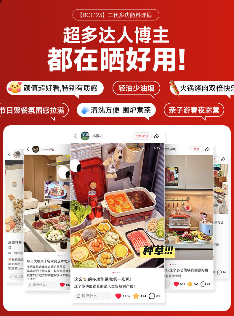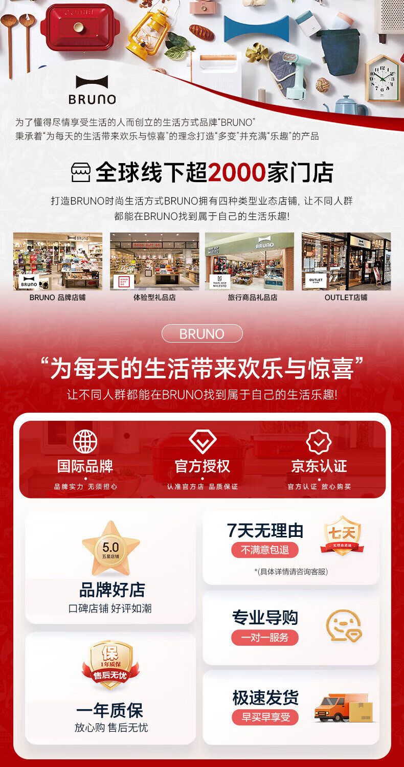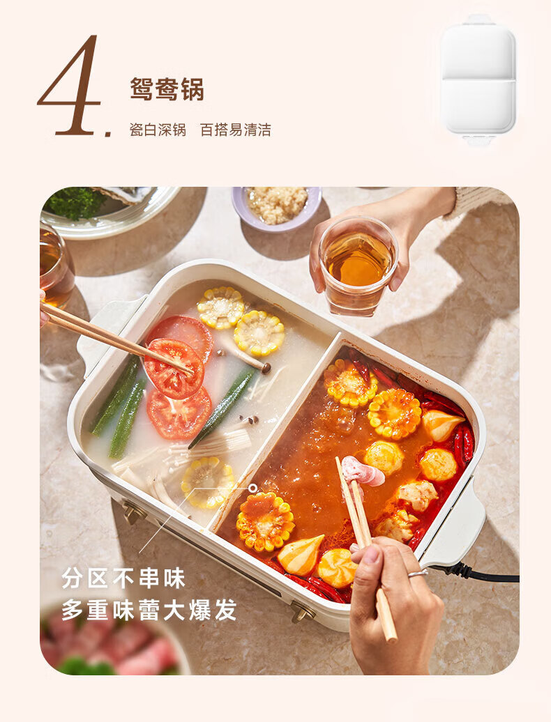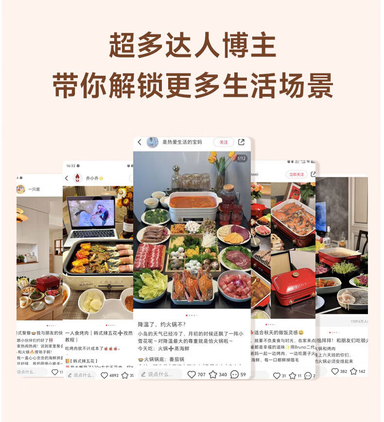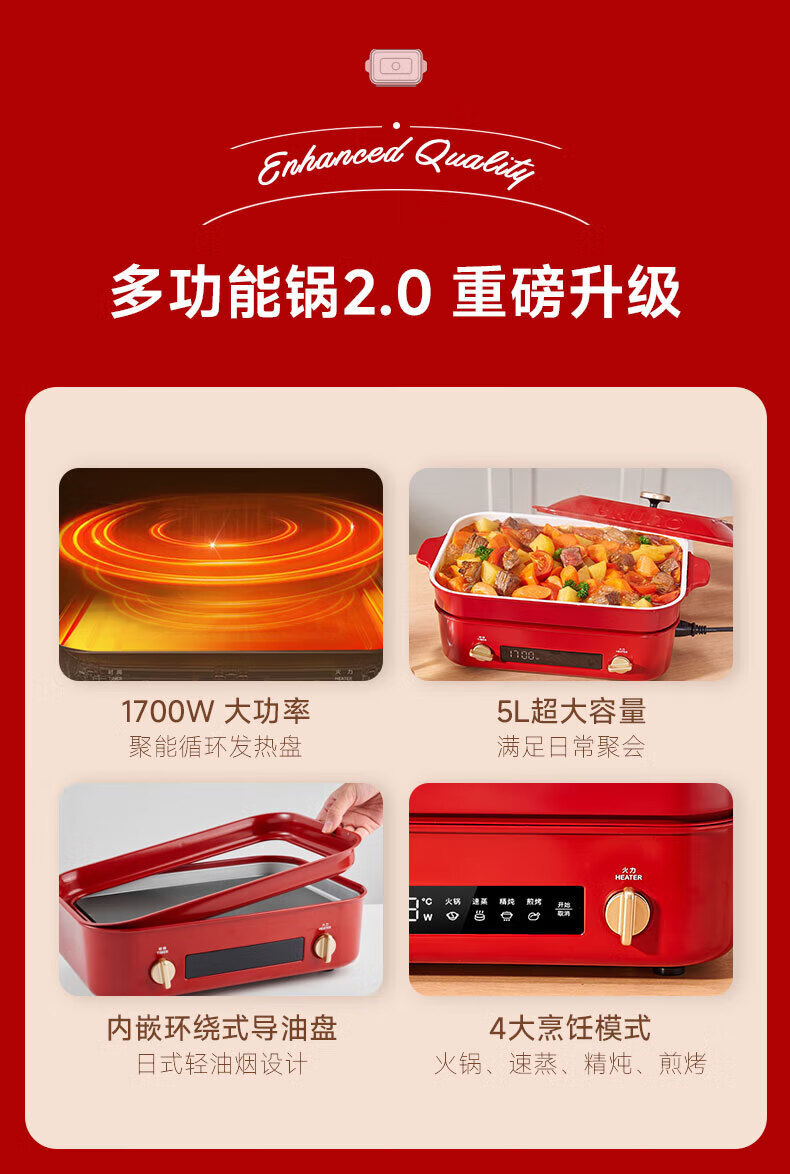 BRUNO第二代多功能料理锅电蒸锅电煮锅炖蒸煮一体电火锅专用炒煎涮家用鸳鸯锅电烤肉锅不粘多用途分体式 5L 复古红【平底烤盘标配】