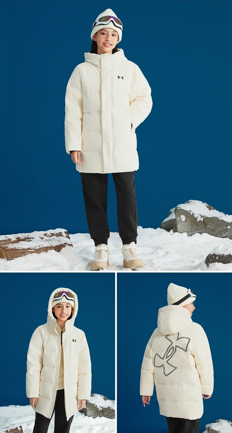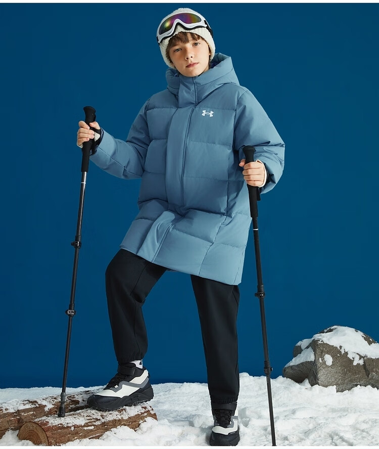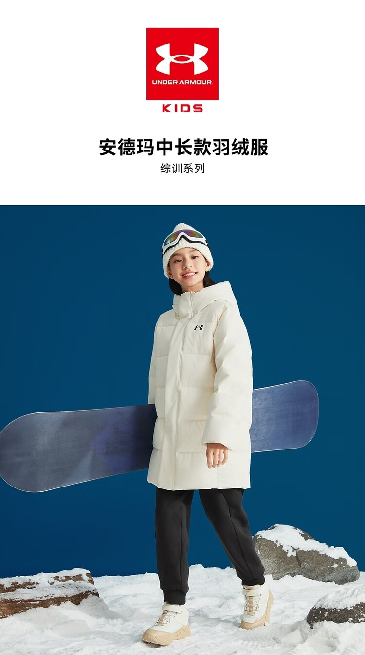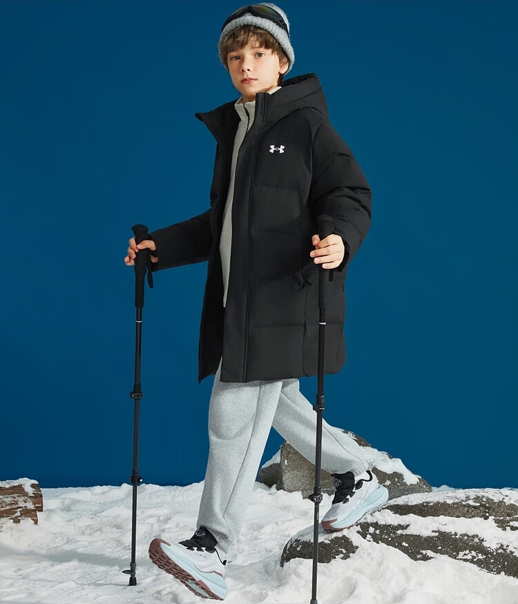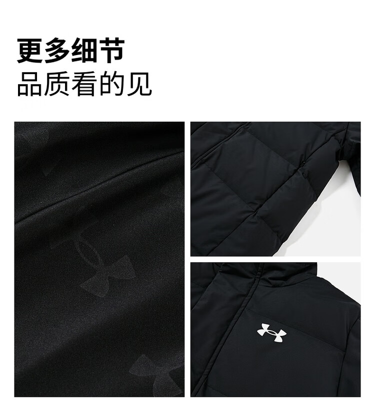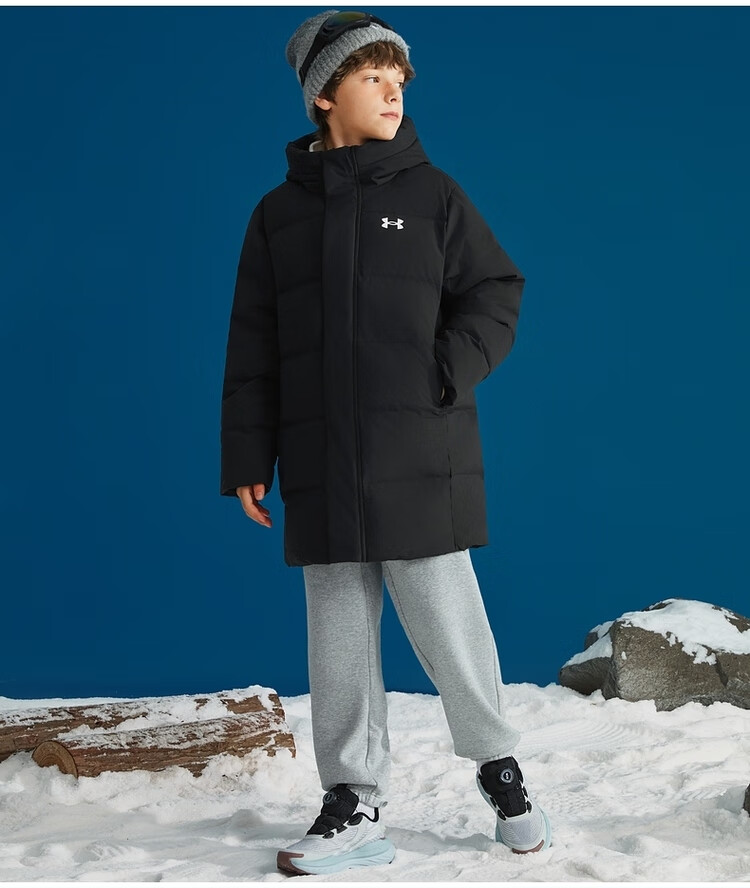UNDER ARMOUR安德玛童装秋冬25新款大童连帽简约风中长款羽绒服儿童保暖外套 黑色 170