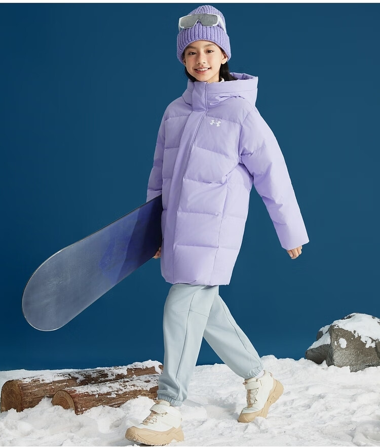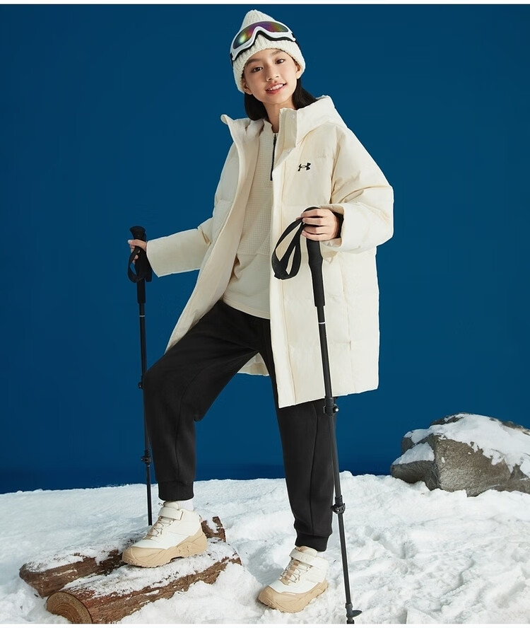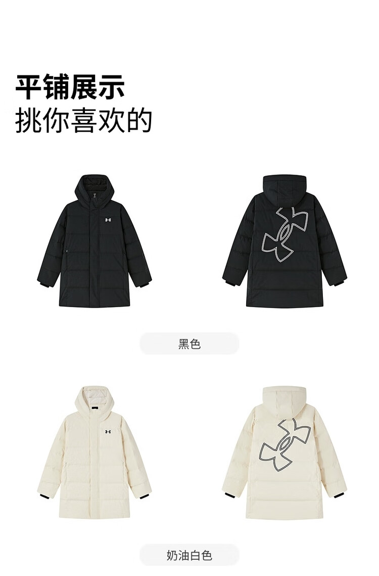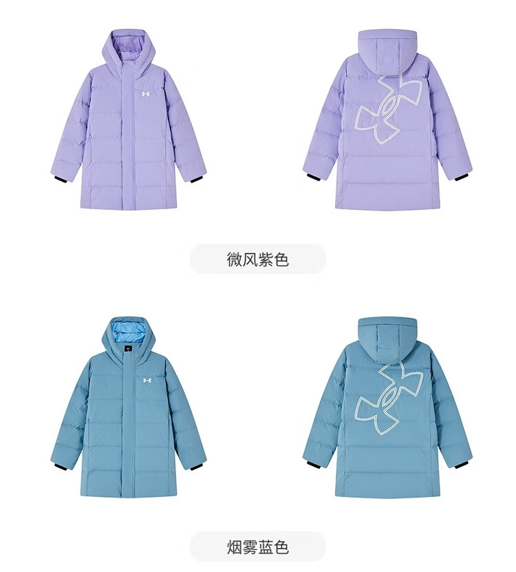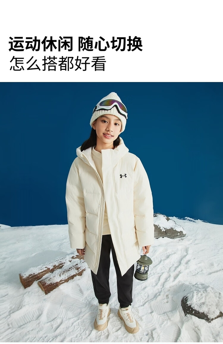 UNDER ARMOUR安德玛童装秋冬25新款大童连帽简约风中长款羽绒服儿童保暖外套 黑色 170
