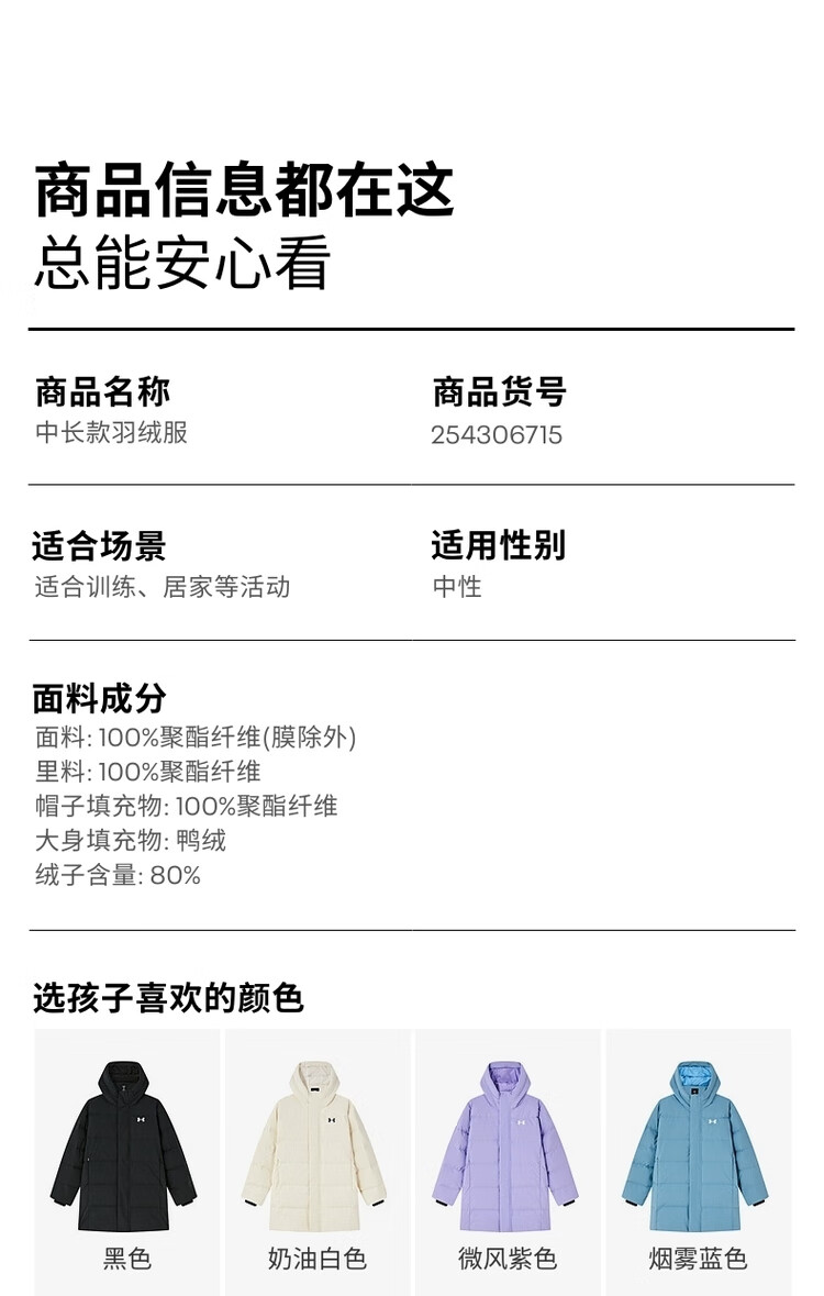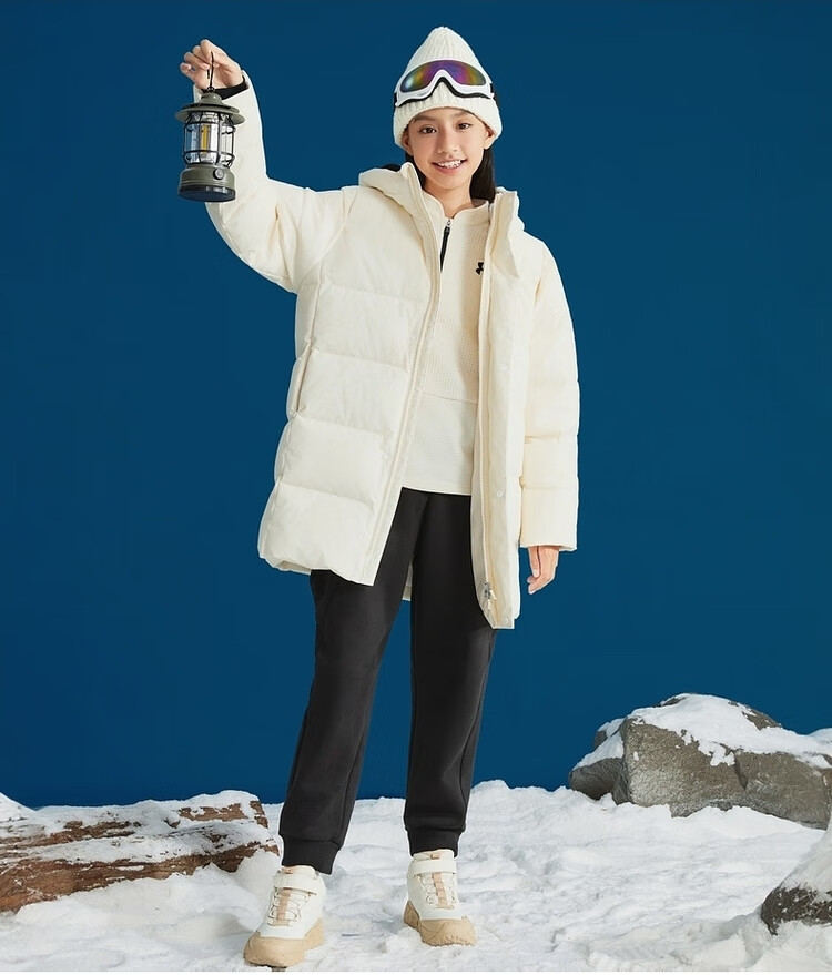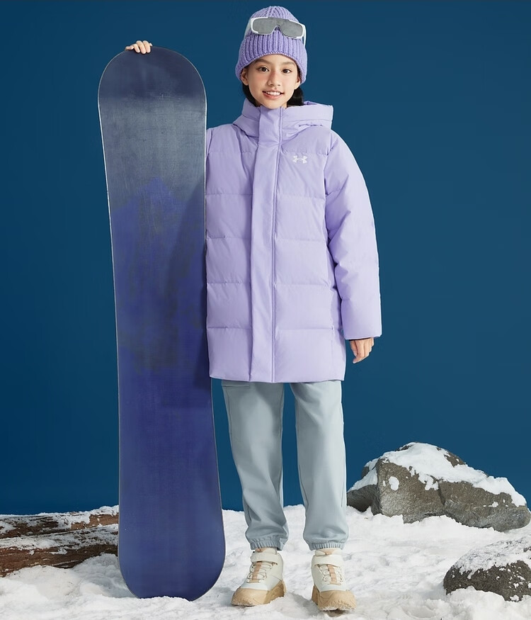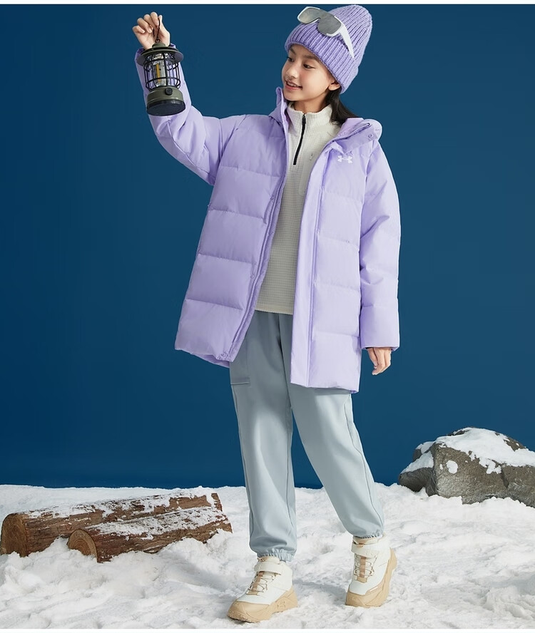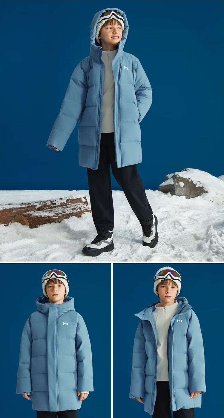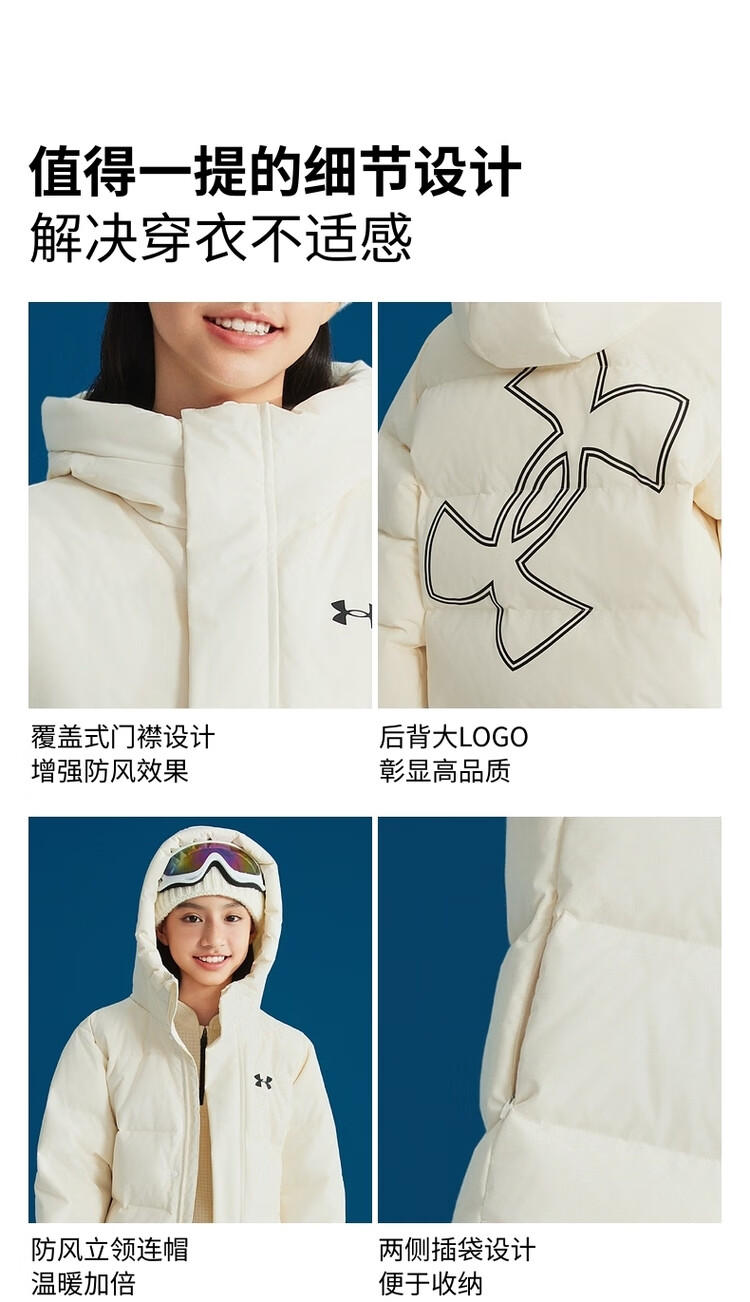 UNDER ARMOUR安德玛童装秋冬25新款大童连帽简约风中长款羽绒服儿童保暖外套 黑色 170