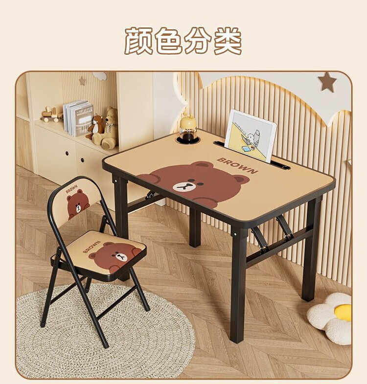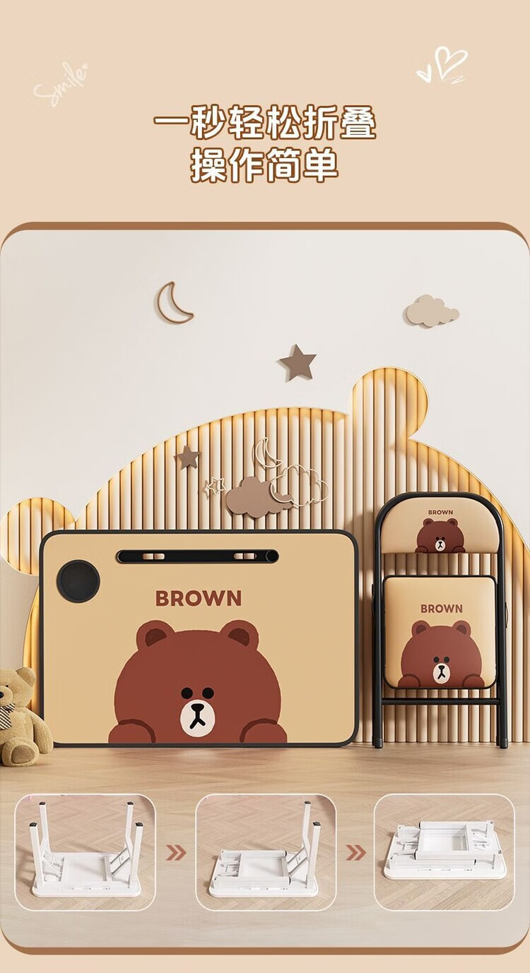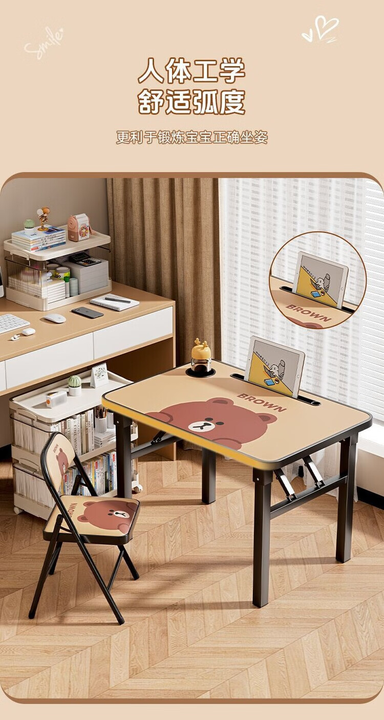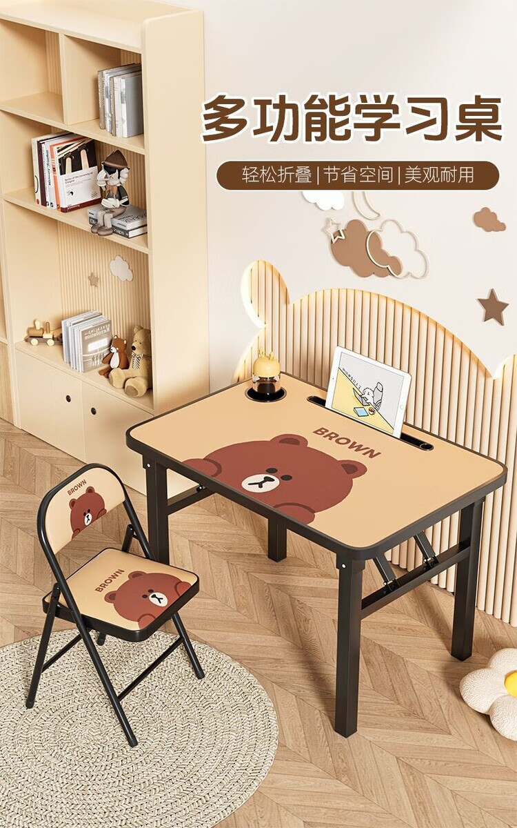 弘星隆新款布朗熊正版权儿童学习桌椅套装免安装可折叠小书桌学生写字桌 布朗熊 【学习桌】可折叠免安装
