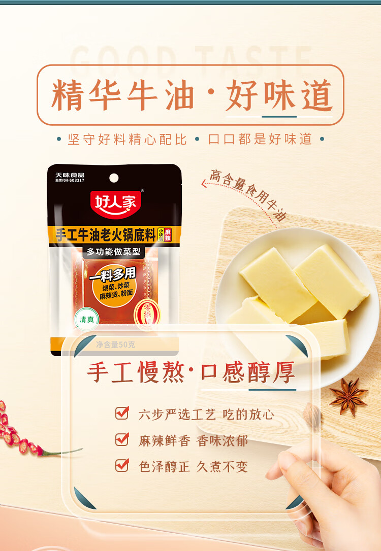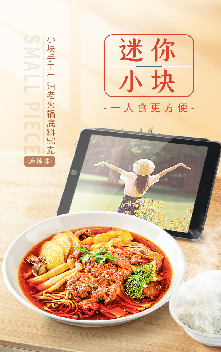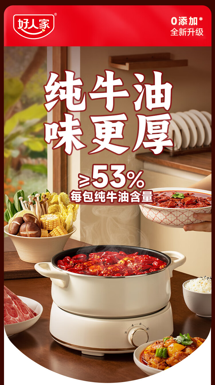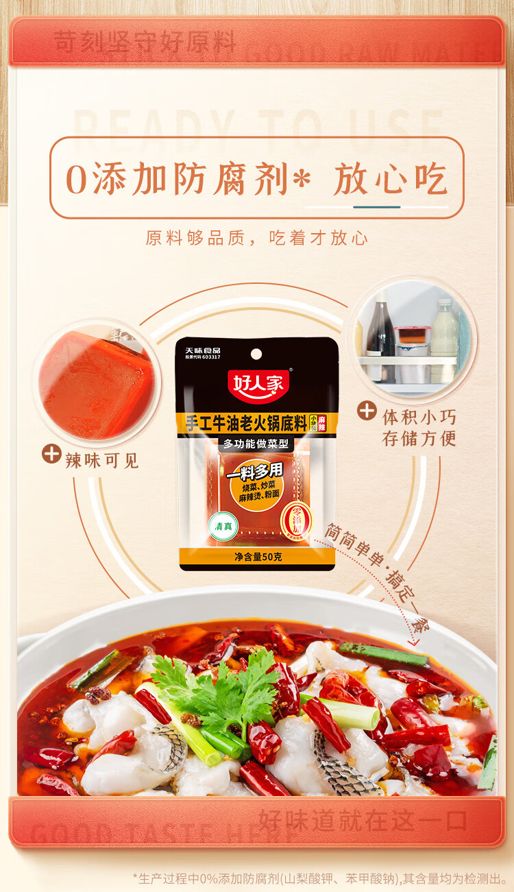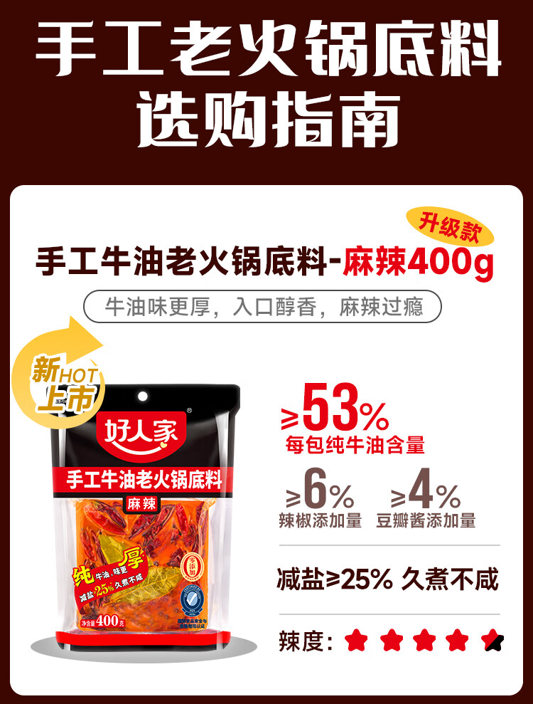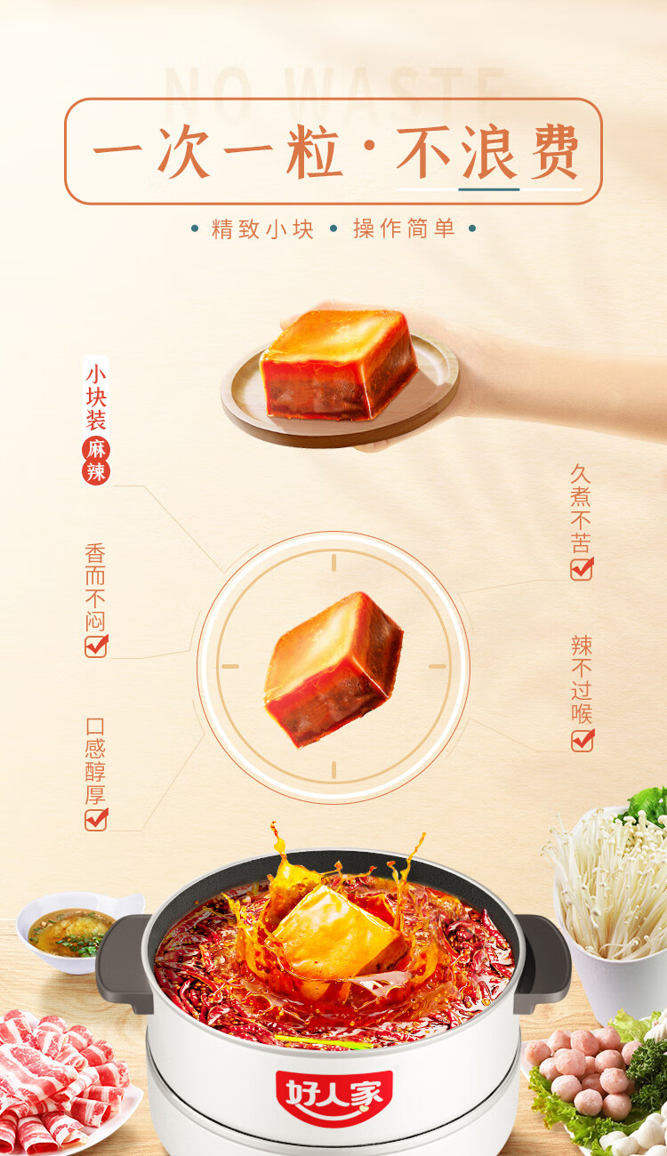 好人家0添加香辣牛油火锅底料煮火锅冒菜麻辣烫小块分装露营便携调料 手工火锅50g*5【多用途火锅料】