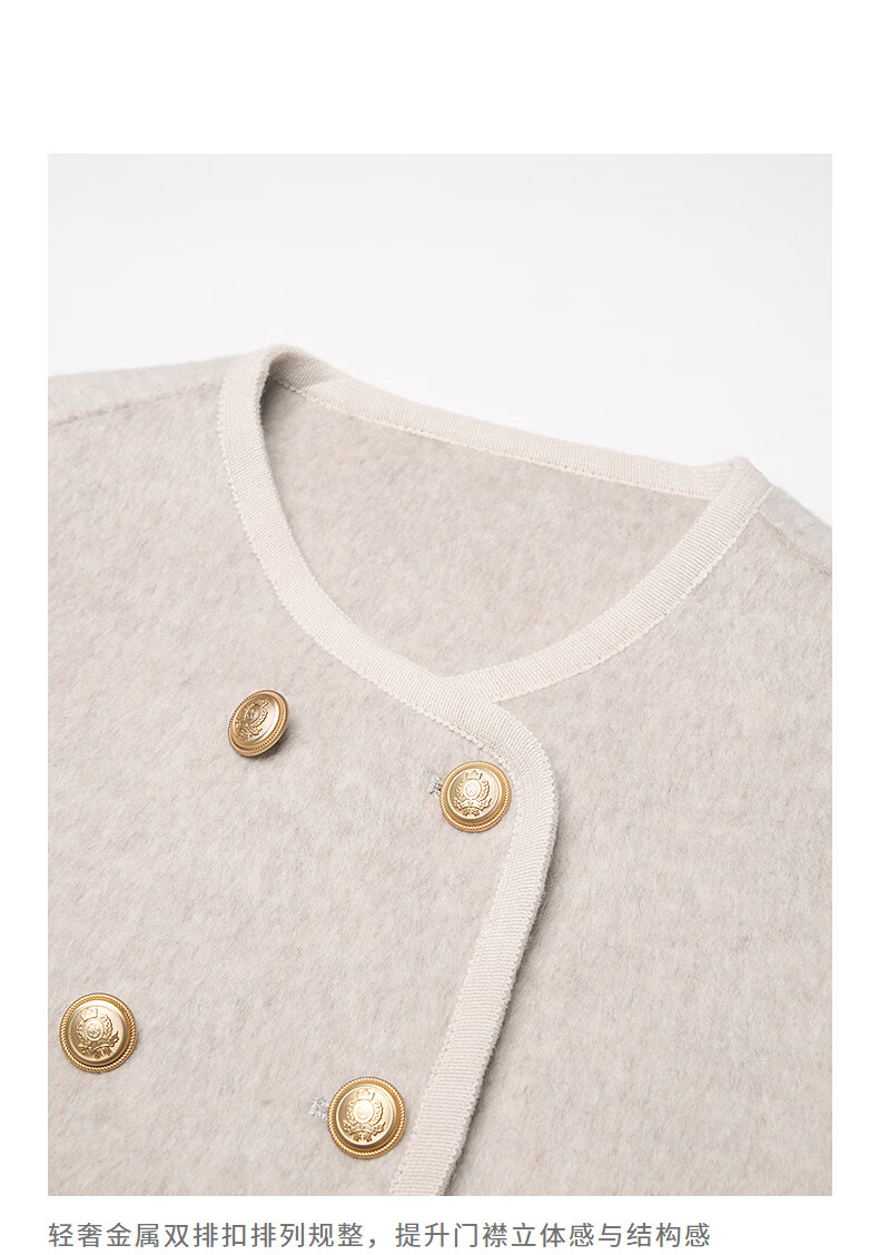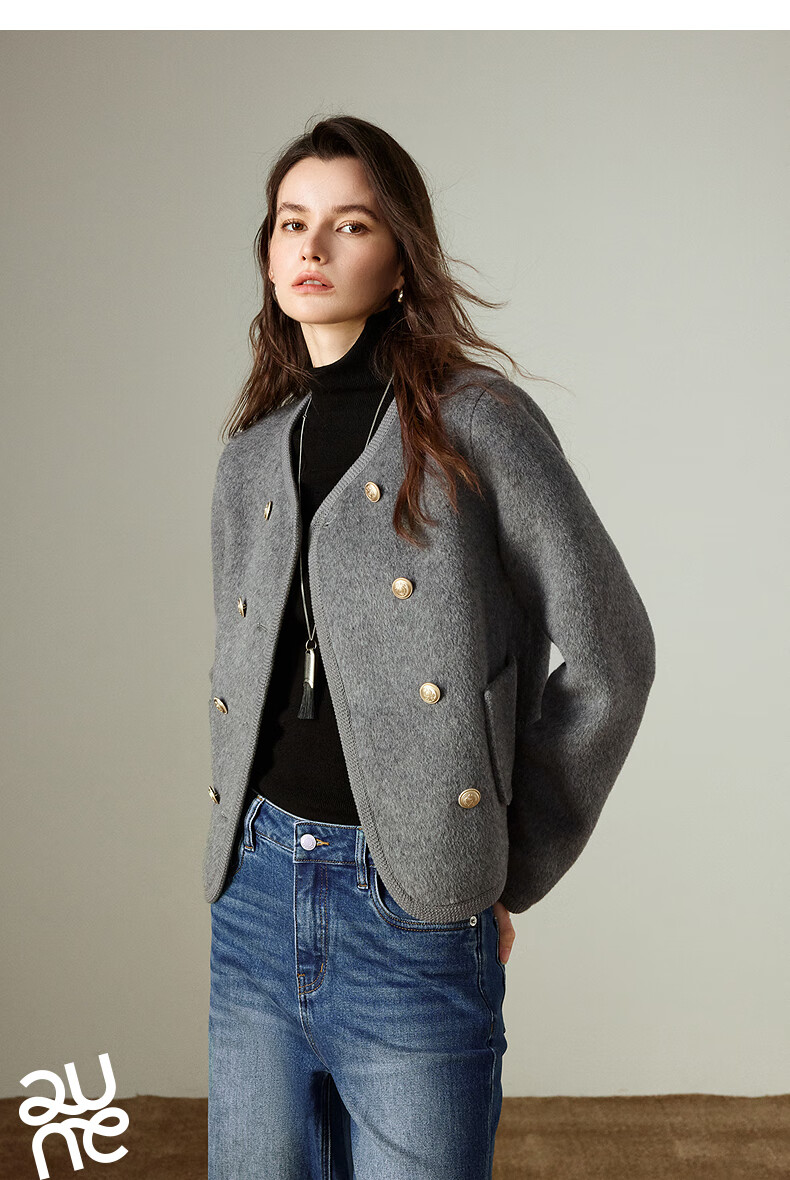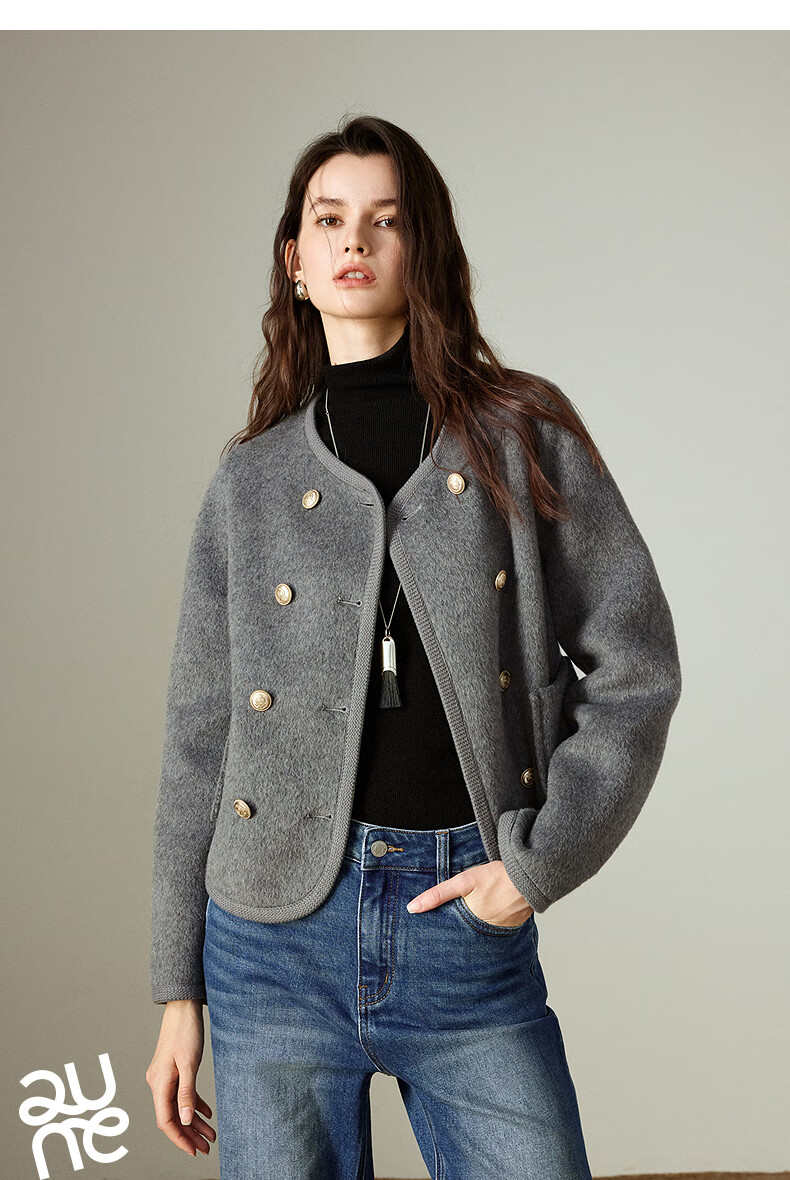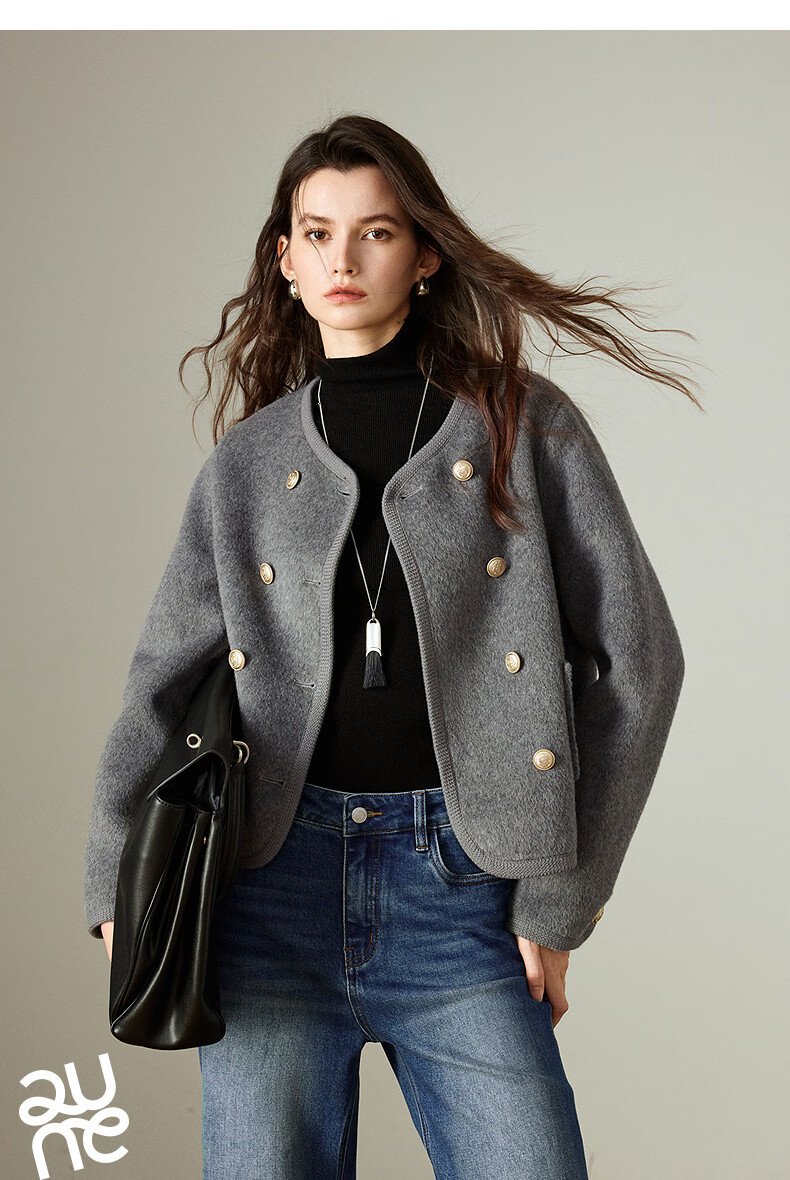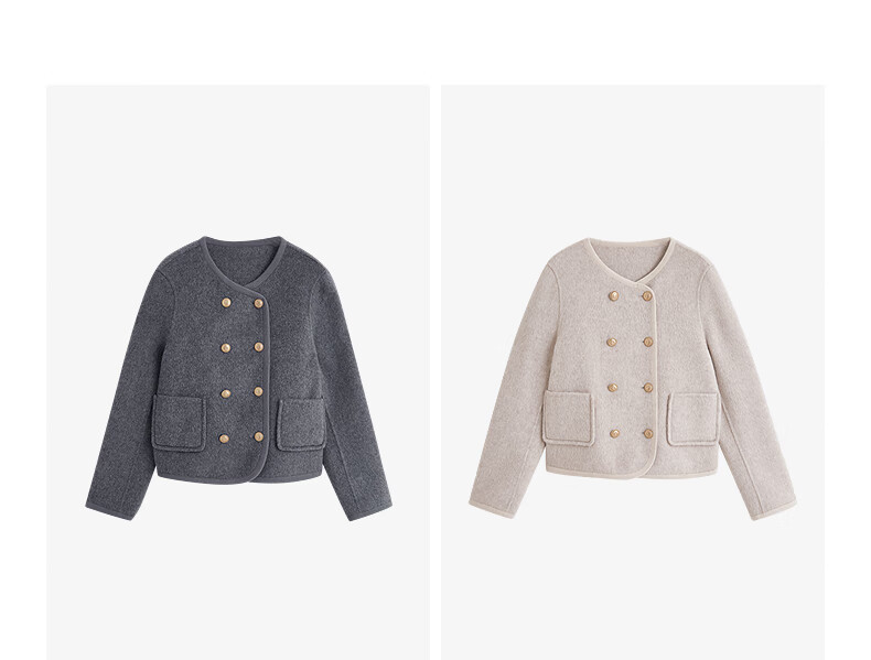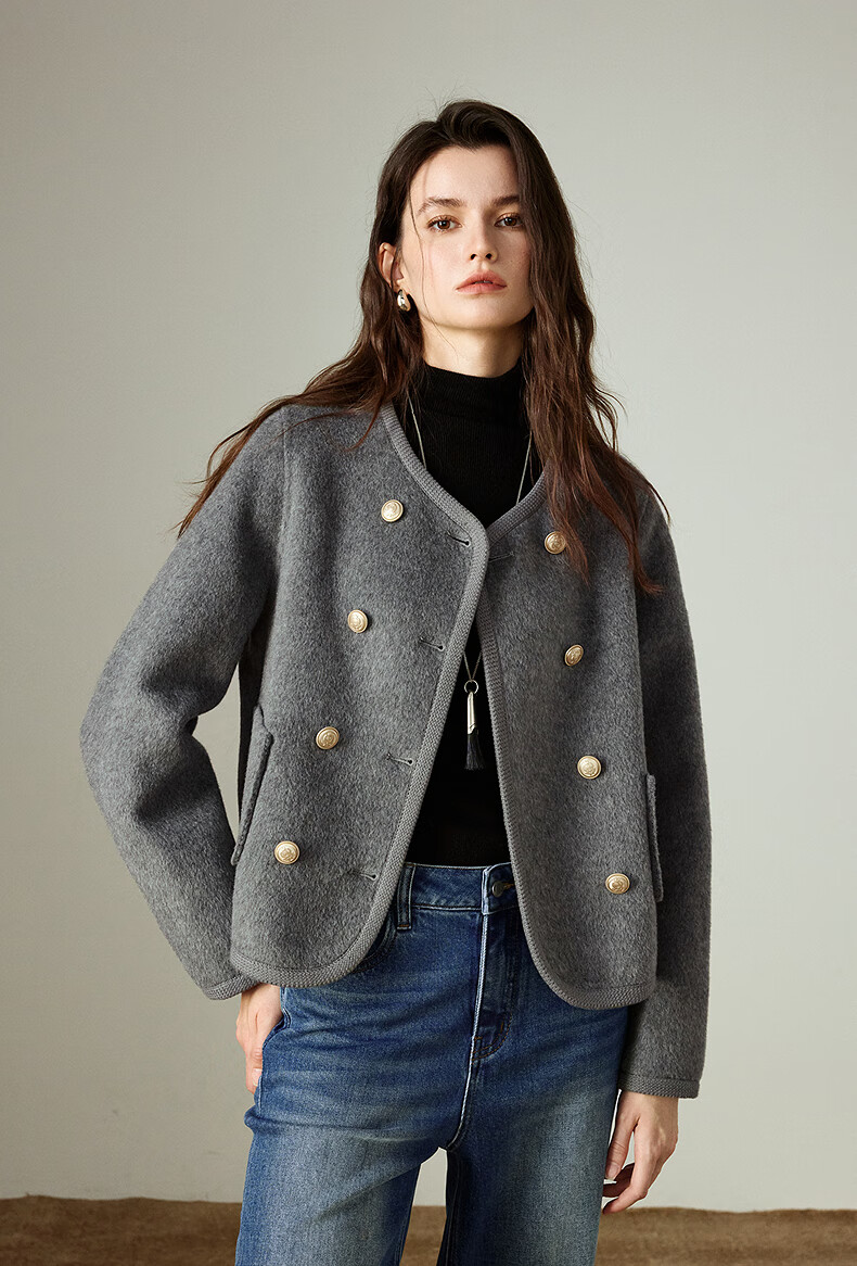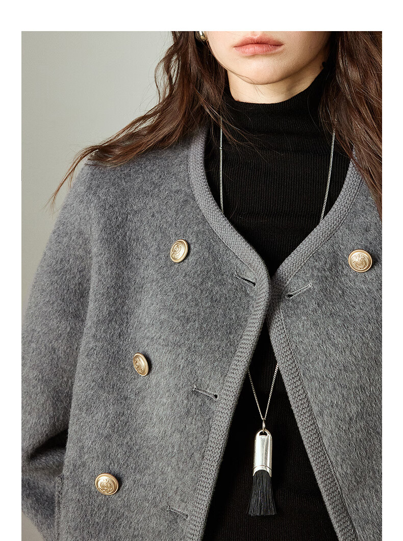 初语双面呢外套女2025秋季新款轻奢双排扣短款羊毛双面呢上衣 麻灰色 M