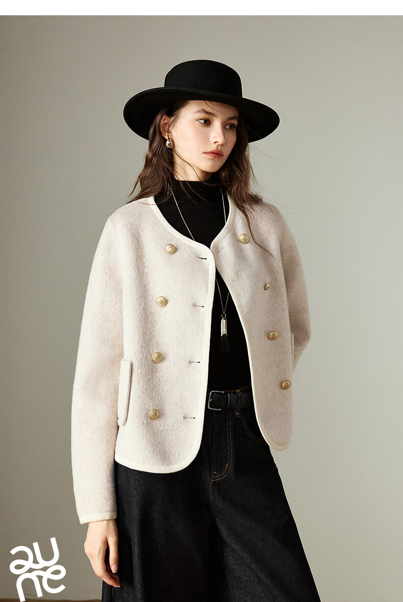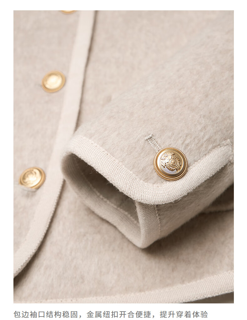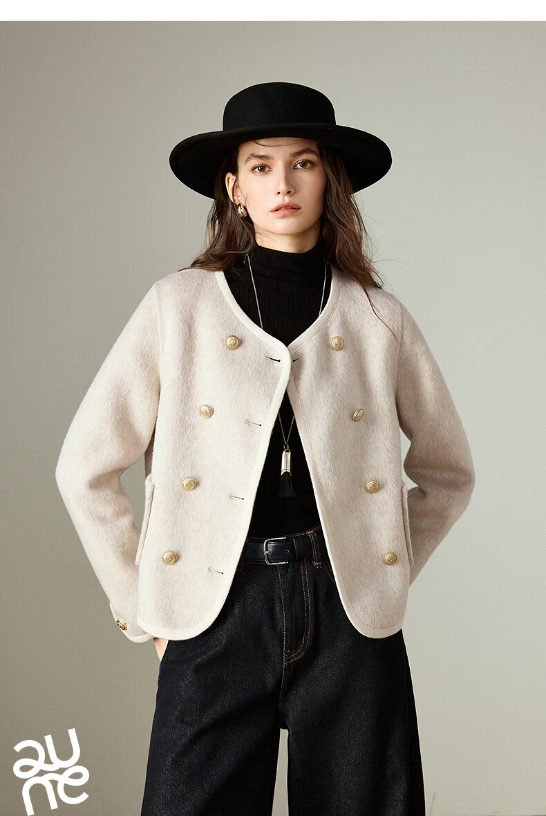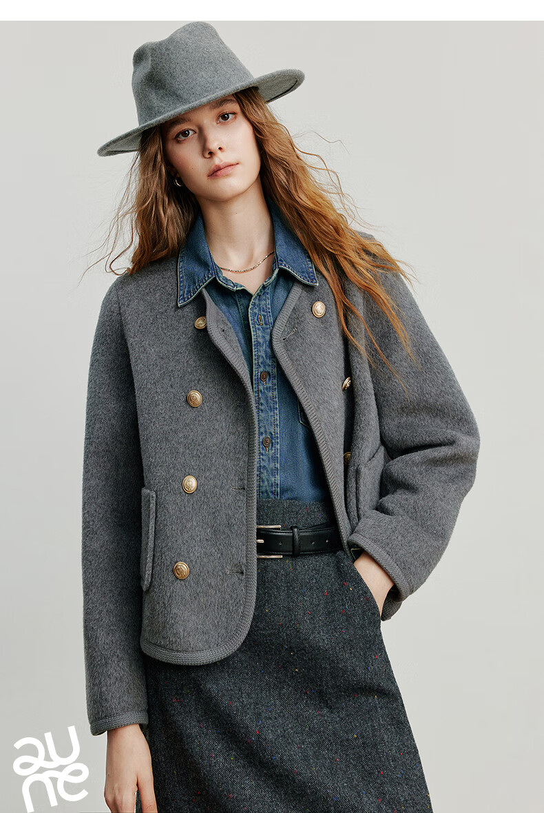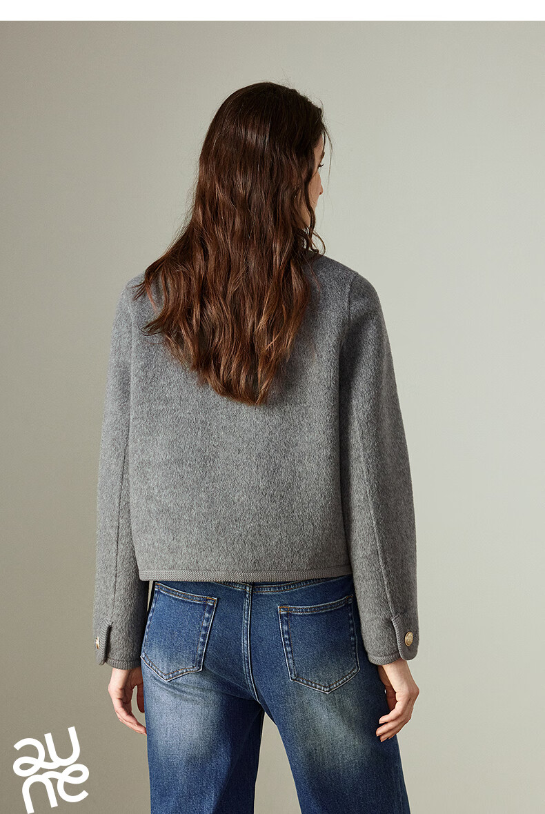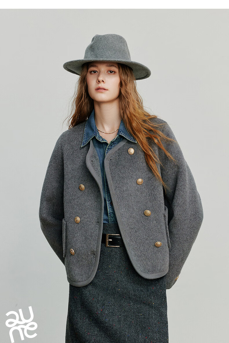 初语双面呢外套女2025秋季新款轻奢双排扣短款羊毛双面呢上衣 麻灰色 M
