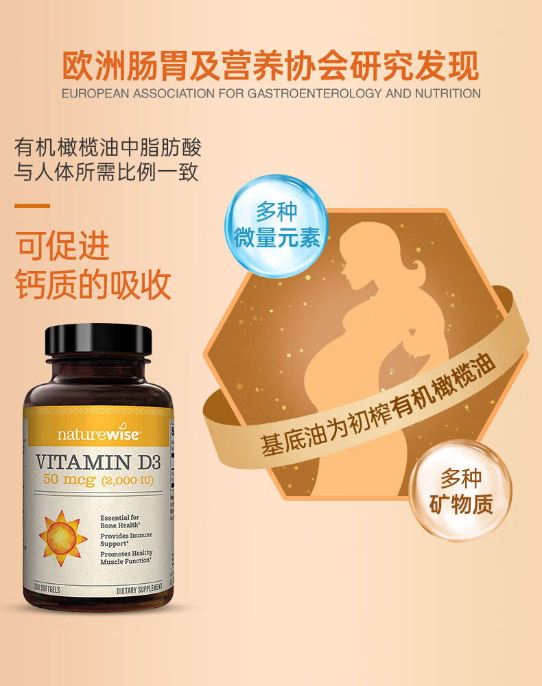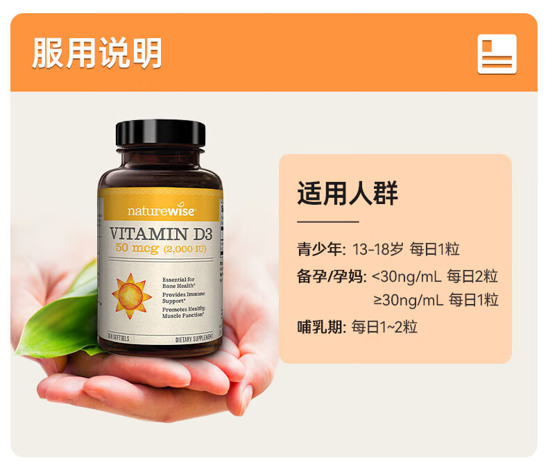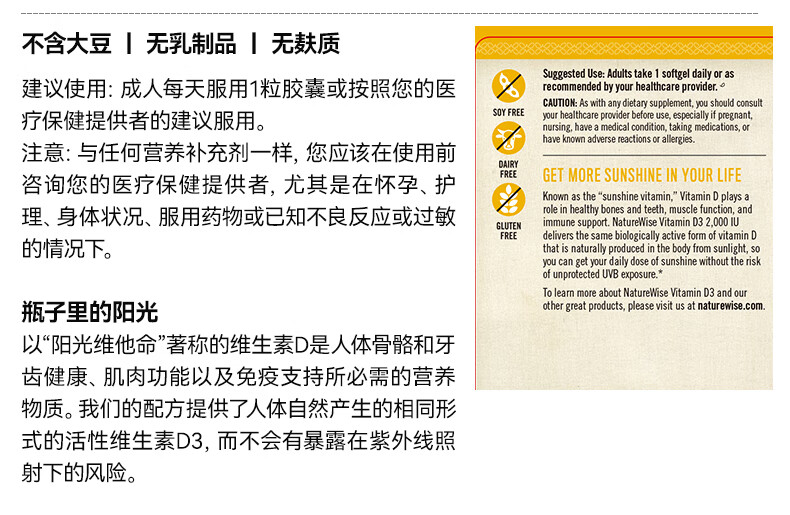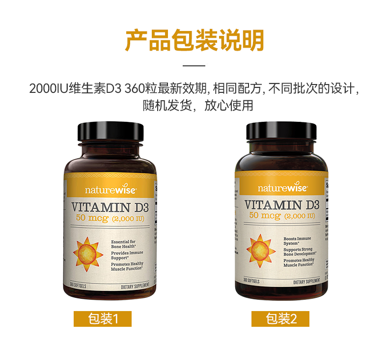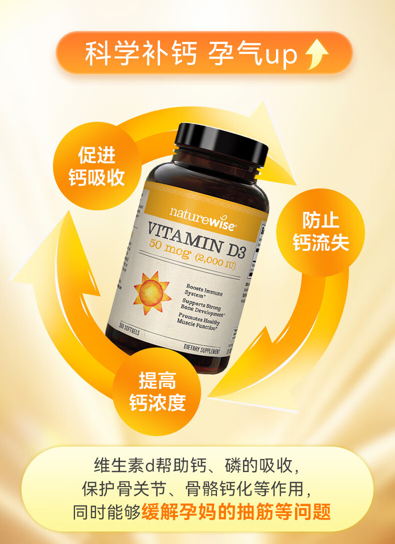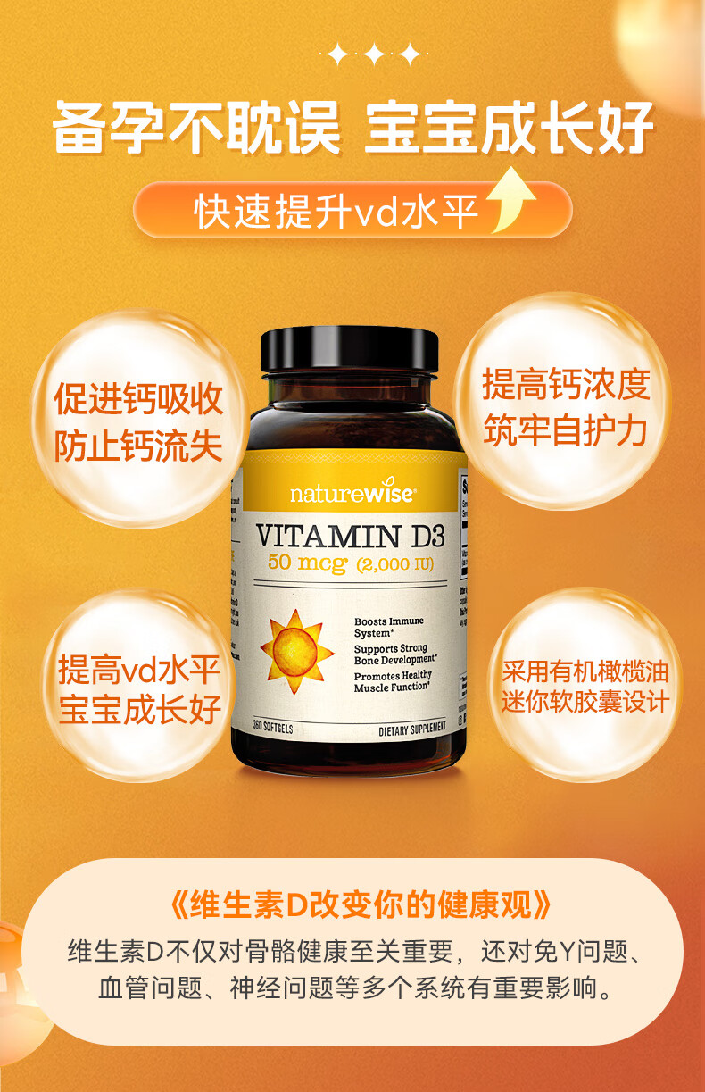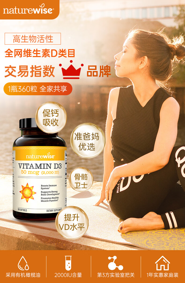 naturewise阳光瓶2000iu活性25羟基维生素D3成人孕妇软胶囊vd3补钙美国进口 (1瓶装)2000iu成人/孕期/青少年,360粒