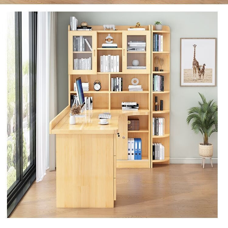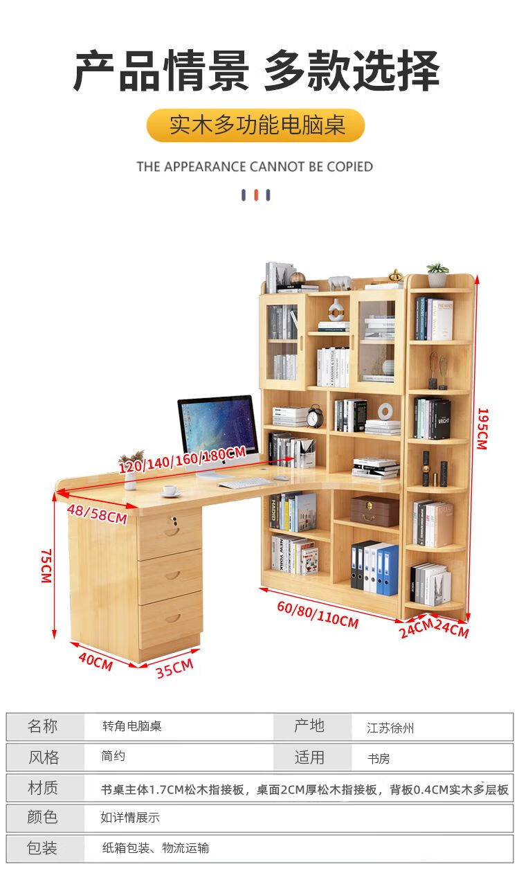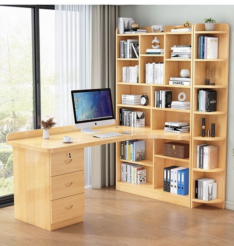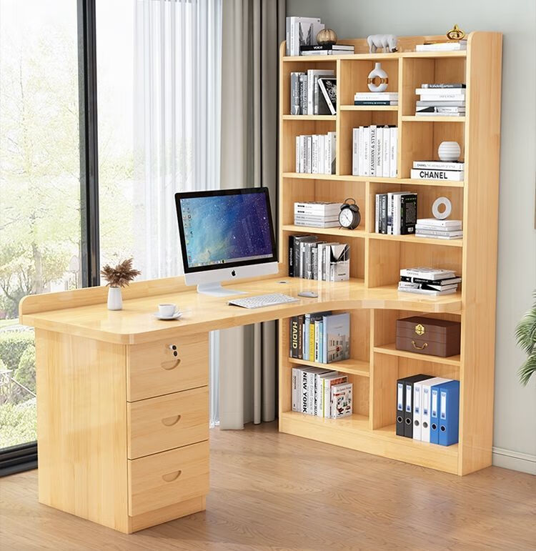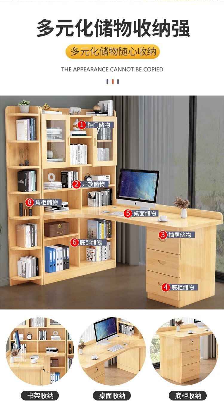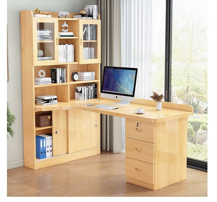 弘星隆实木转角书桌书架一体组合卧室儿童学习写字桌简约台式办公电脑桌 120*60无玻璃门 无移门