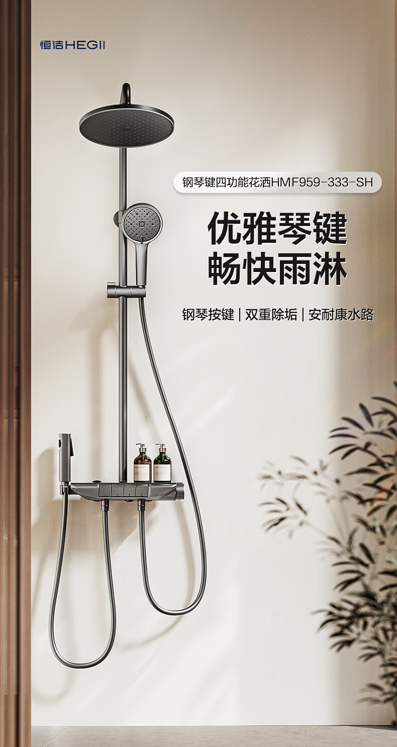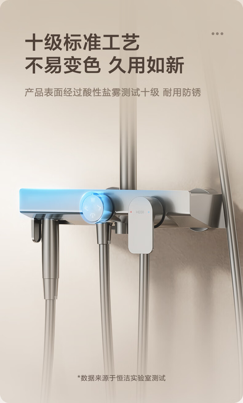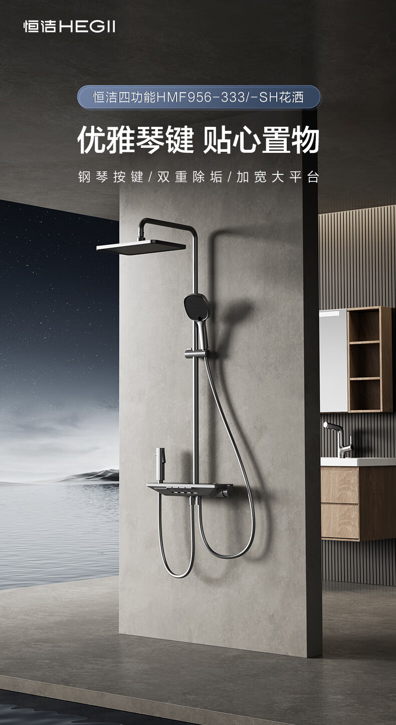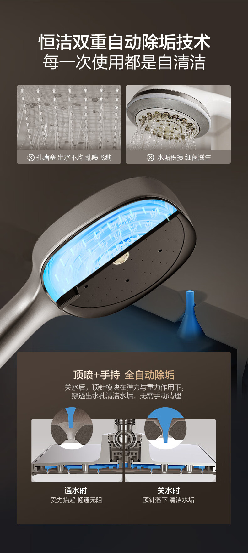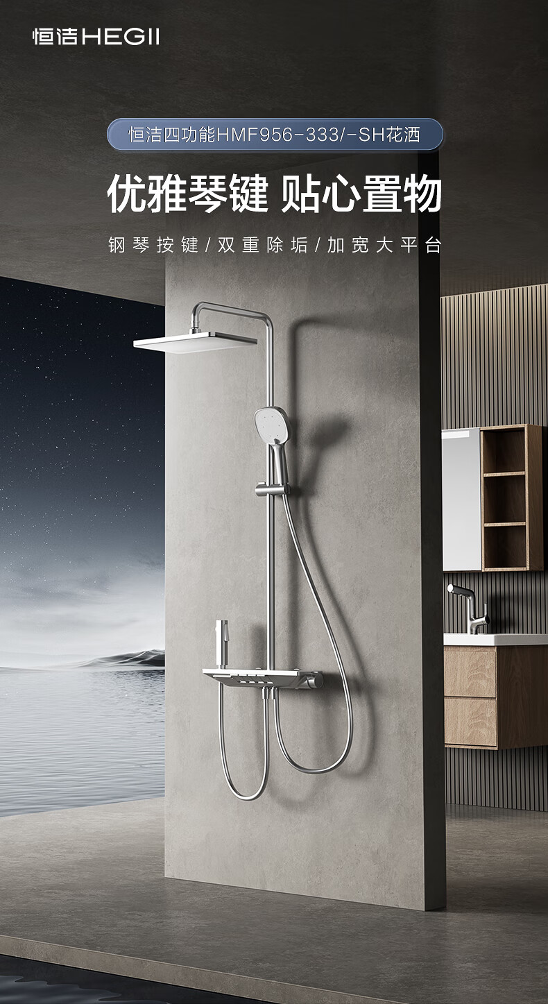 恒洁(HEGII) 淋浴花洒套装 智能除垢大顶喷置物平台多功能可升降花洒全套 【自动除垢方顶喷-银色】HMF936-333