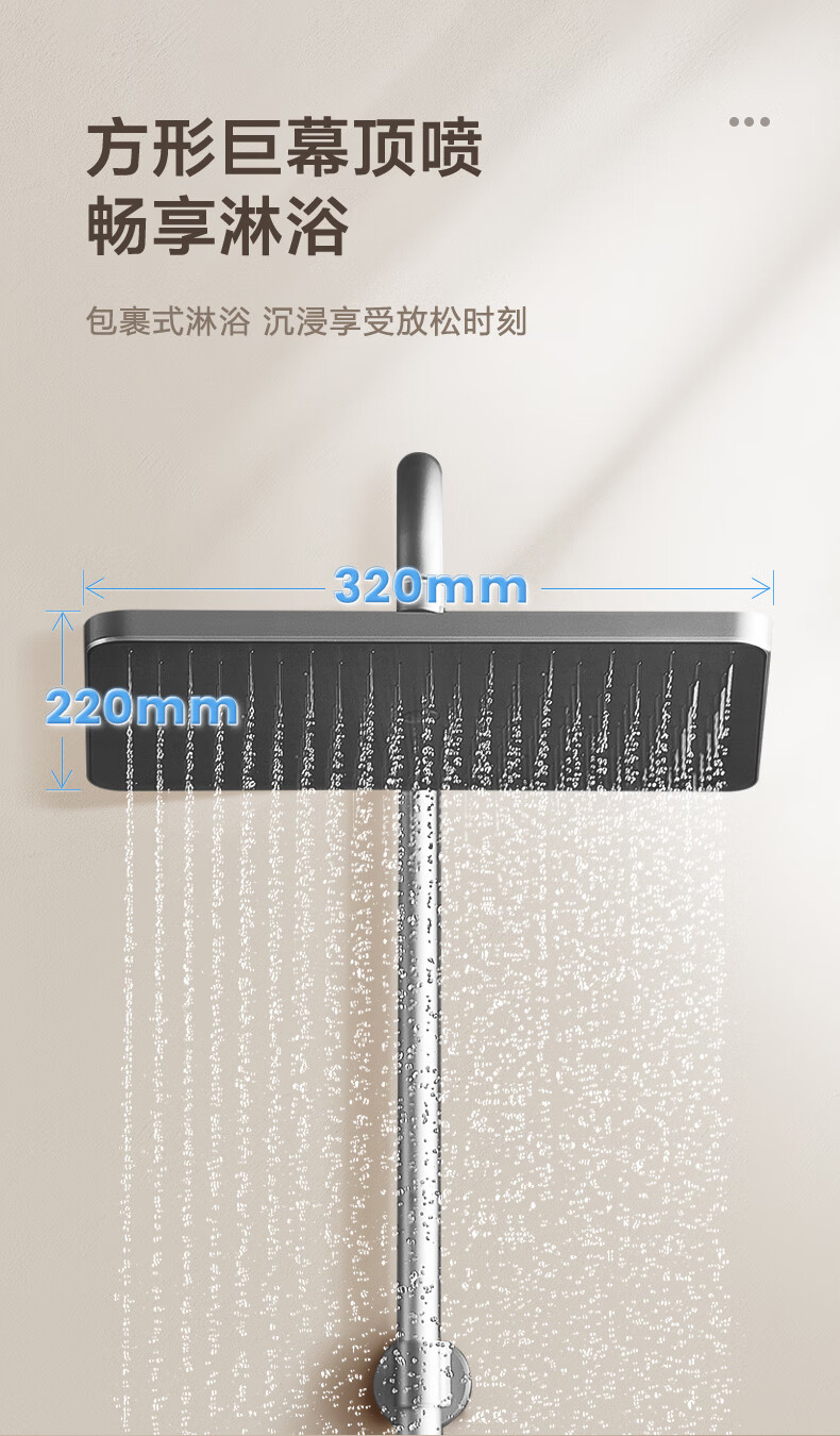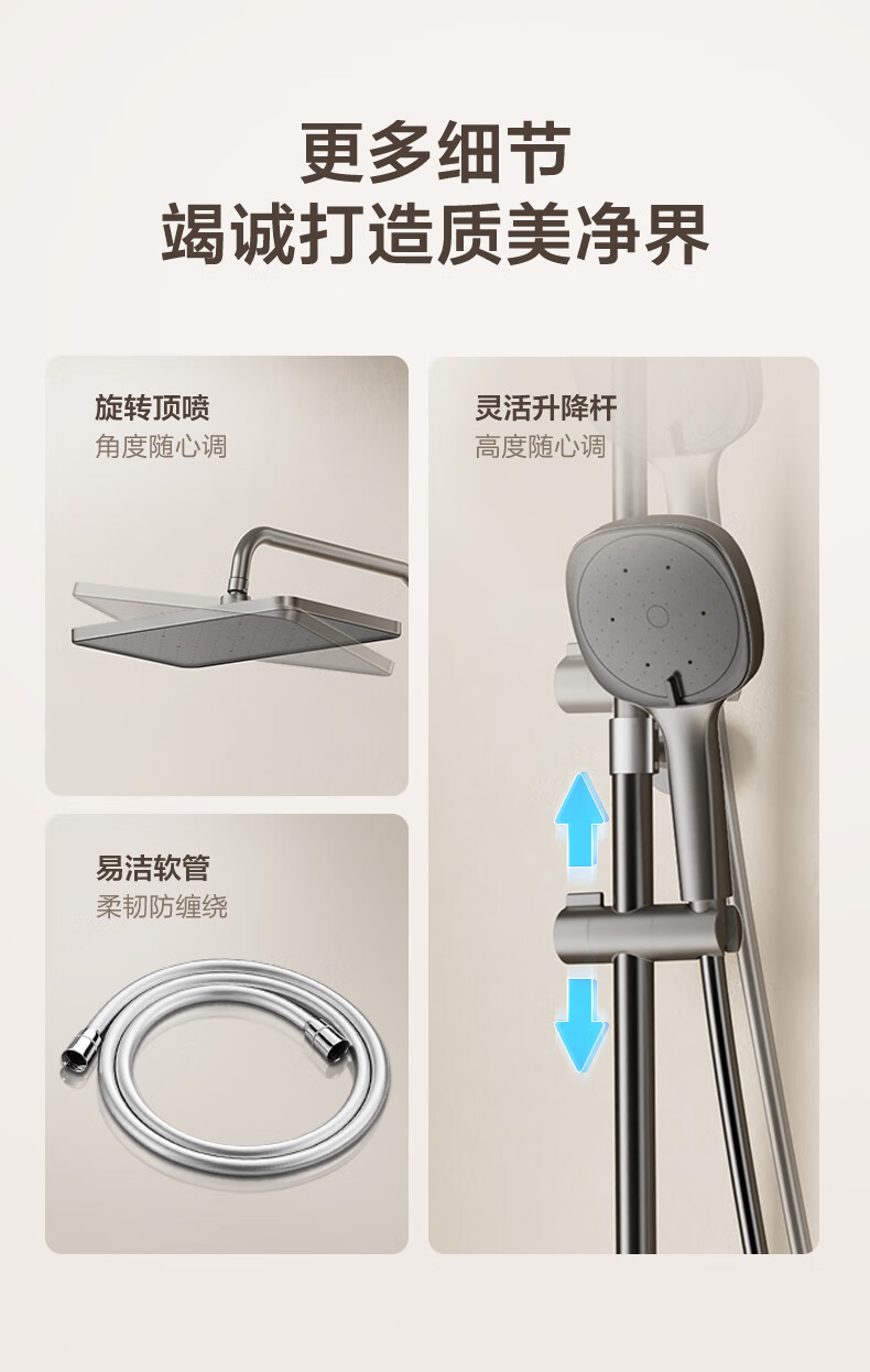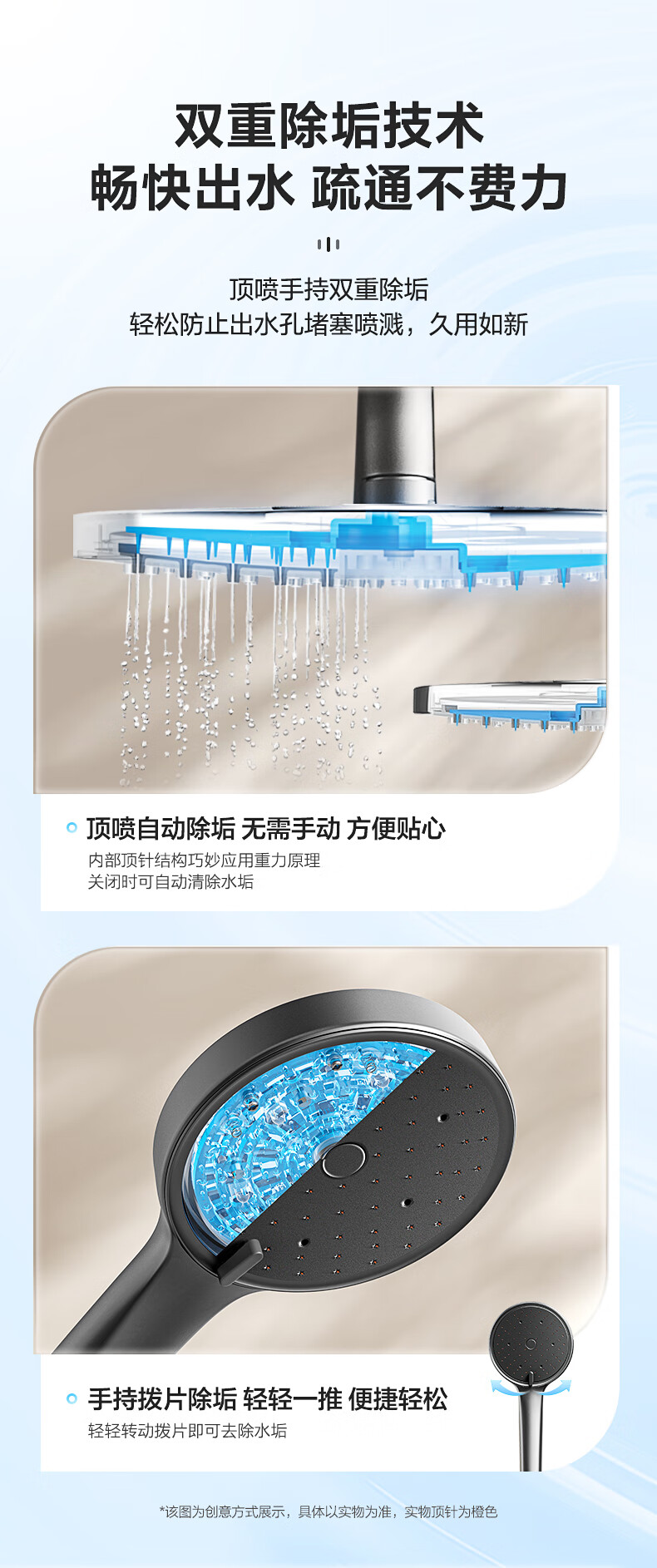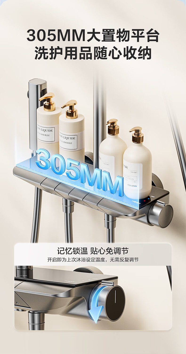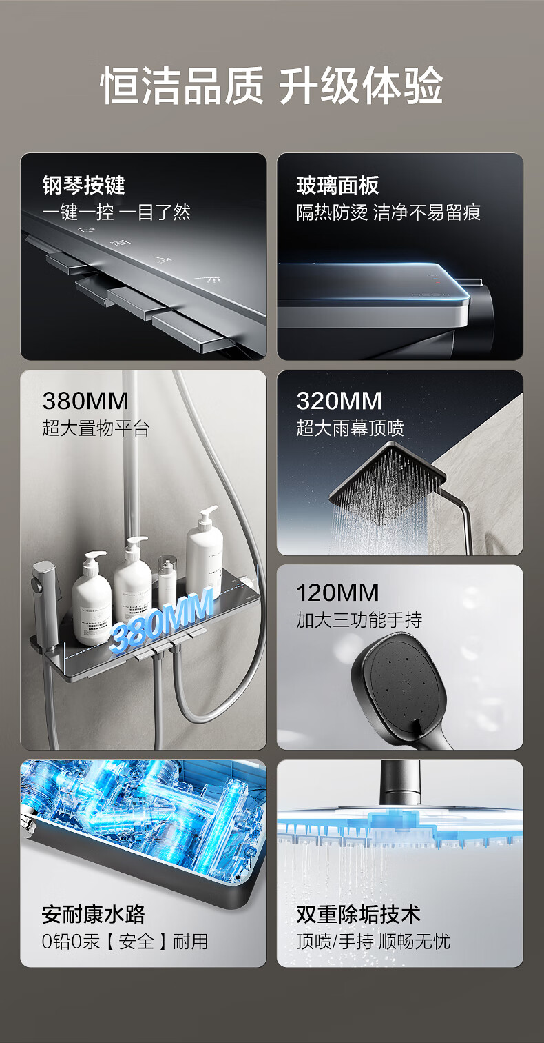 恒洁(HEGII) 淋浴花洒套装 智能除垢大顶喷置物平台多功能可升降花洒全套 【自动除垢方顶喷-银色】HMF936-333