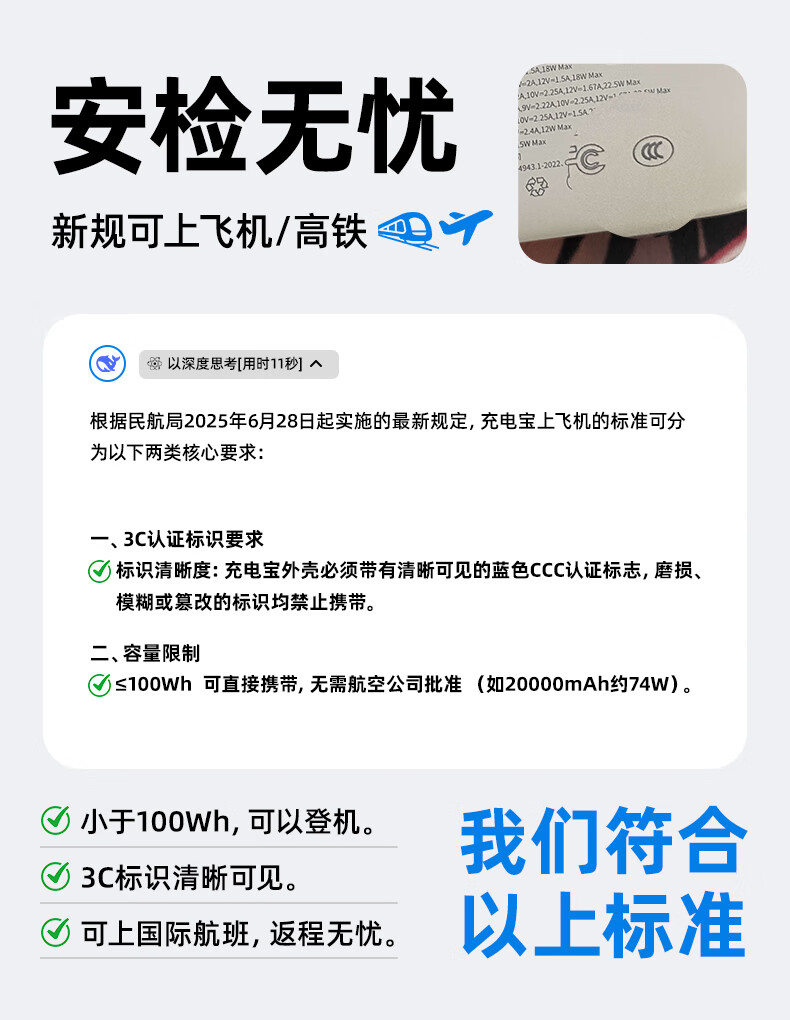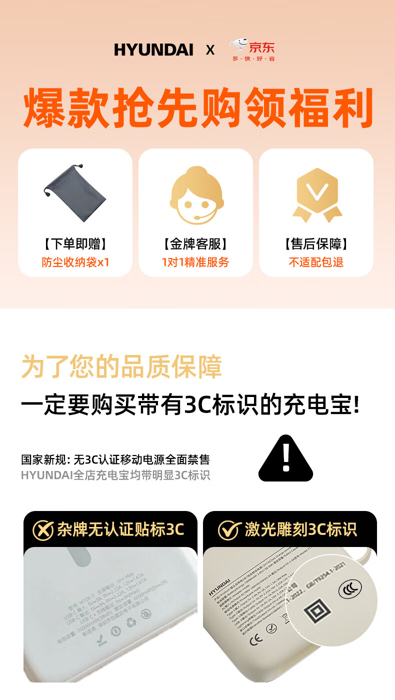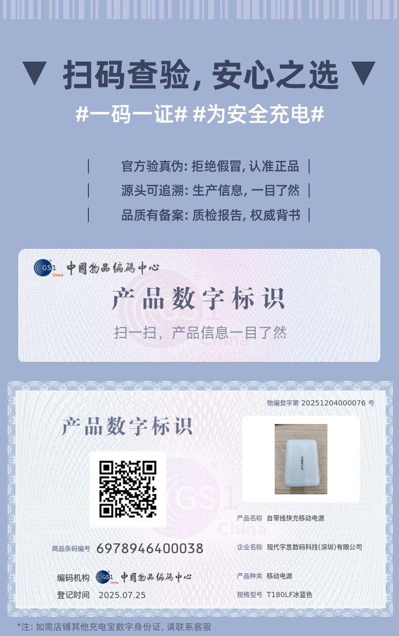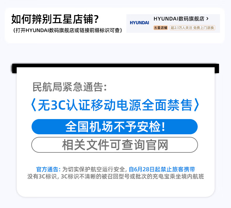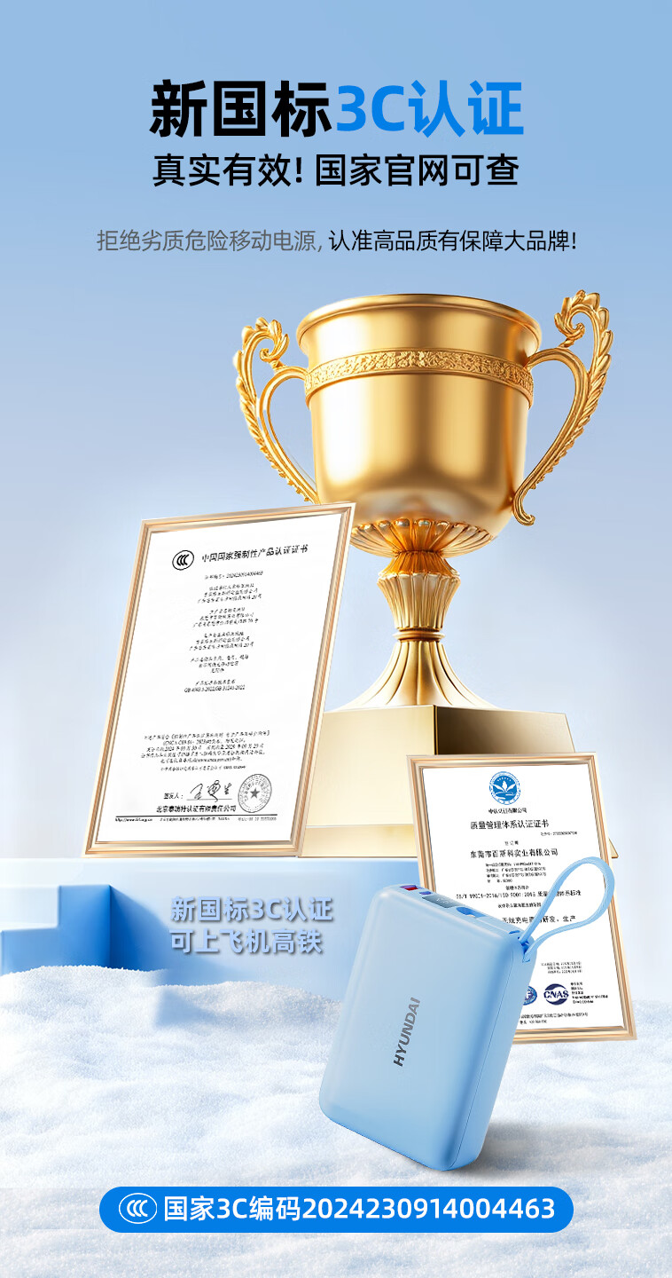 HYUNDAI现代充电宝20000毫安3c认证可带上飞机超大容量移动电源便携自带线超级快充22.5W国标3c认证小巧 蓝色丨20000mah丨22.5W双线快充