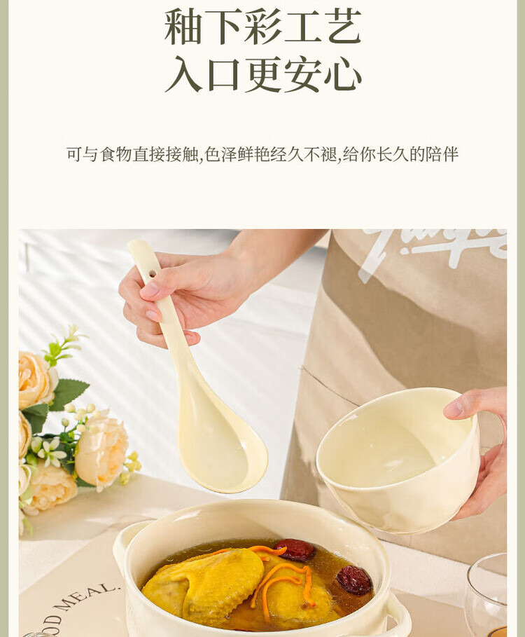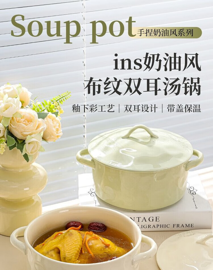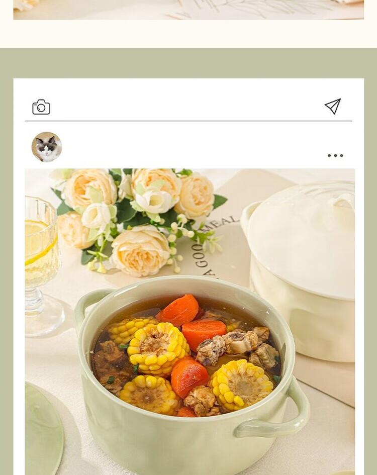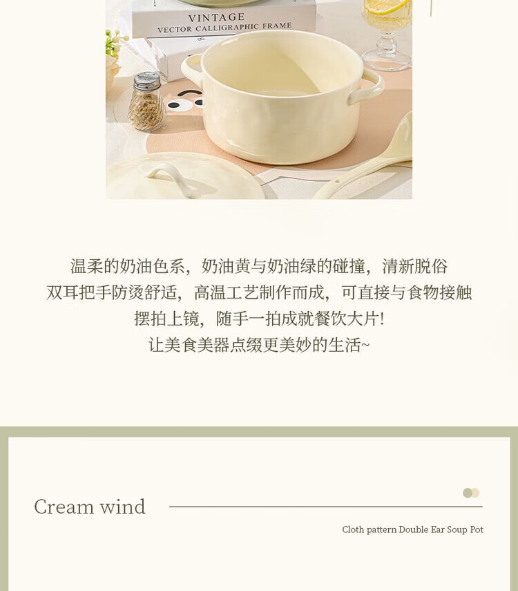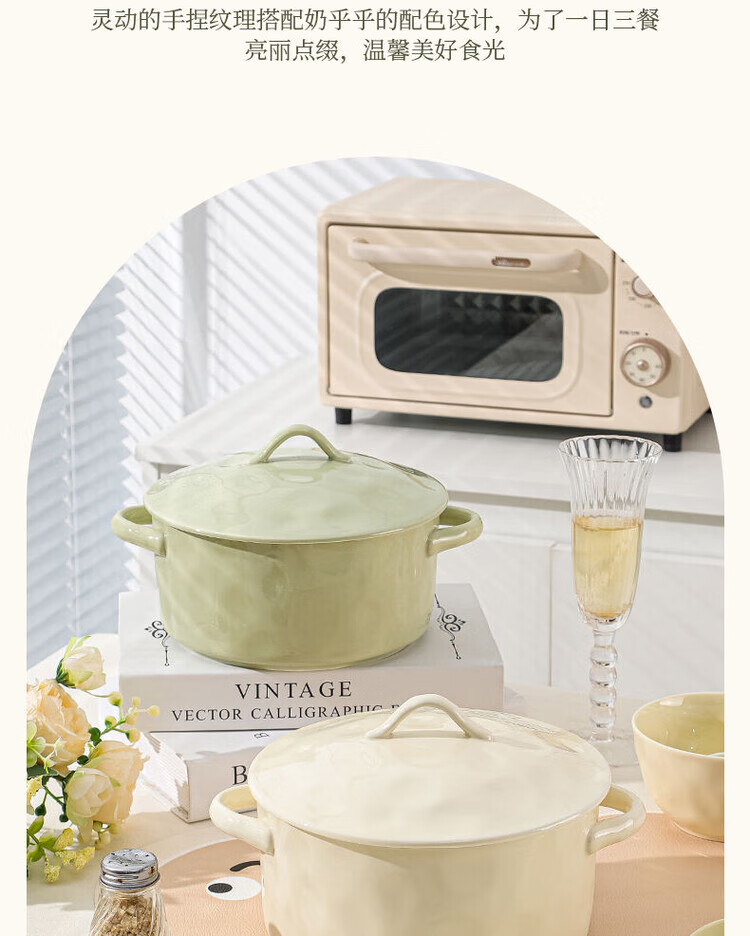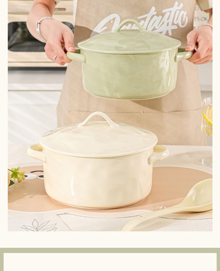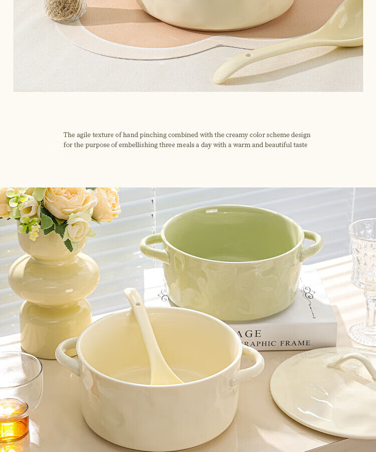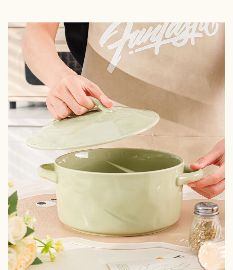 简漾奶油风大碗高颜值轻奢陶瓷双耳汤碗家用带盖大容量酸菜鱼煲汤碗 奶绿/7.5英寸 1cm