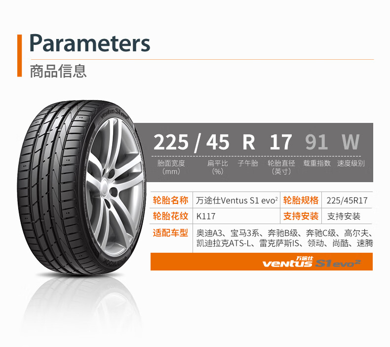韩泰(Hankook)汽车轮胎 225/45R17 91W K117 原配奥迪A3/高尔夫/朗逸/明锐