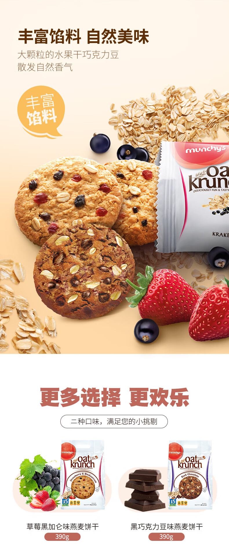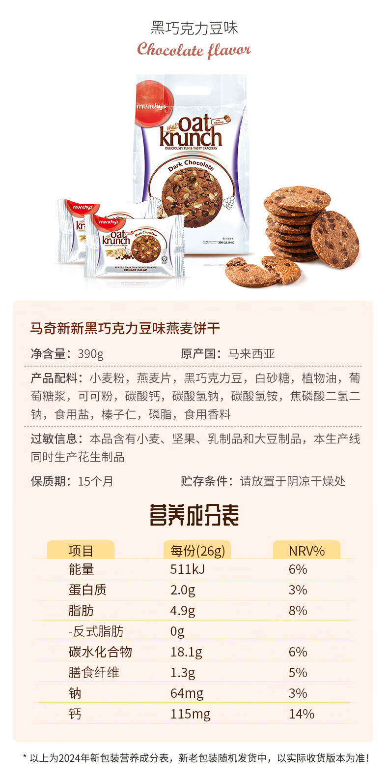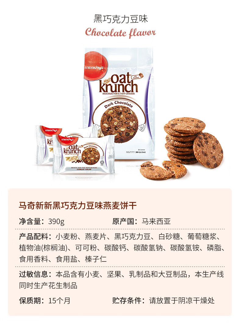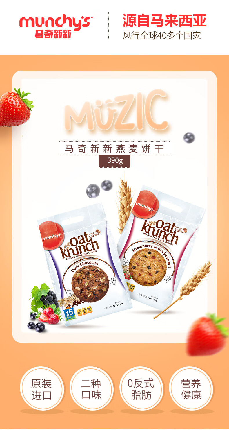 马奇新新进口黑巧克力豆燕麦饼干休闲零食粗粮代餐下午茶390g独立小包