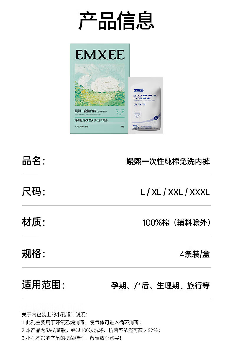 嫚熙(EMXEE)5A抗菌孕妇产妇一次性内裤旅游出差月子便携灭菌免洗纯棉内裤 7盒 XXXL(建议150斤以上)