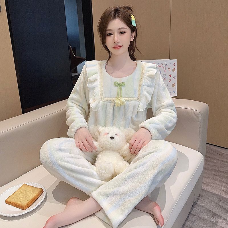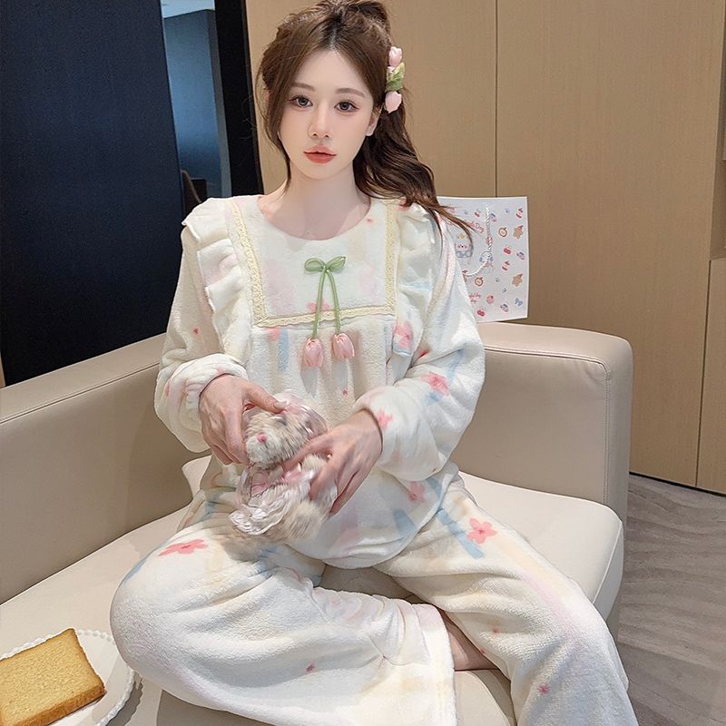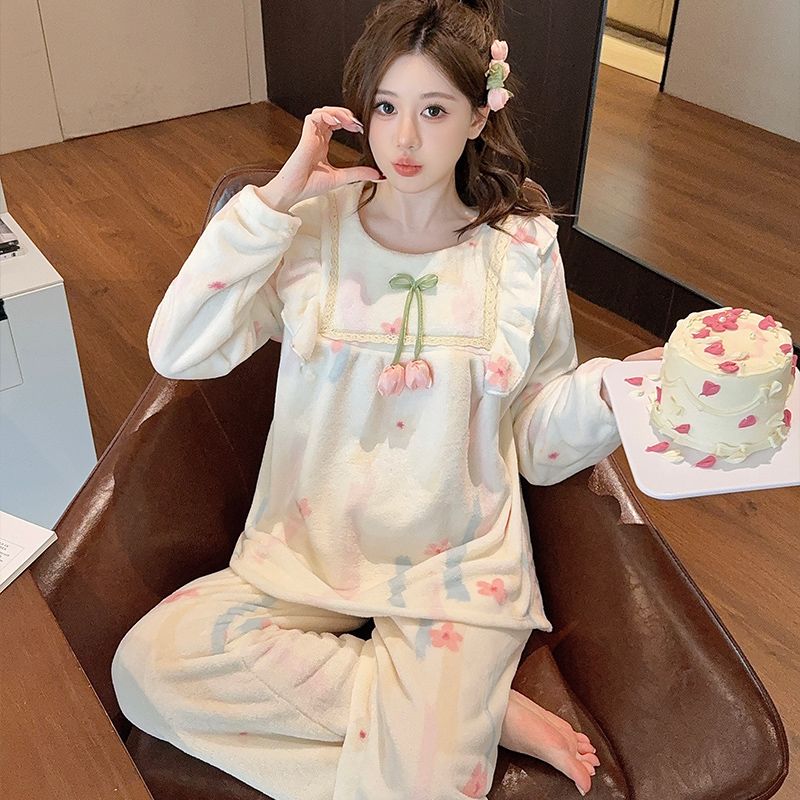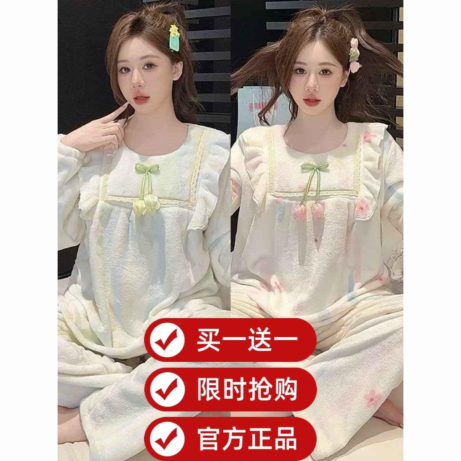 【买一送一】法兰绒睡衣女家居服套装可外穿秋冬长袖长裤加厚加绒