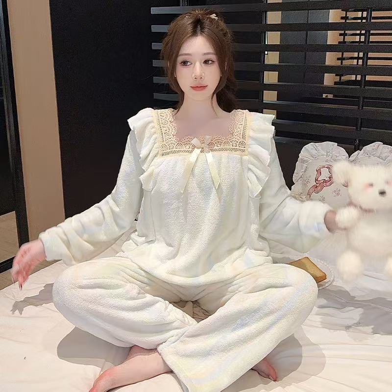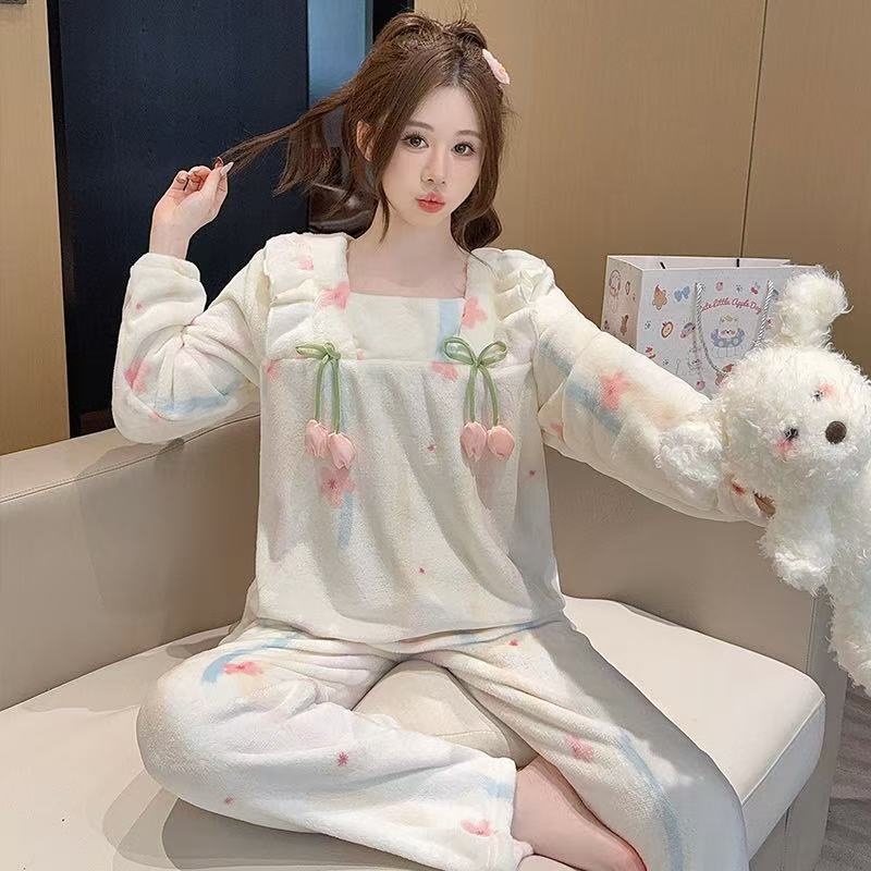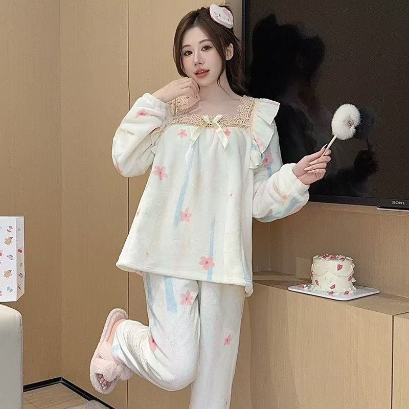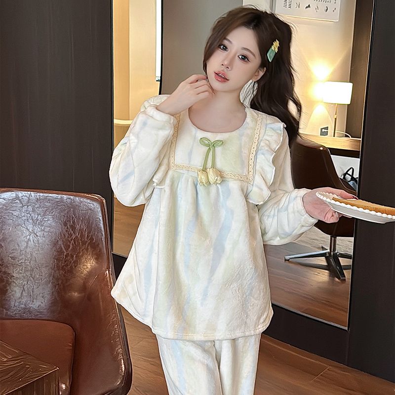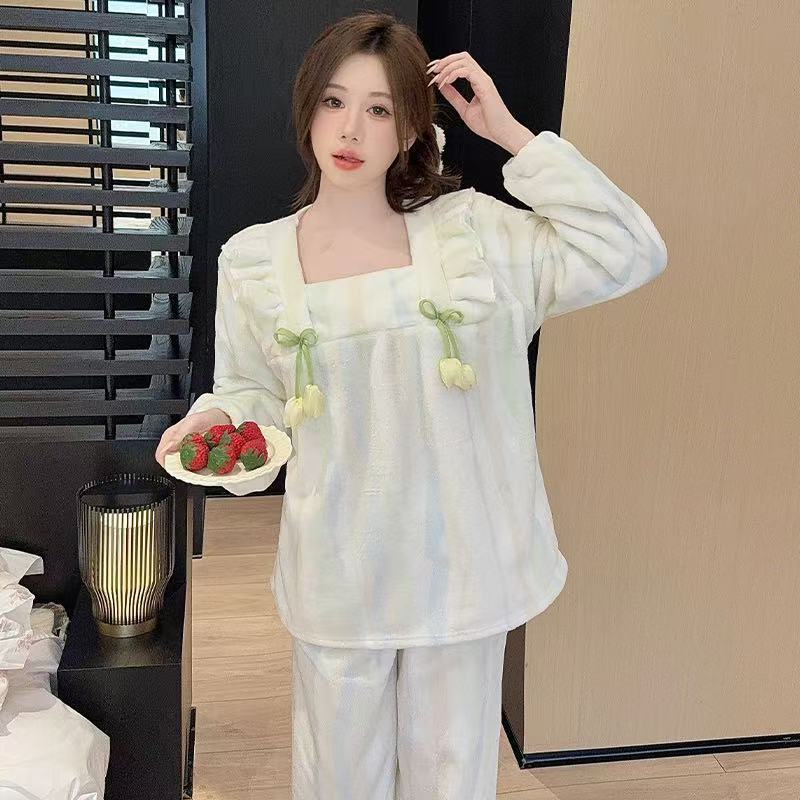 【买一送一】法兰绒睡衣女家居服套装可外穿秋冬长袖长裤加厚加绒